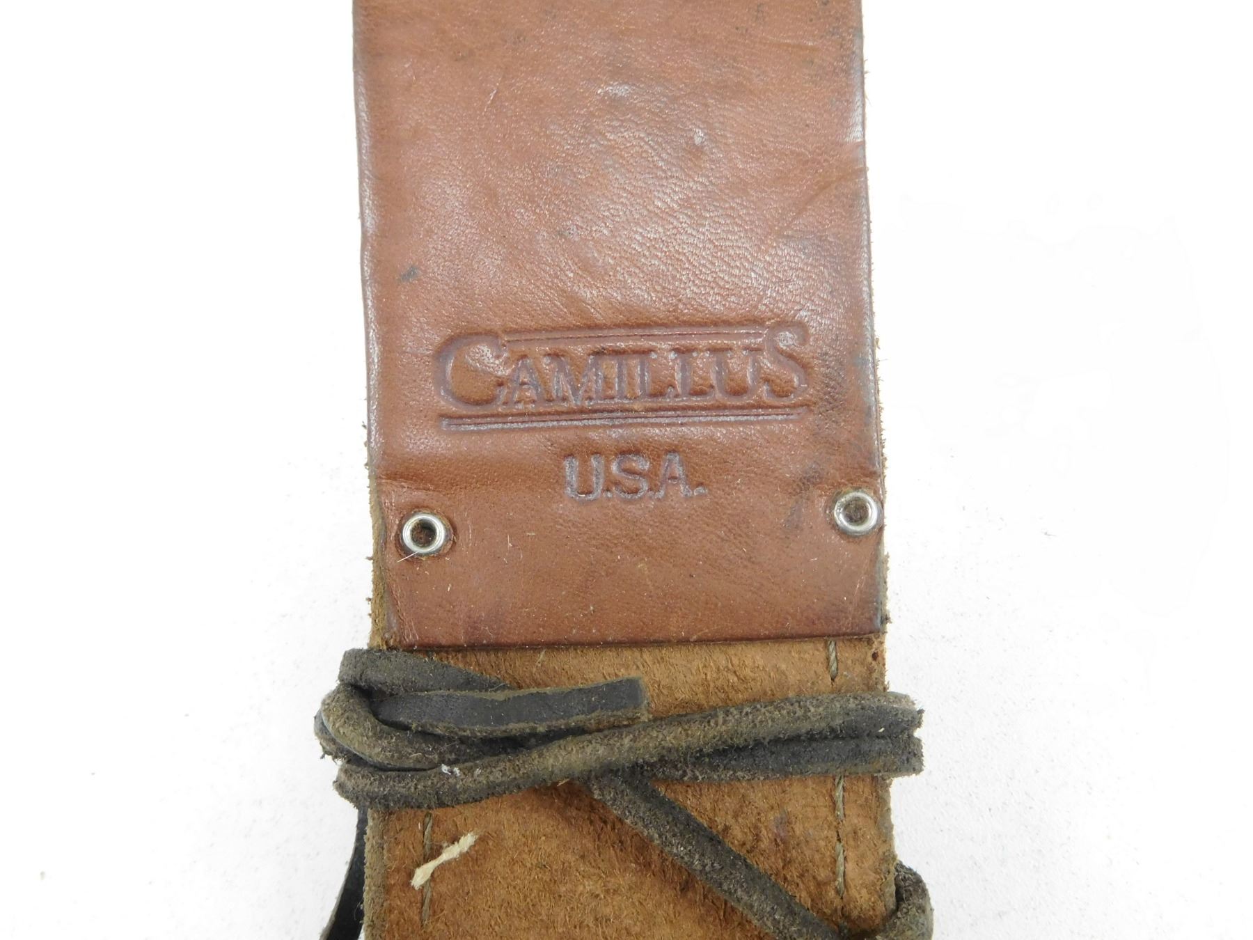 U.S WWII FIGHTING KNIFE WITH SHEATH , RICASSO MARKED R.H. PAL- 33, LEATHER SHEATH STAMPED CAMILLUS U.S.A.