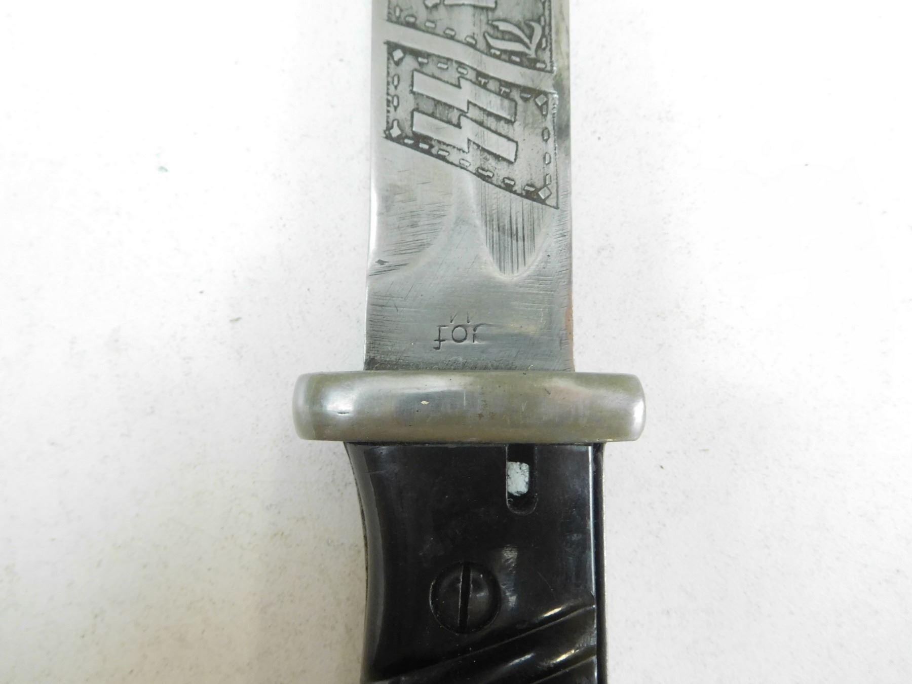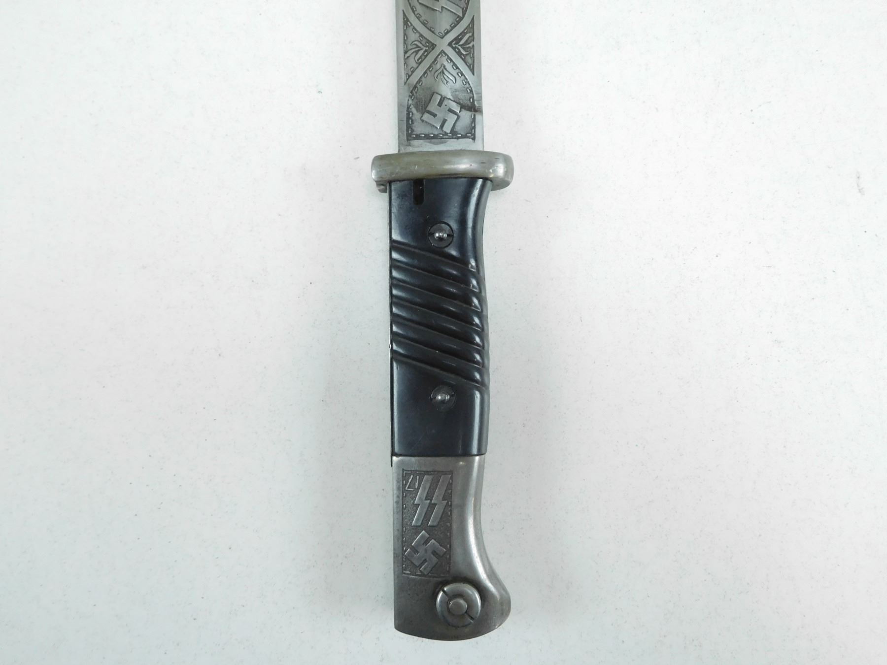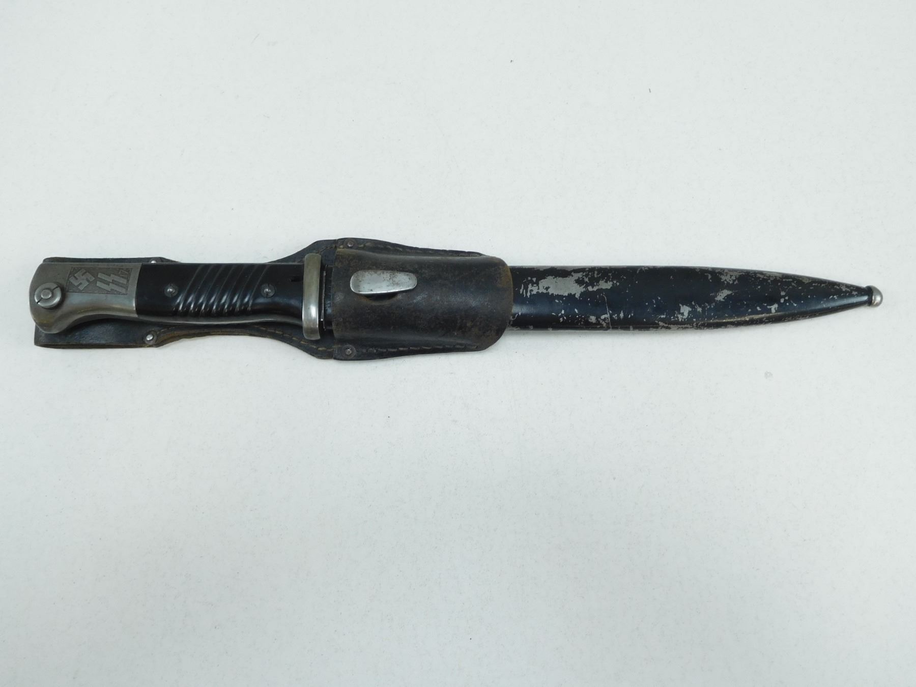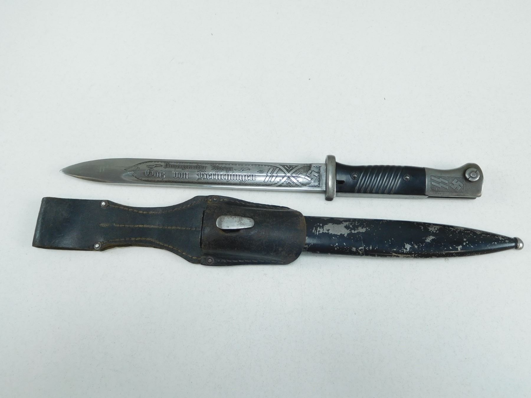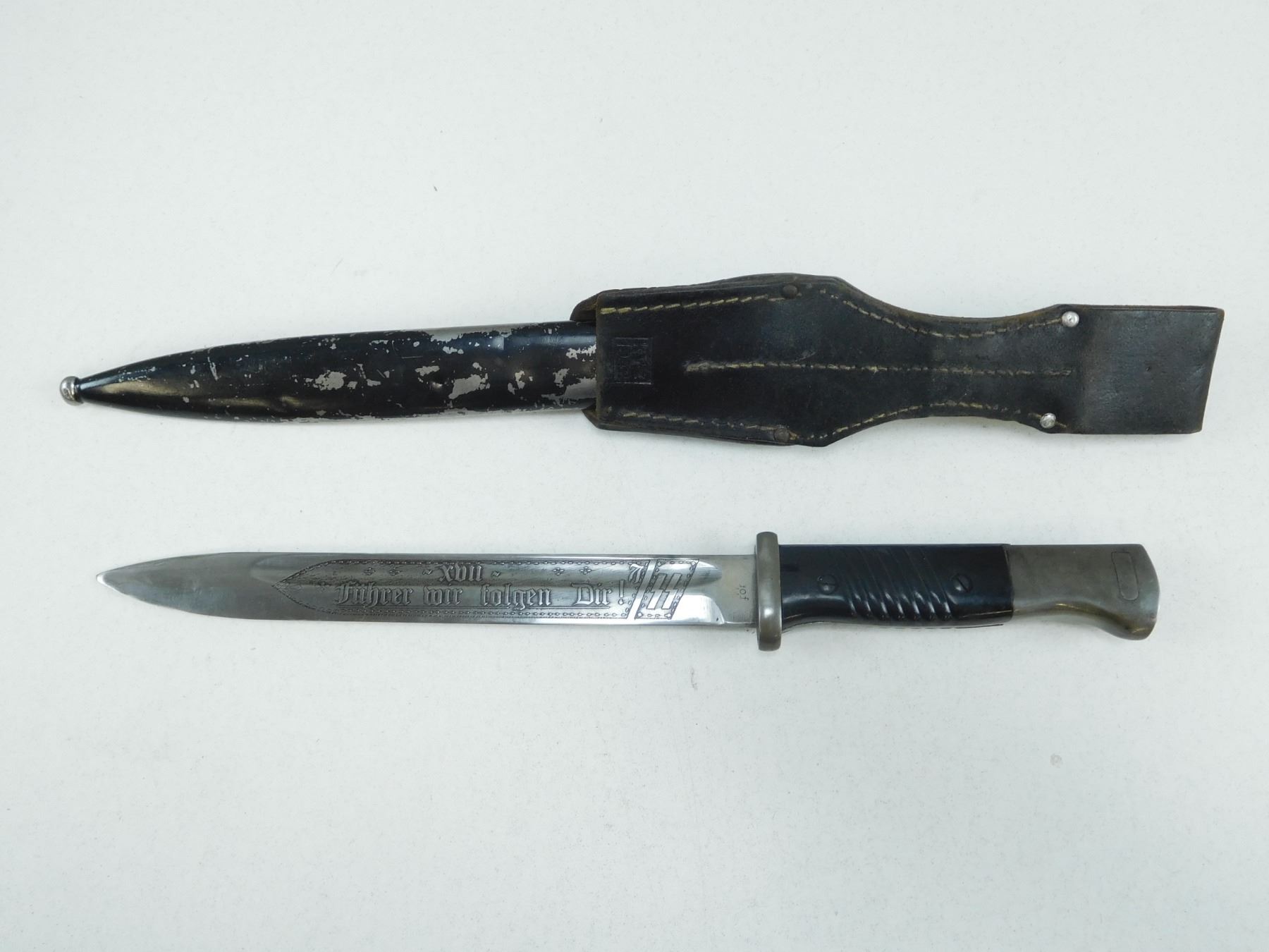 GERMAN WWII BAYONET WITH SCABBARD , CARL EICKHORN WAFFENFABRICK SOLINGEN, POMMEL MARKED SS 17, BLADE ETCHED PANZERGRENADIER DIVISION, CVL- METAL SCABBARD LOCKET MARKED 42 COL & 9811 B WKC WAAFFENFABRICK G.M.B.H. SOLINGEN-WALD POSTFACH 29, WITH WAFFIN MARK ON TIP, WITH LEATHER FROG STAMPED KVZ 1942 TIMMERMAN & WOLLET, KOFFERFABRIK HEIDELBERG