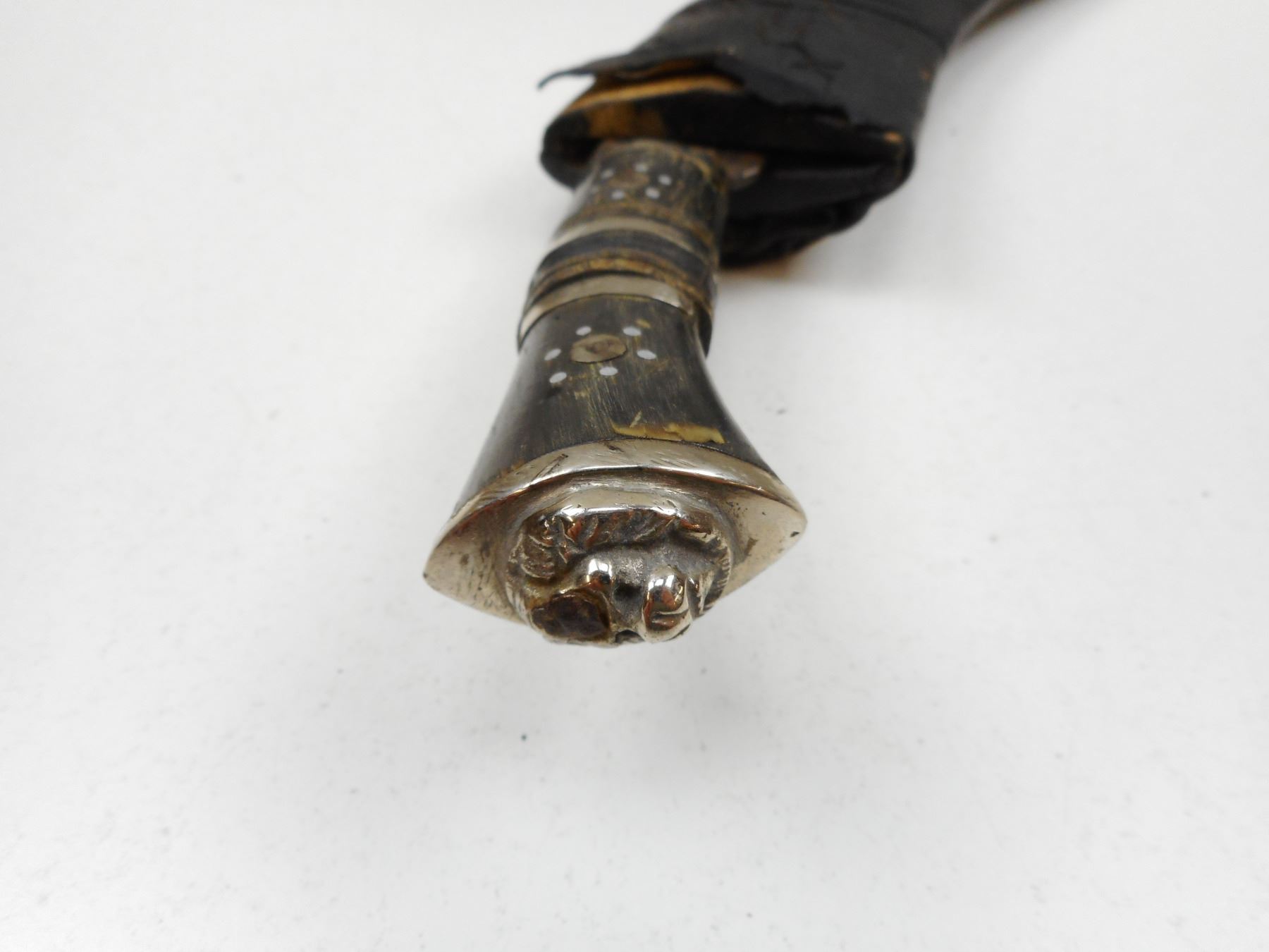 INDIAN KUKRI KNIFE WITH SHEATH , BLADE IS MARKED INDIA WITH LION HEAD POMMEL & CRACKED LEATHER WRAPPED SHEATH