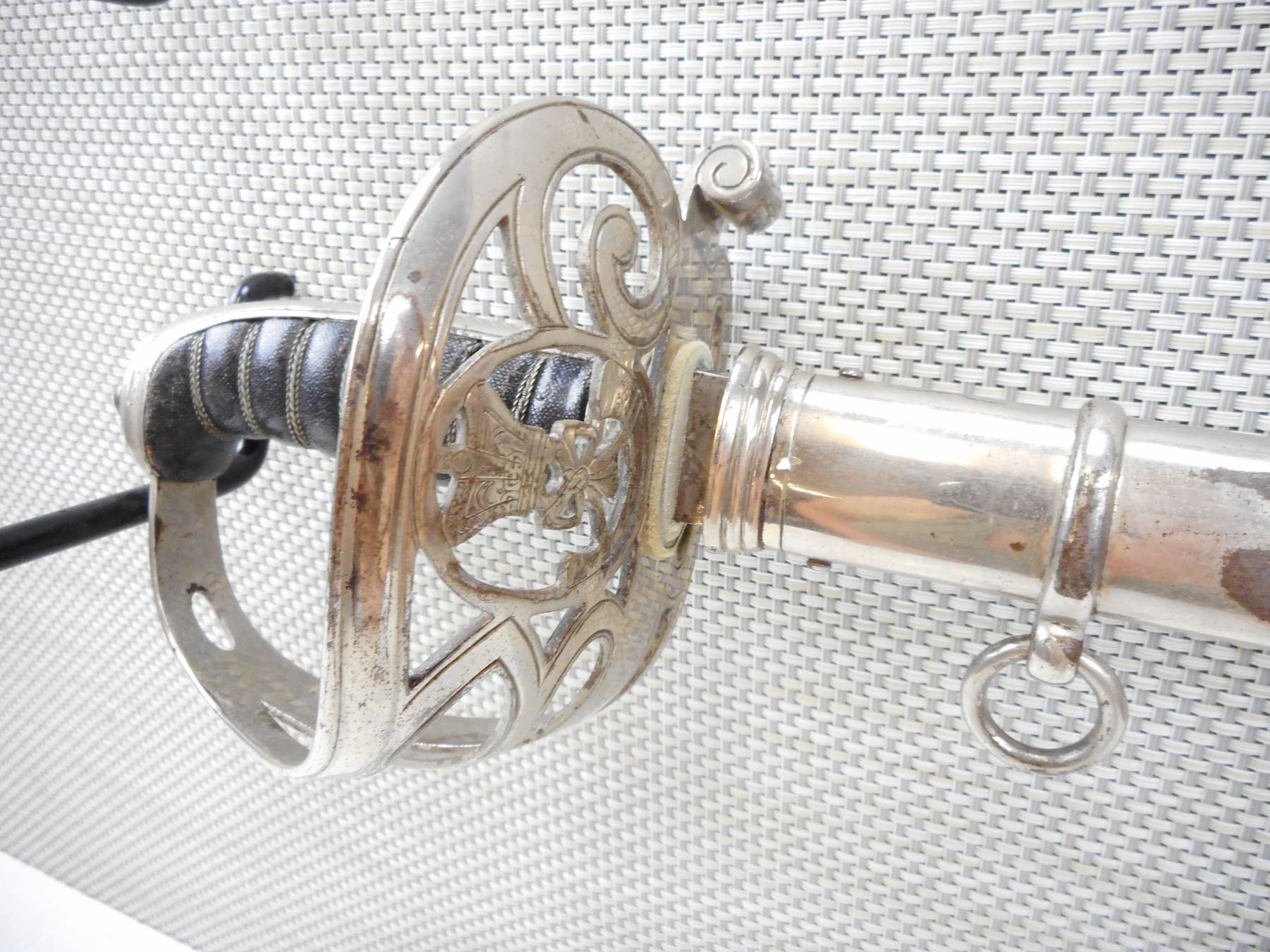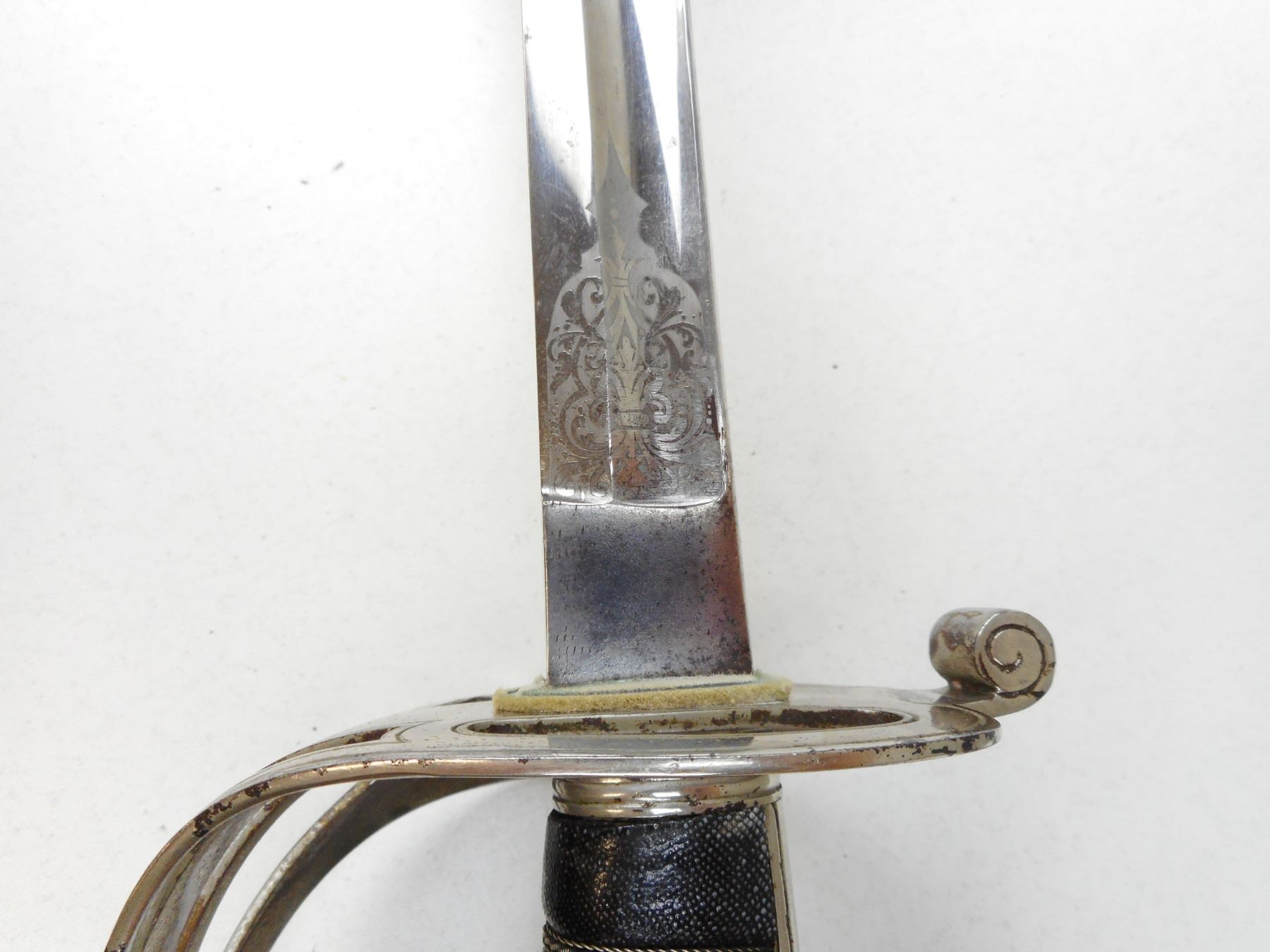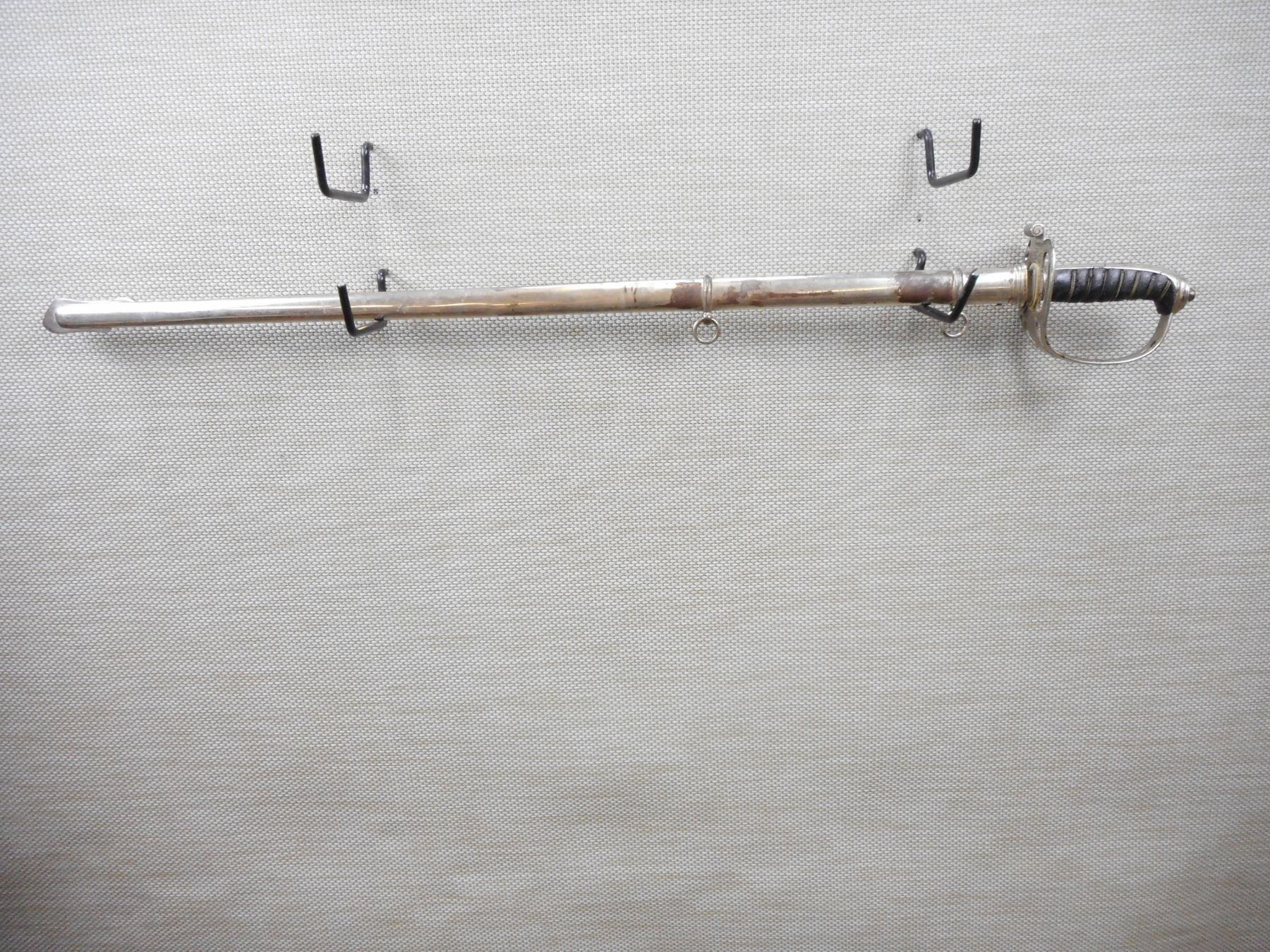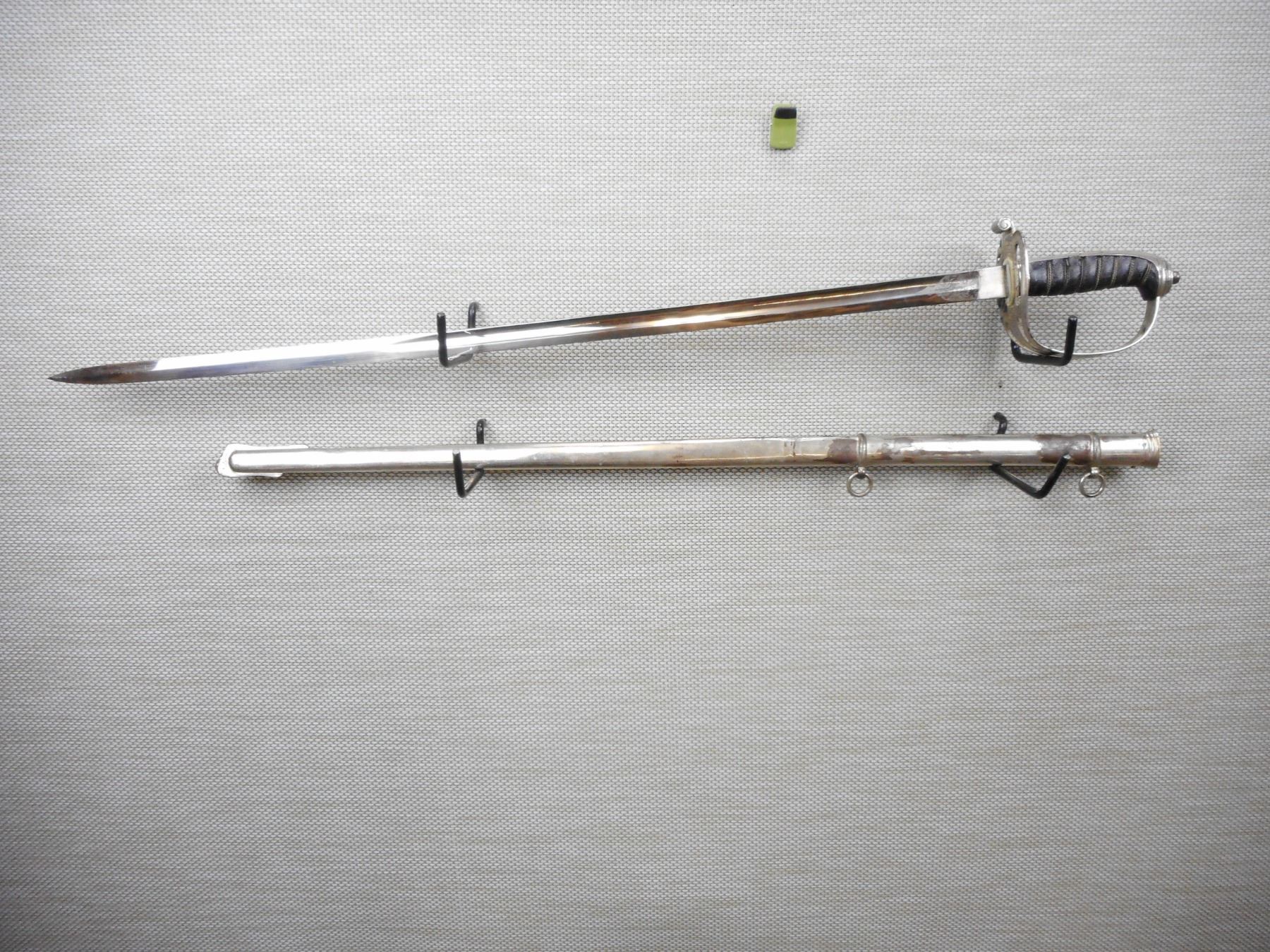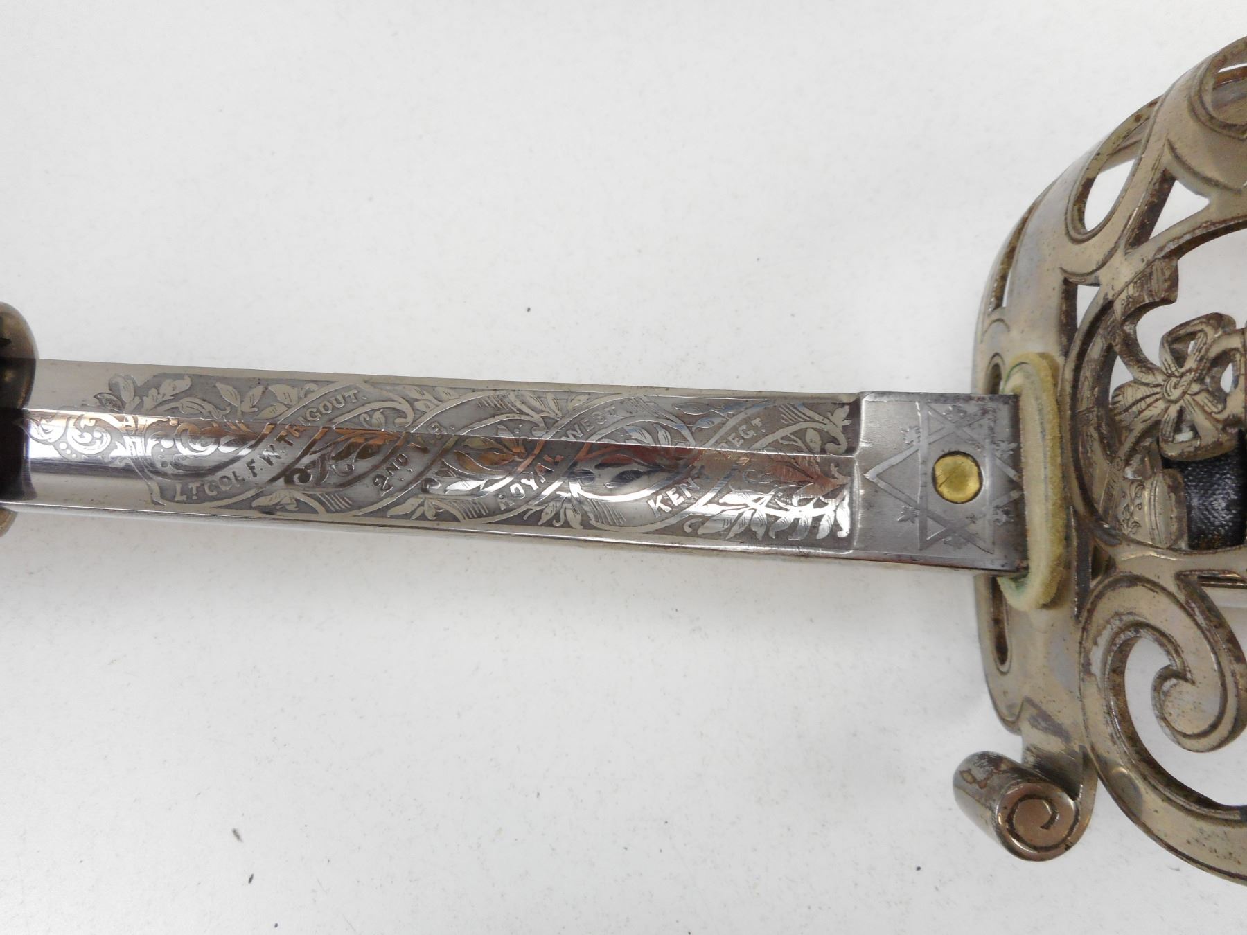 BRITISH ARMY OFFICER'S CEREMONIAL SWORD WITH SCABBARD , 32" ETCHED BLADE MARKED TO LT. COL. F.W.TRIGOUT, 2ND V.B. ROYAL WEST KENT REGT. WITH WILKINSON'S MARK ON RICASSO (MISSING HW IN CENTER) WITH STRINGED POWDERHORN & CROWN EMBLEM ON KNUCKLE GUARD, METAL SCABBARD