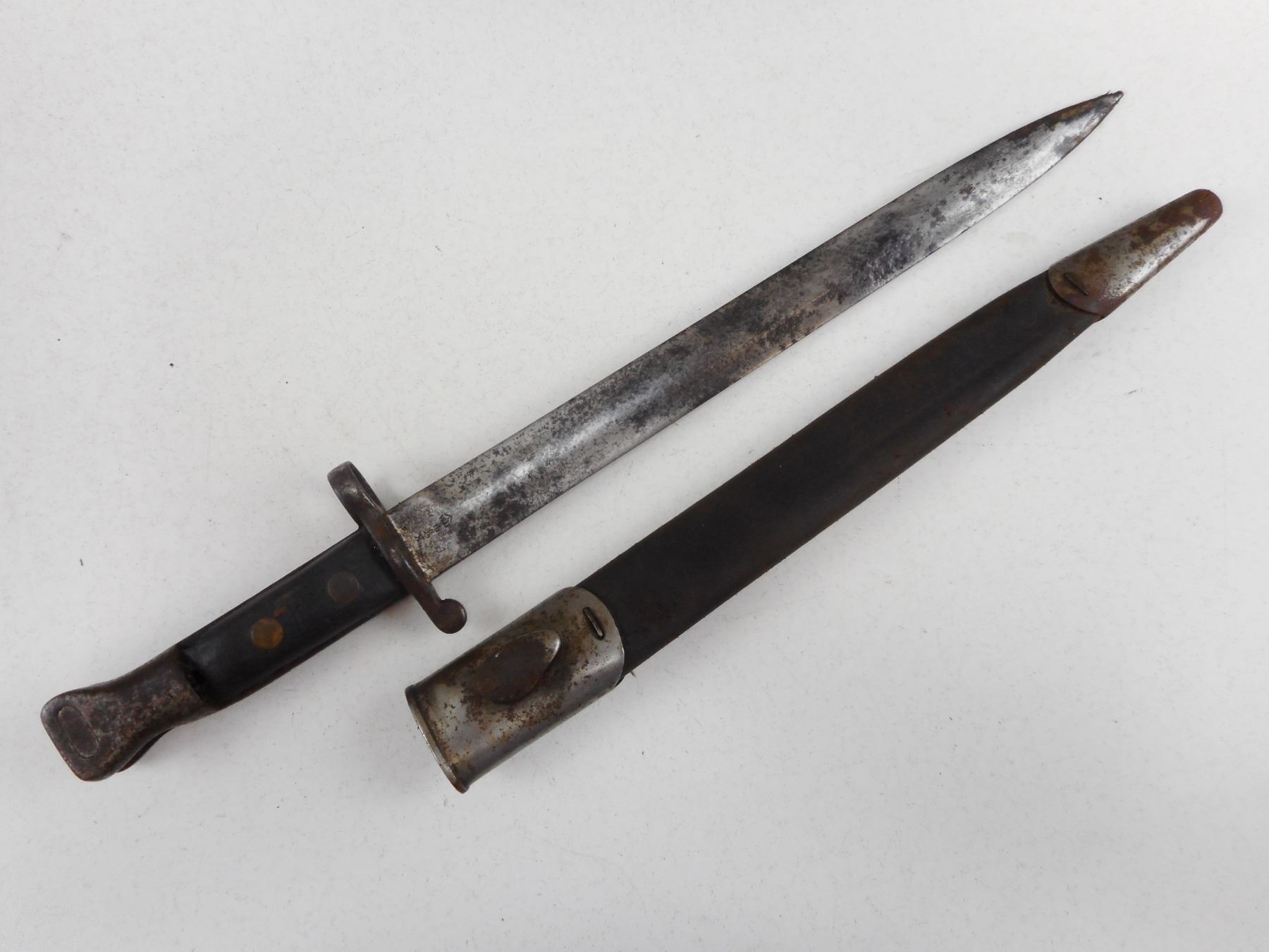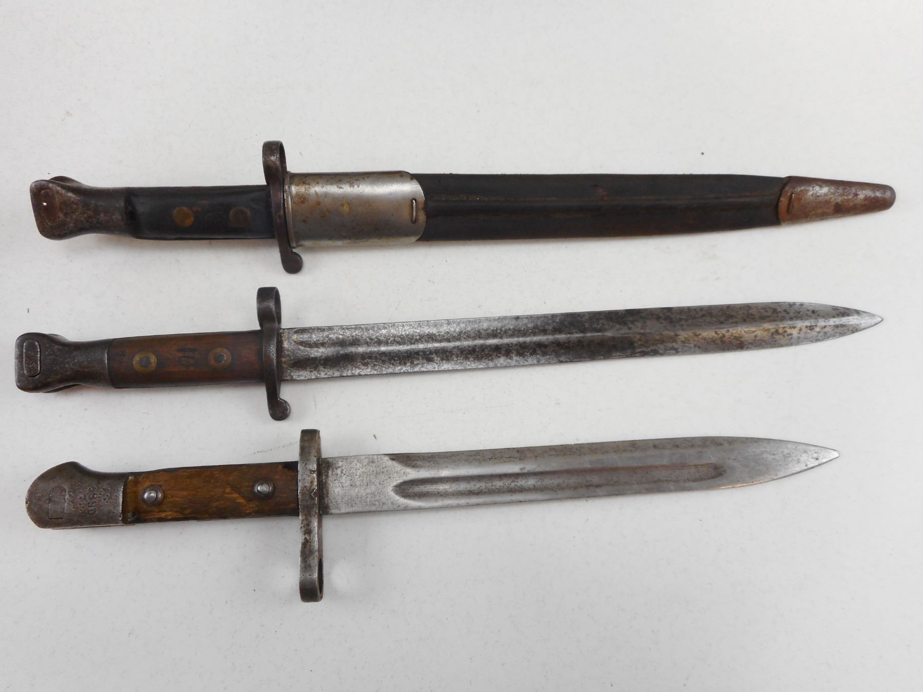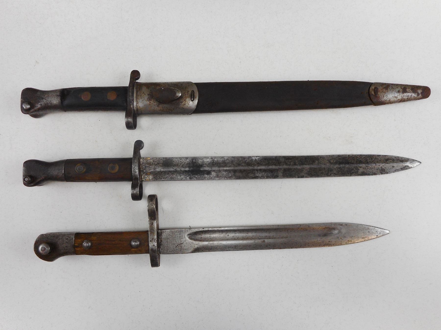 (1) UNKNOWN BAYONET ASSORTED SERIAL NUMBER ON POMMEL A8 FA & 8890, (2) LEE METFORD: (1) ASSORTED PARTIAL MARKING ON GRIP, NO SCABBARD, (1) WITH BRITISH PROOF MARKS W?D, 6/95 WITH LEATHER SCABBARD, LOT OF 3