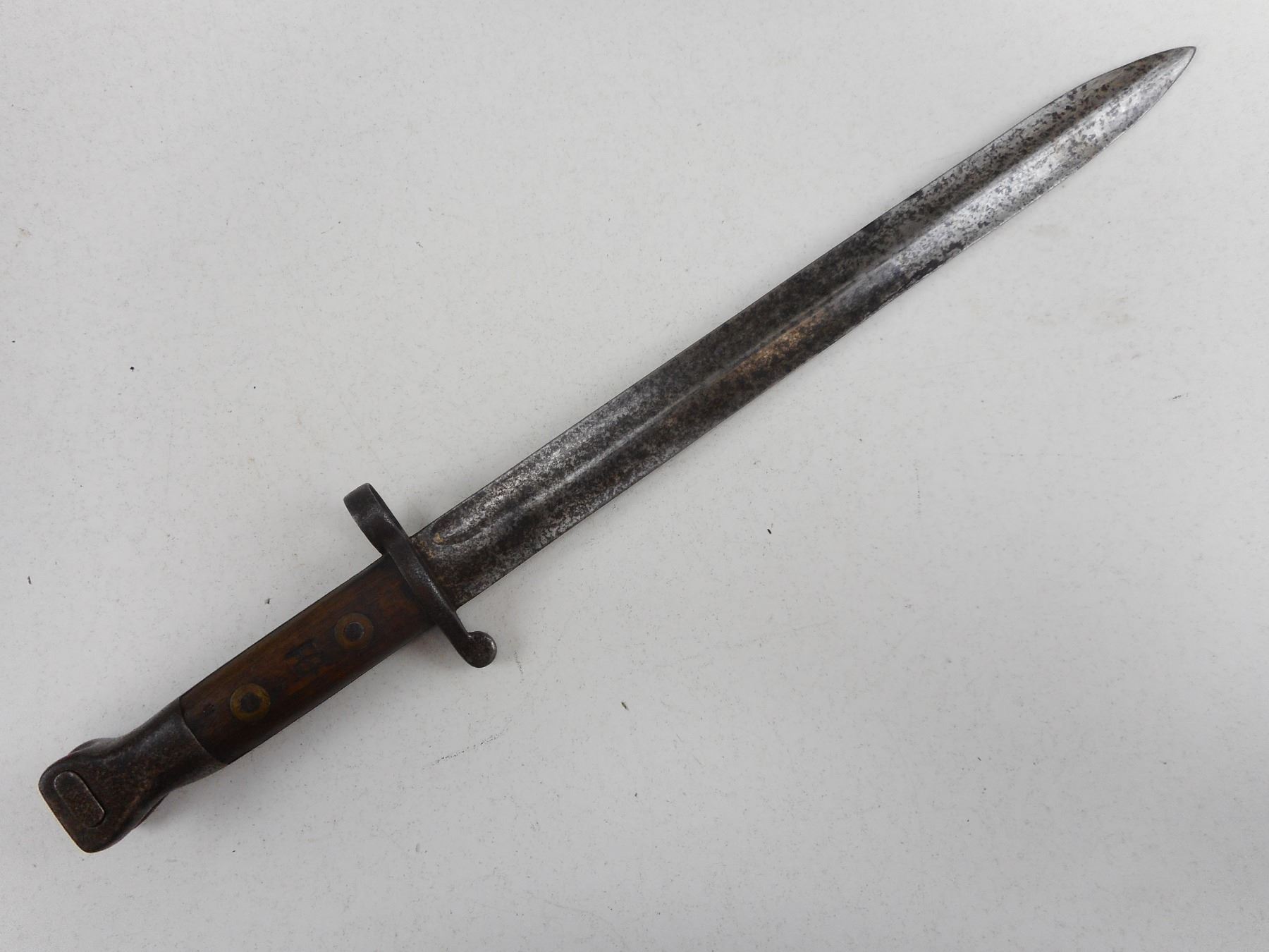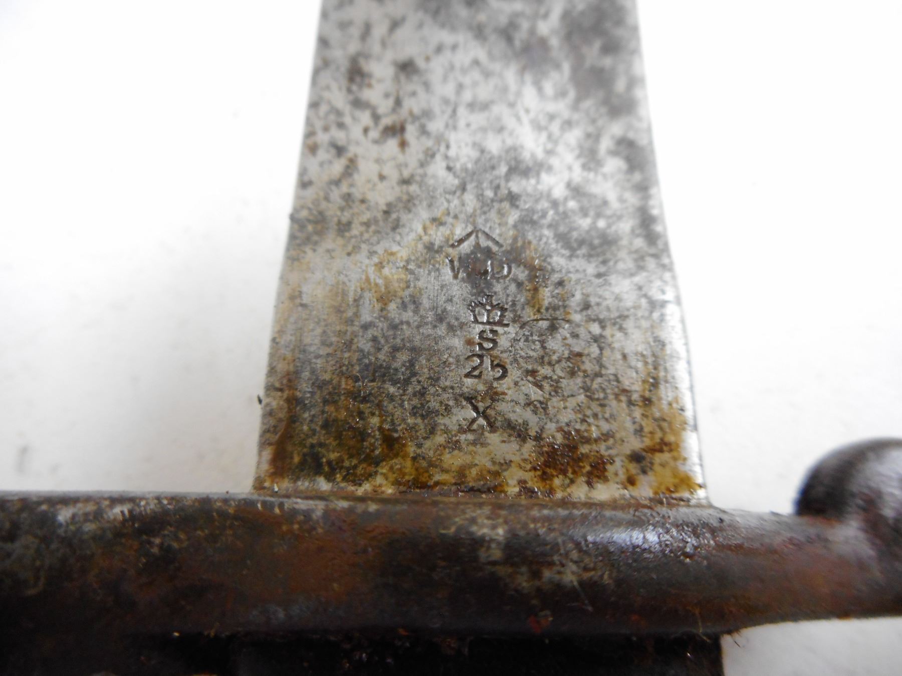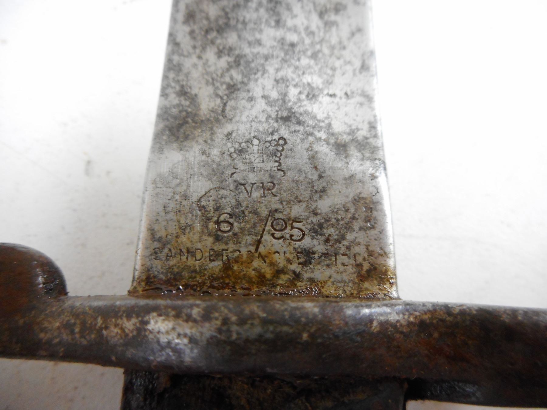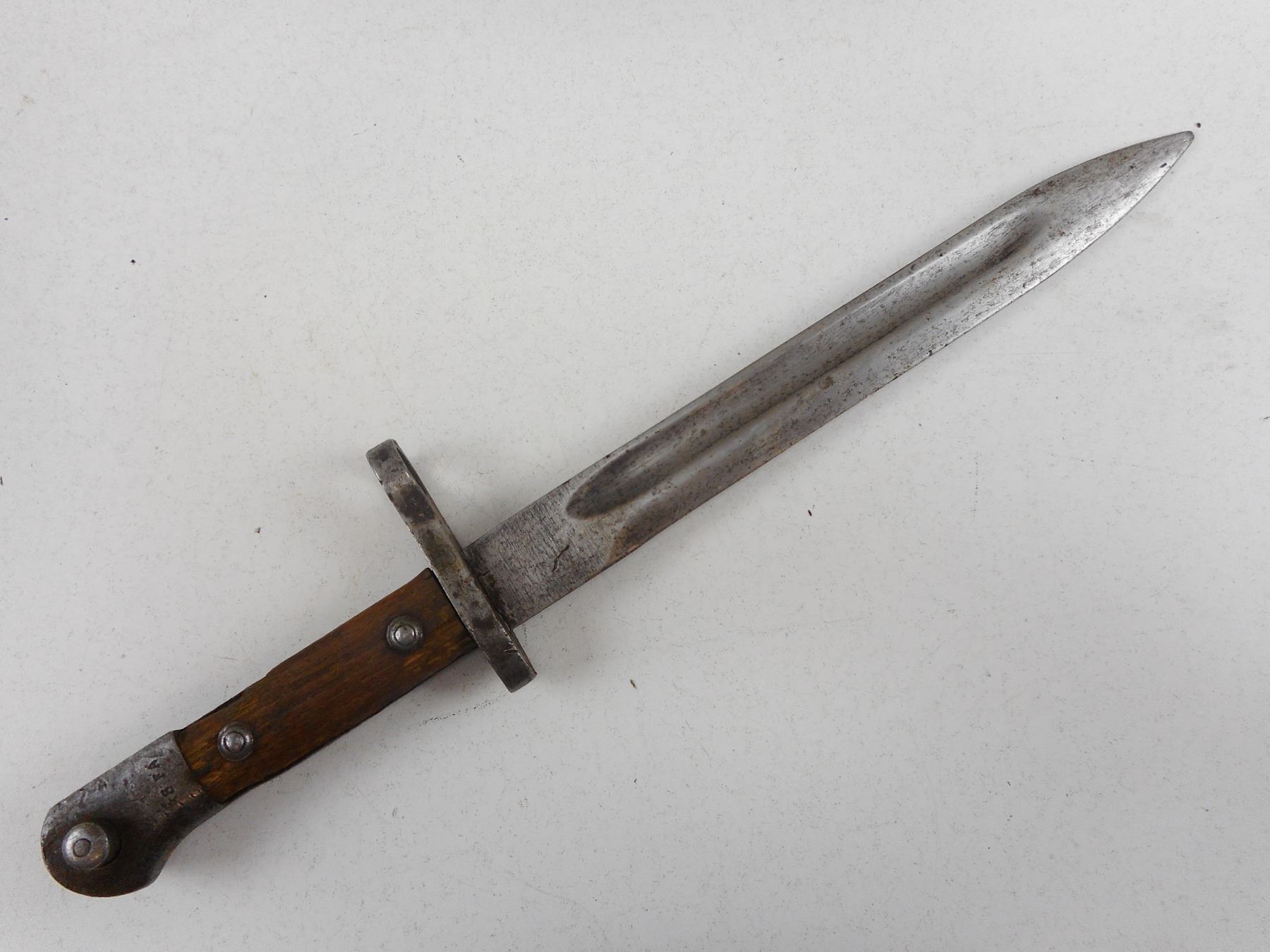 (1) UNKNOWN BAYONET ASSORTED SERIAL NUMBER ON POMMEL A8 FA & 8890, (2) LEE METFORD: (1) ASSORTED PARTIAL MARKING ON GRIP, NO SCABBARD, (1) WITH BRITISH PROOF MARKS W?D, 6/95 WITH LEATHER SCABBARD, LOT OF 3