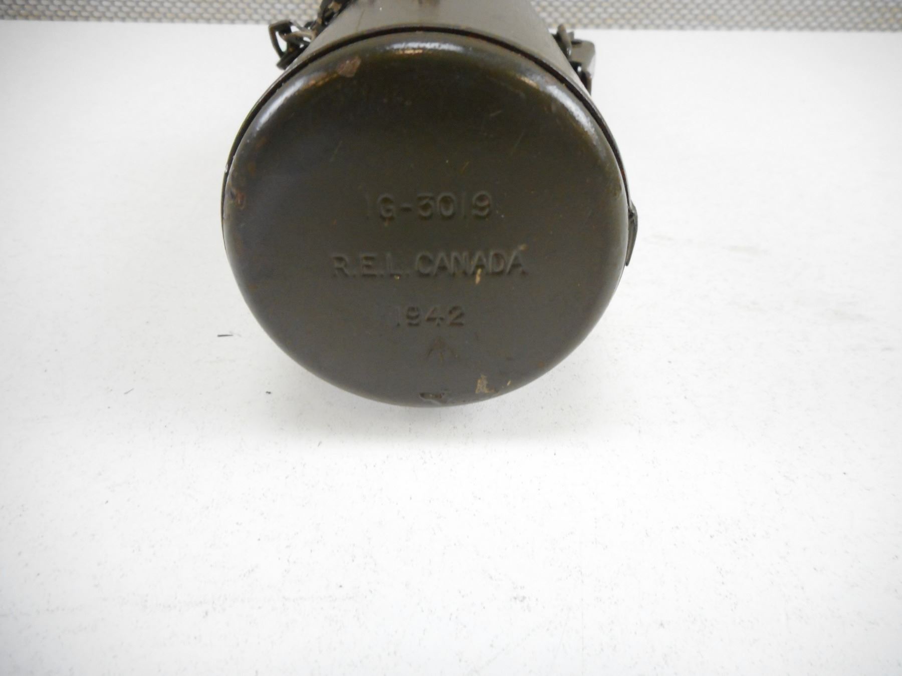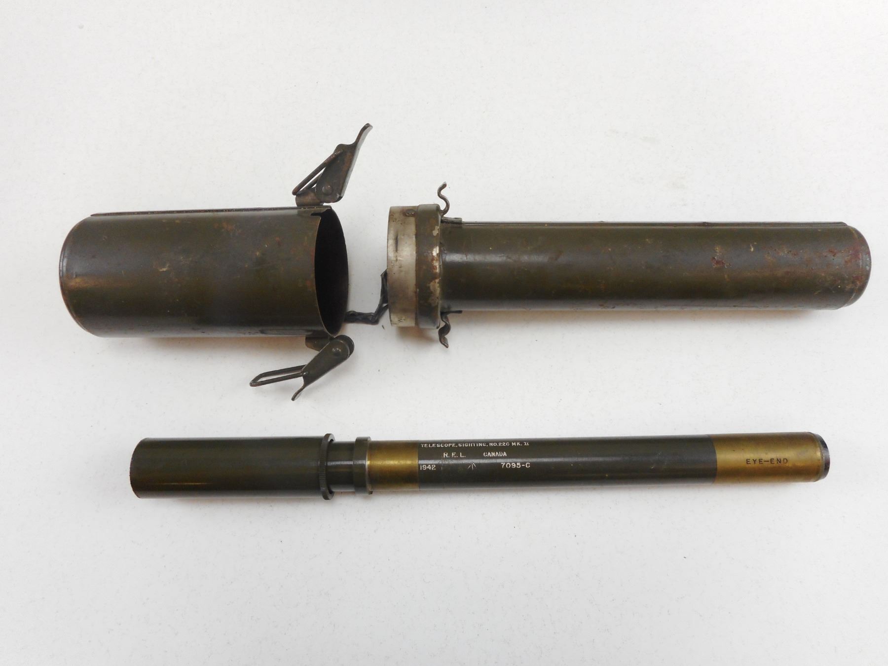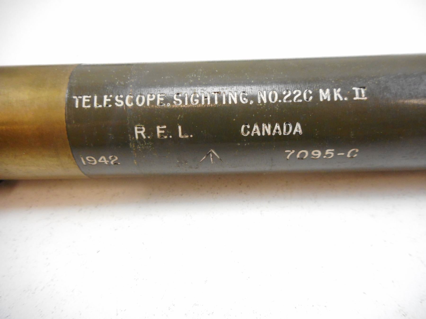 WWII TELESCOPE SIGHTING NO. 22C MKII WITH CASE , GOOD VISIBILITY WITH RETICULE, SCOPE IS MARKED TELESCOPE SIGHTING NO. 22C MKII R.E.L. CANADA 1942 7095-C WITH BROAD ARROW, CARRY CASE MARKED IG-3019 R.E.L. CANADA 1942 WITH BROAD ARROW