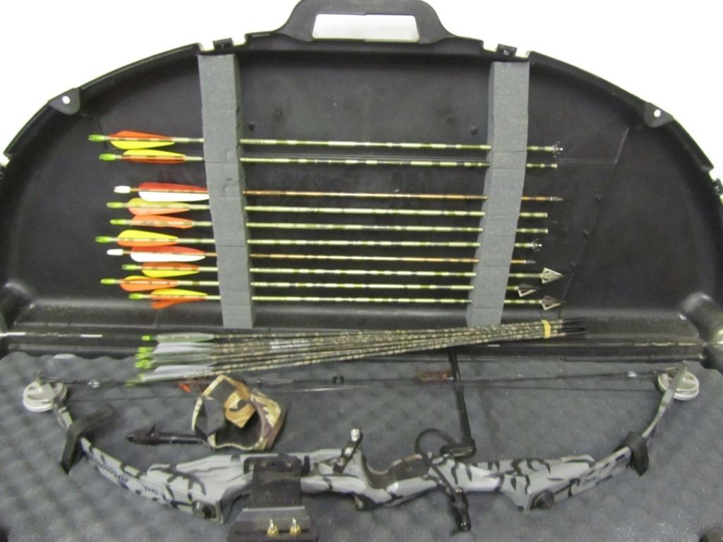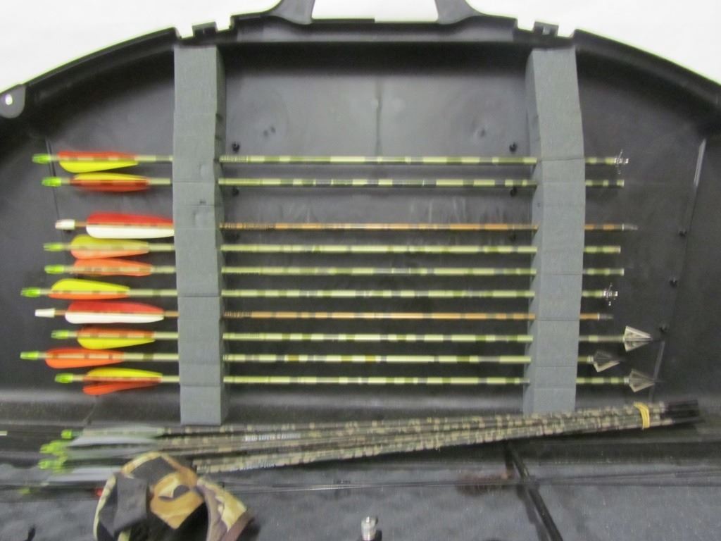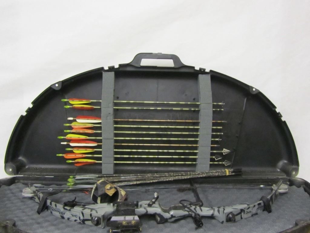 SILVERHAWK XP COMPOUND BOW WITH CASE 10 EASTON CAMO HUNTER XX 75 2117 ALUMINUM ARROWS 22 AFC CARBON CAMO 2200 MICRO DIAMETER ARROWS TRUBALL WRIST RELEASE THREE BROADHEADS, TWO JUDO POINTS, TWO FIELD TIPS.