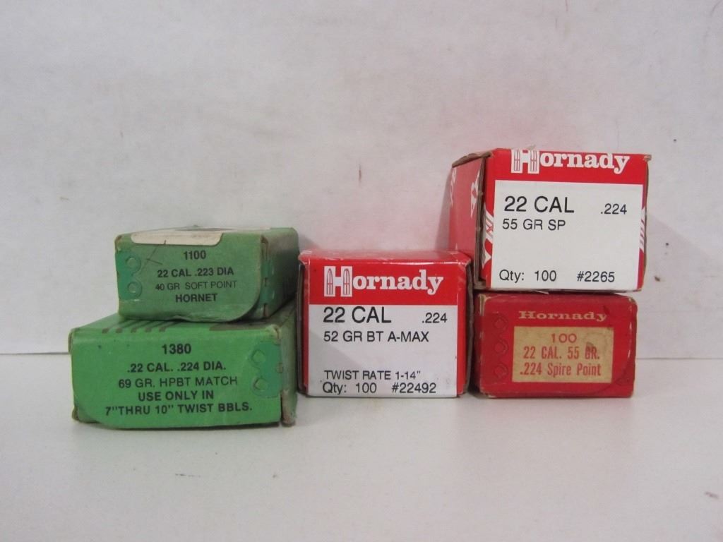 ONE BOX OF SIERRA 22CAL .223DIA 40GR SOFT POINT HORNET BULLETS, ONE BOX OF SIERRA 22CAL .224DIA 69GR HPBT MATCH BULLETS, ONE BOX OF HORNADY 22CAL .224DIA 52GR BT A-MAX BULLETS, ONE BOX OF HORNADY 22CAL .224DIA 55GR SOFT POINT BULLETS, ONE BOX OFHORNADY 22CAL .224DIA 55GR SPIRE POINT BULLETS.