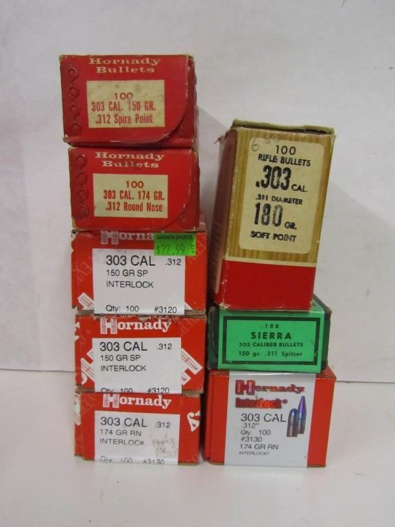 TWO BOXES OF HORNADY 303CAL 150GR SP INTERLOCK BULLETS, ONE BOX OF HORNADY 303CAL 174GR RN INTERLOCK BULLETS, ONE BOX OF HORNADY 303CAL 150GR SPIRE POINT BULLETS, TWO BOXES OF HORNADY 303CAL 174GR ROUND NOSE BULLETS, ONE BOX OF NORMA 303CAL180GR SOFT POINT BULLETS, SIERRA 303CAL 150GR SPITZER BULLETS.