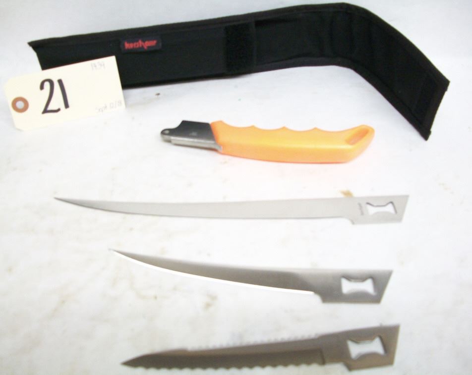 Task Force Series (1096TF) Orange contoured handle (6 3/4") Blades included: Large fillet blade (8 1/2"), Fillet blade (5 1/2"), Serrated blade (5") Cordura pack