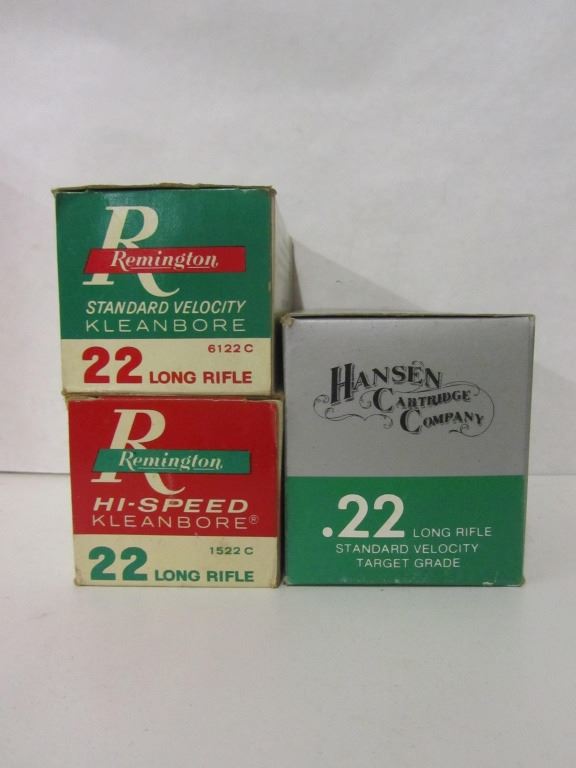 One 400 round box of Remington Standard Velocity Kleanbore 22LR, One 500 Round box of Remington High Velocity Kleanbore 22LR, One 500 round box of Hansen Cartridge co 22LR.
