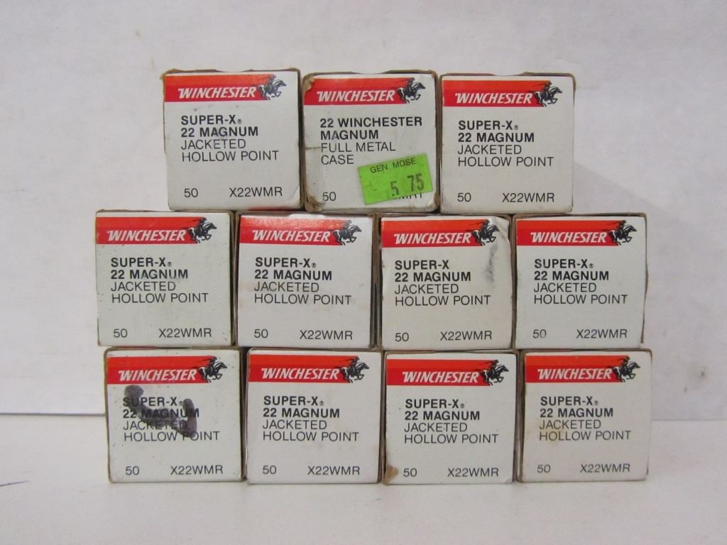 Ten 50 round boxes of Winchester Super-X 22 Magnum Jacketed Hollow Point, One 50 round box of Winchester 22 Winchester Magnum Full Metal Case.