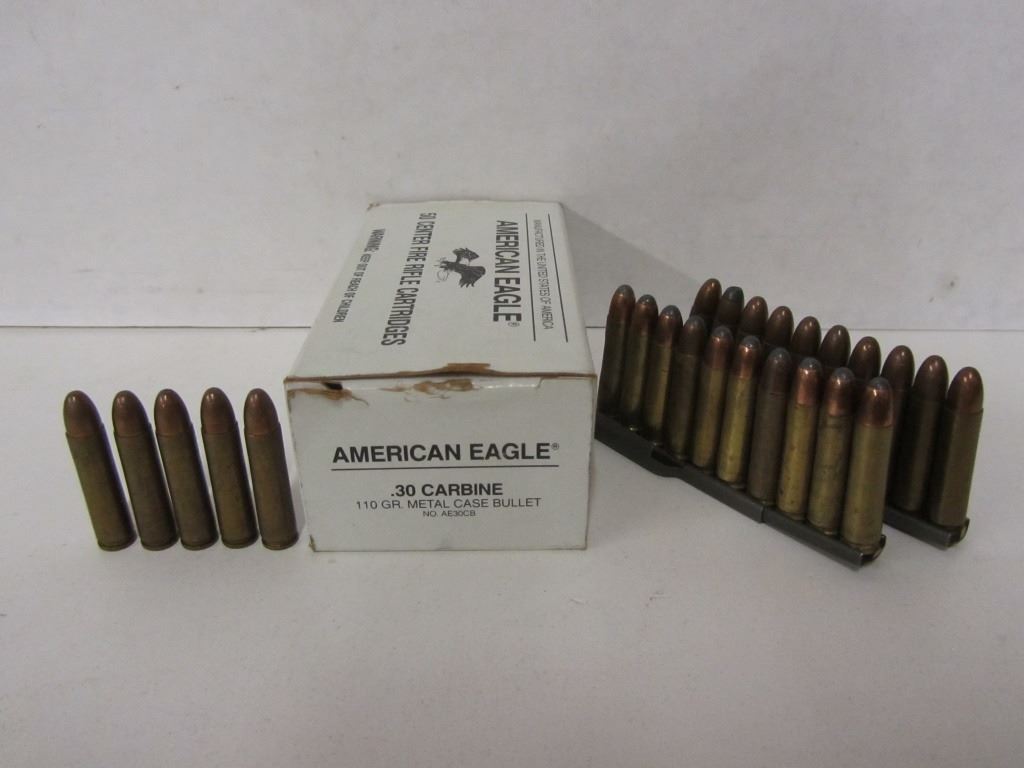 One 50 round box of American Eagle 30 Carbiine 110gr Metal case, Two 10 round stripper clips of 30 Carbine ammo, 5 loose rounds of 30 Carbine ammo.
