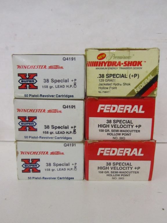 Three 50 round boxes of Winchester 38 Special 158gr Lead Hollow Point, Two 50 round boxes of Federal 38 Special 158gr Semi-Wadcutter Hollow Point, One 25 round box of Federal 38 Special 129gr Jacketed Hydra shok Hollow Point.