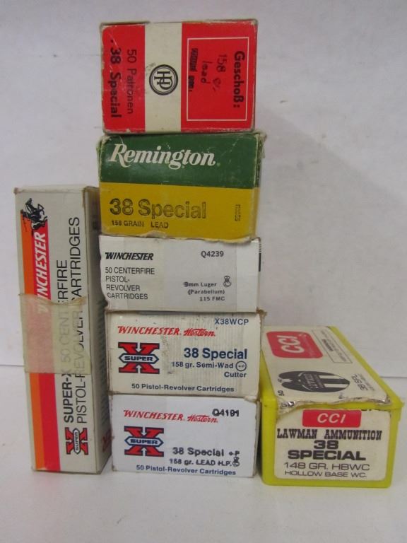 One box of Winchester 38 Special 158gr Lead Hollow point with 20 live rounds and 30 pieces of brass, One box of Winchester 158gr Semi-Wadcutter with 25 live rounds and 25 pieces of brass, One Winchester 9MM box with 50 rounds of 38 SpecialSemi-Wadcutter ammo inside, One Winchester (mm box with 48 rounds of 38 Special ammo inside, One Remington box with 50 pieces of 38 Special brass, One 45 round box of Hirtenberg 38 Special Wadcutters, One plastic CCI box with 50 rounds of38 Special