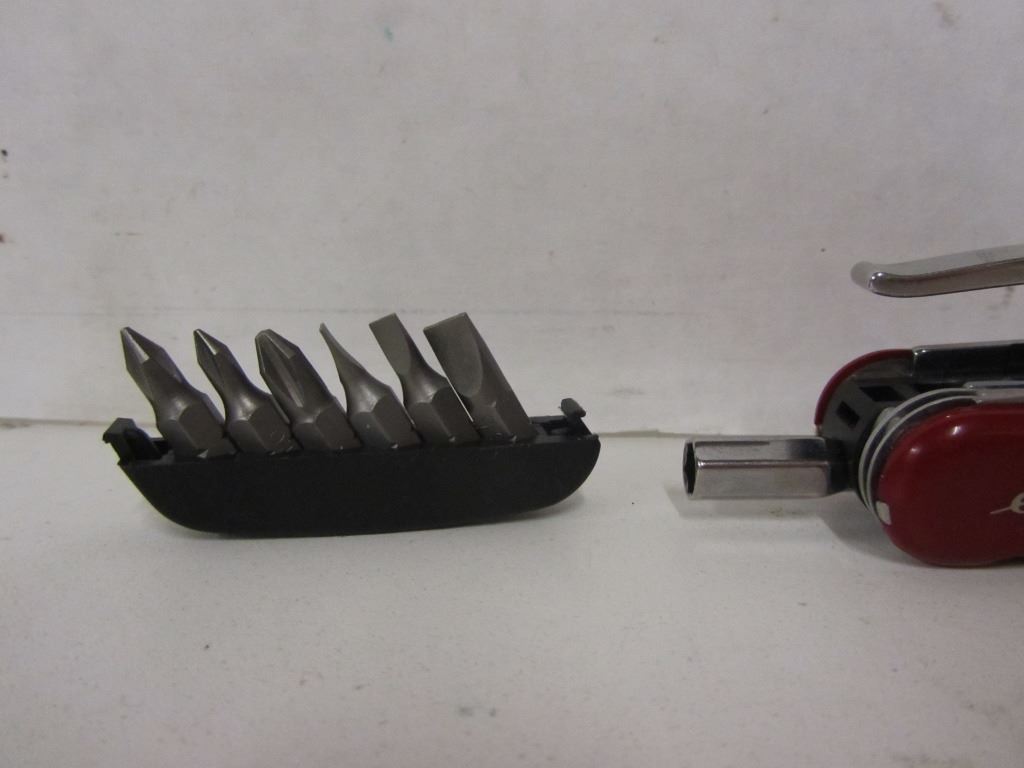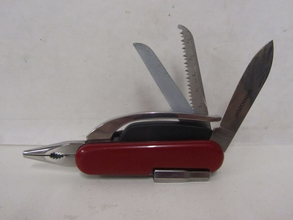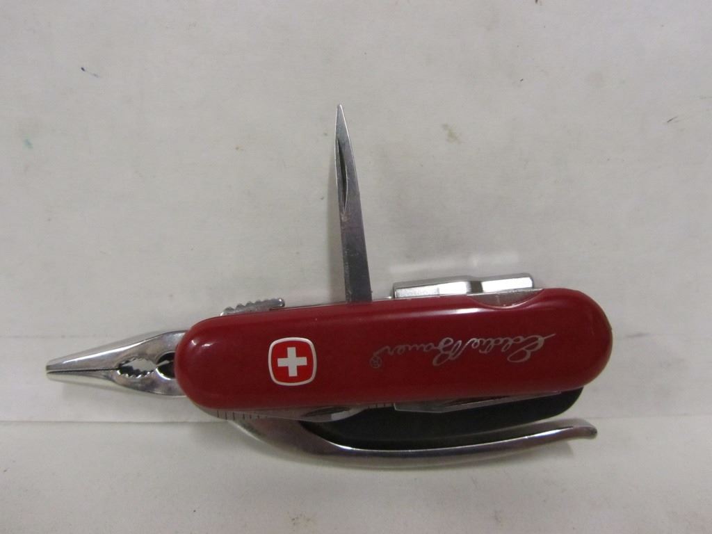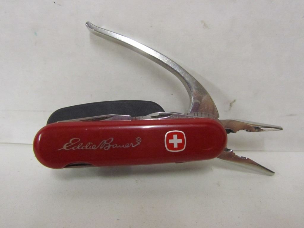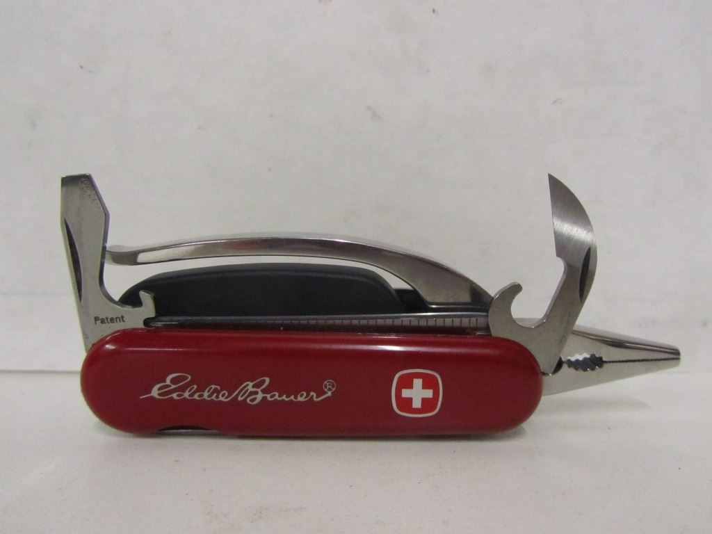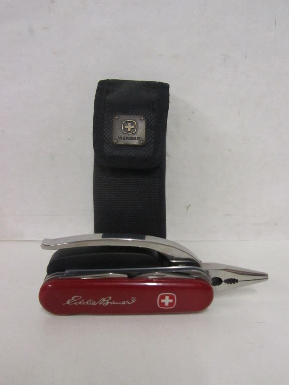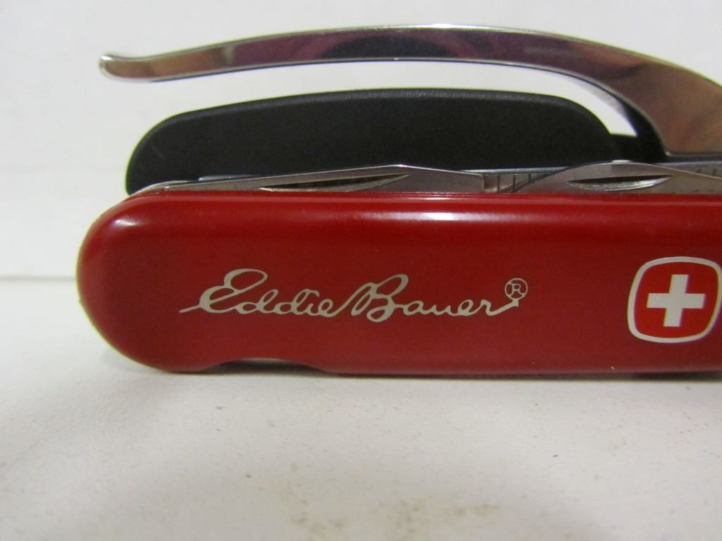 Wenger Swiss Army Knife with belt holster and Eddie Bauer enscription Has pliers Screw driver set with six bits Can openerBottle opener File Serrated blade with 2.5" ruler 2.5" knife blade