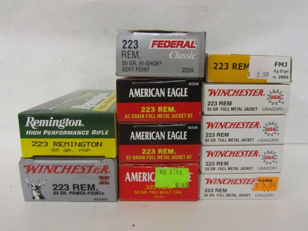 Four 20 round boxes of Winchester 223 Rem 55gr FMJ, One 20 round box of Sellier & Bellot 223 Rem 55gr FMJ, One 20 round box of Federal 223 Rem 55gr Hi-Shok Power Point, Two 20 round boxes of American Eagle 223 Rem 62gr FMJ Boat Tail, One 20round box of American Eagle 223 Rem 55gr FMJ Boat Tail, One 20 round box of Remington 223 Rem 55gr PSP, One 20 round box of Winchester 223 Rem 64gr Power-Point.