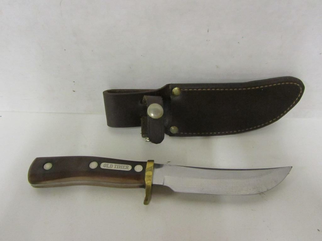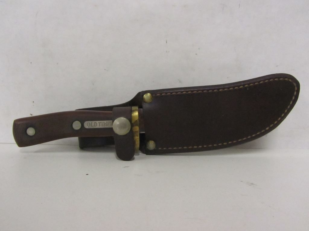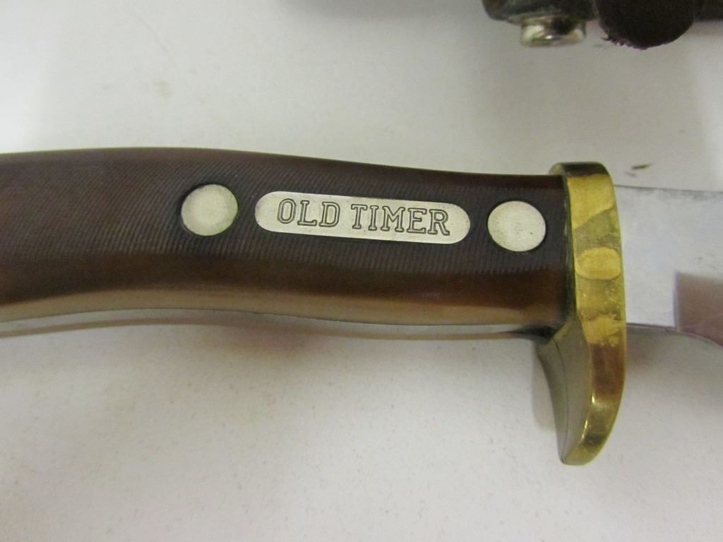 Shrade model 19965 knife with brown leather sheath and "Old Timer" engraving on handle