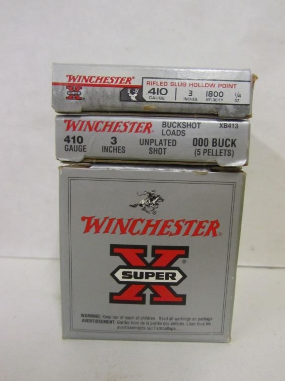 One 20 shell box of Winchester 410cal 3" #7.5, One 5 round box of Winchester 410cal 3" 1/4Oz slugs, One box of Winchester 410cal 3" 000BK with 5 slugs inside