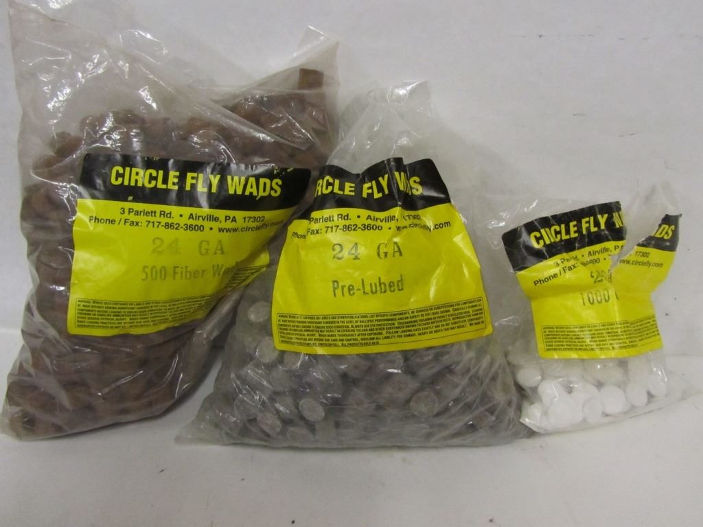 One partial bag of Circle Fly Wads 24ga Fiber Wads, One partial bag of Circle Fly Wads 24ga Overshot wads, One partial bag of Circle Fly Wads 24ga Pre-lubed wads.