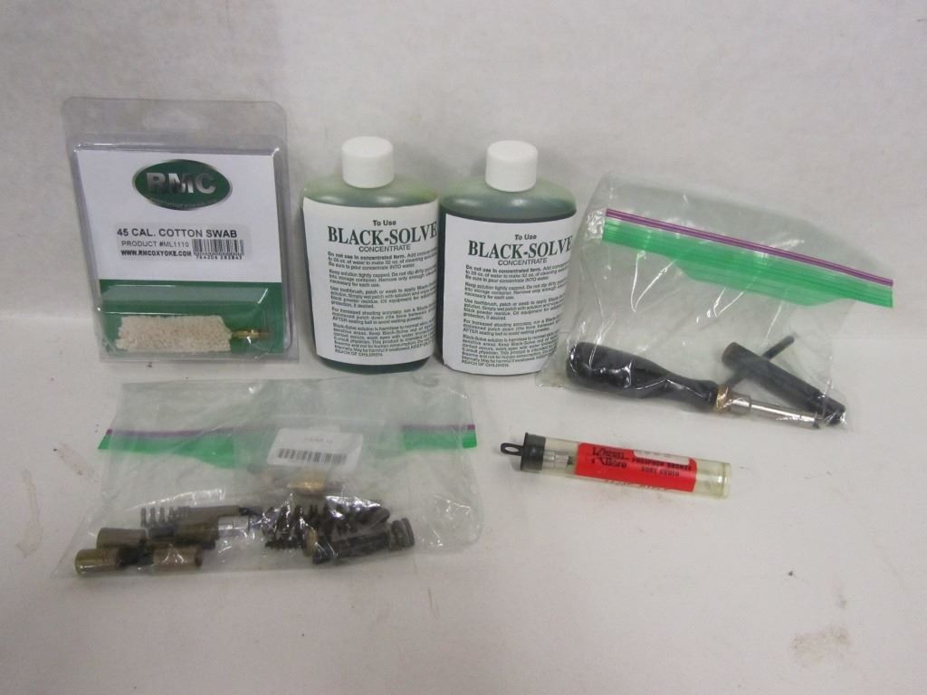 Two bottle of Black Solve Concentrate, One RMC 45cal Cotton Swab, Cleaning brushes, Nipple Wrenches.