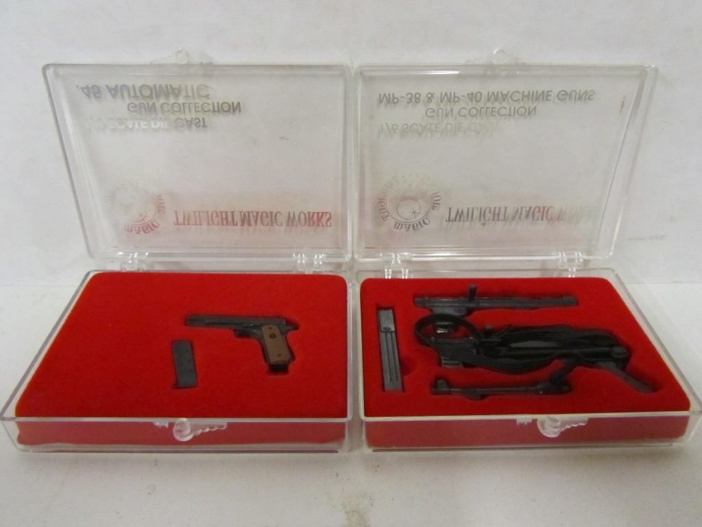 One 1/6 scale die cast 45auto 1911 pistol with two mags, One 1/6 scale die cast MP-38 & MP-40 Machine Gun set.