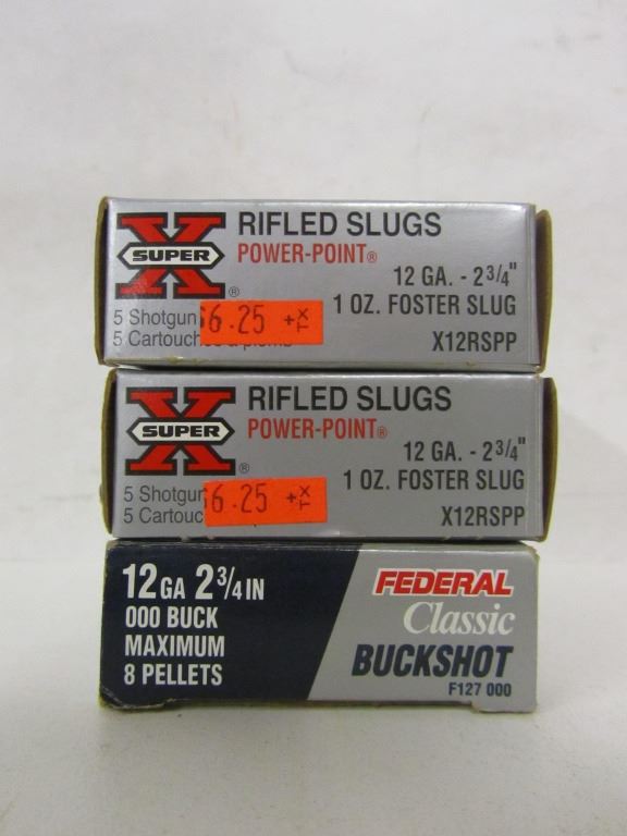 One 5 round box of Winchester 12ga 2 3/4" Foster Slugs, One 1 round box of Winchester 12ga 2 3/4" Foster Slugs, One 5 shell box of Federal 12ga 2 3/4" 000BK.