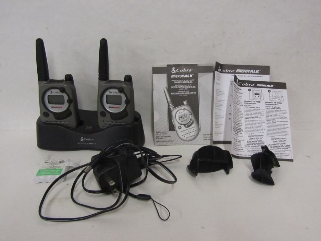 Two Cobra microtalk hand radios with charger stand and manuals