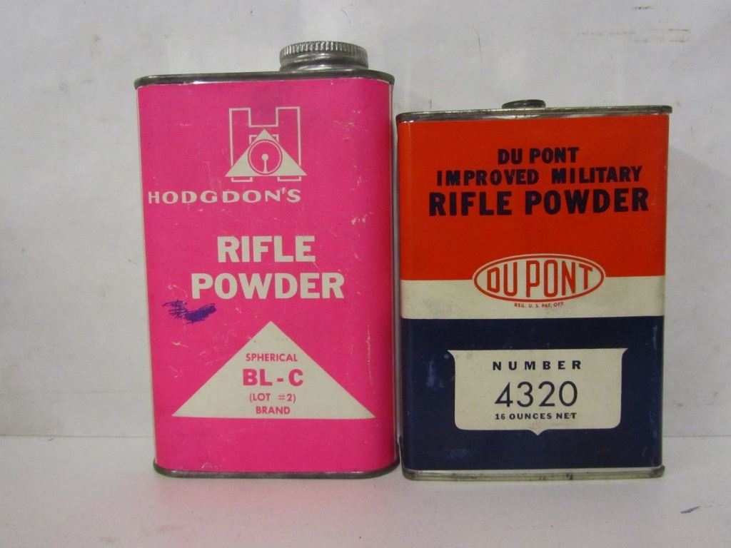 One 2/3 full can of Hodgdon's Sperical BL-C Rifle Powder, One 2/3 full can of Du Pont No. 4320 Military Rifle Powder.