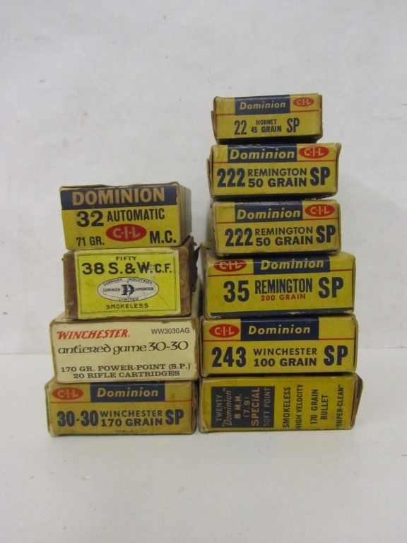 One Dominion 8MM Mauser 170gr Soft Point Box, One Dominion 243 Win 100gr SP box, One Dominion 35 Rem Sp Box, Two Dominion 222 Rem 50gr SP boxes, One Dominion 22 Hornet 45gr SP box, One Dominion 32 Auto 71gr MC box, One Dominion 38 S&W C.F. box,One Winchester Antlered Game 30-30 Win 170gr Power Point box, One Dominion 30-30 Win 170 SP box.