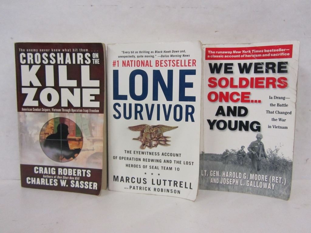 One copy of "Crosshairs on the Kill Zone" by Craig Roberts, One copy of "Lone Survivor" by Marcus Luttrell, One copy of "We Were Soldiers Once... and Young" by LT. Gen. Harold G. Moore and Joseph L. Galloway.
