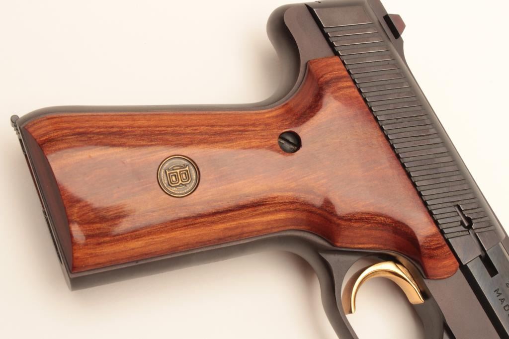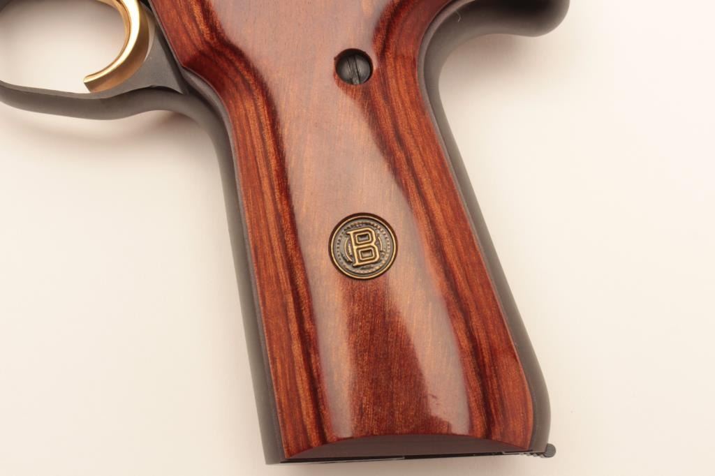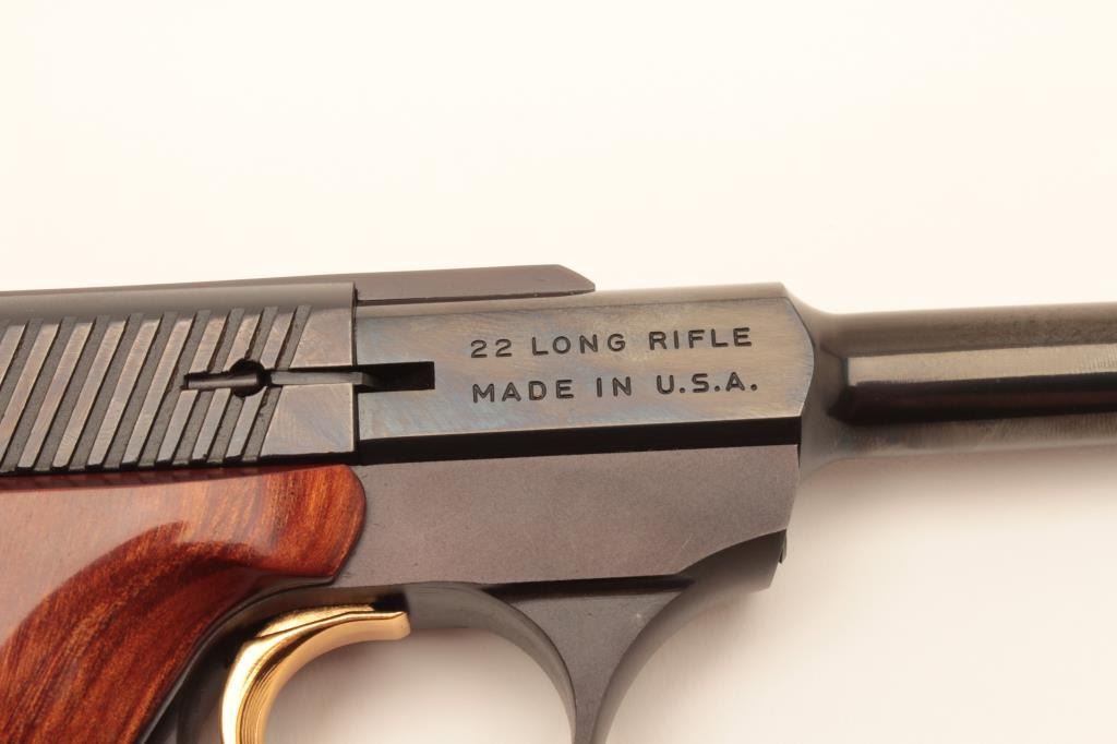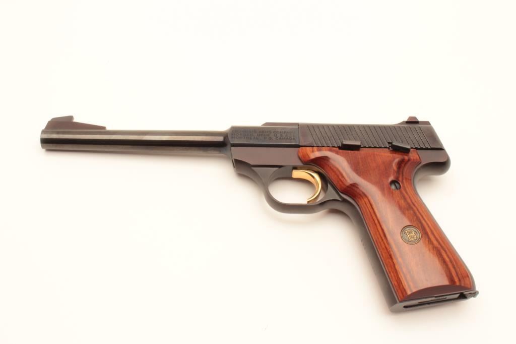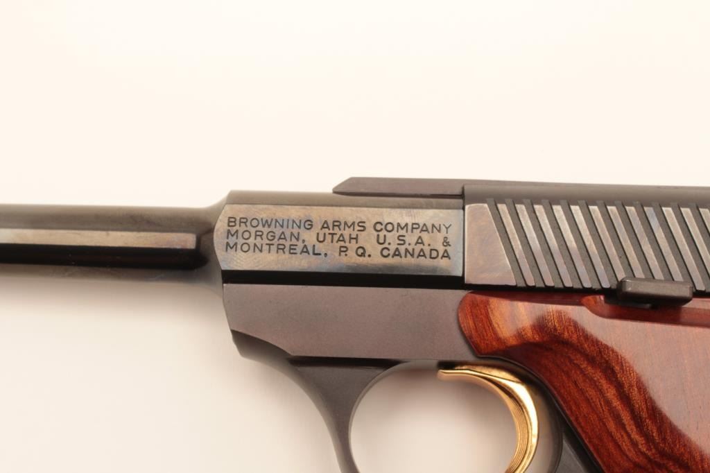 Browning Challenger semi-automatic pistol, .22 Long Rifle caliber, Serial #655RT01885. The pistol is in fine overall condition with a 6 ¾” barrel. The metal surfaces retain nearly all of their high polish blue finishwith just slight wear at the muzzle. The pistol is marked, “MADE IN THE USA.” The smooth wood medallion grips are in excellent condition showing little use. The bore is very good, the action is crisp and markingsare sharp. The lot includes one correct magazine. Est.: $250-$500. (Modern).