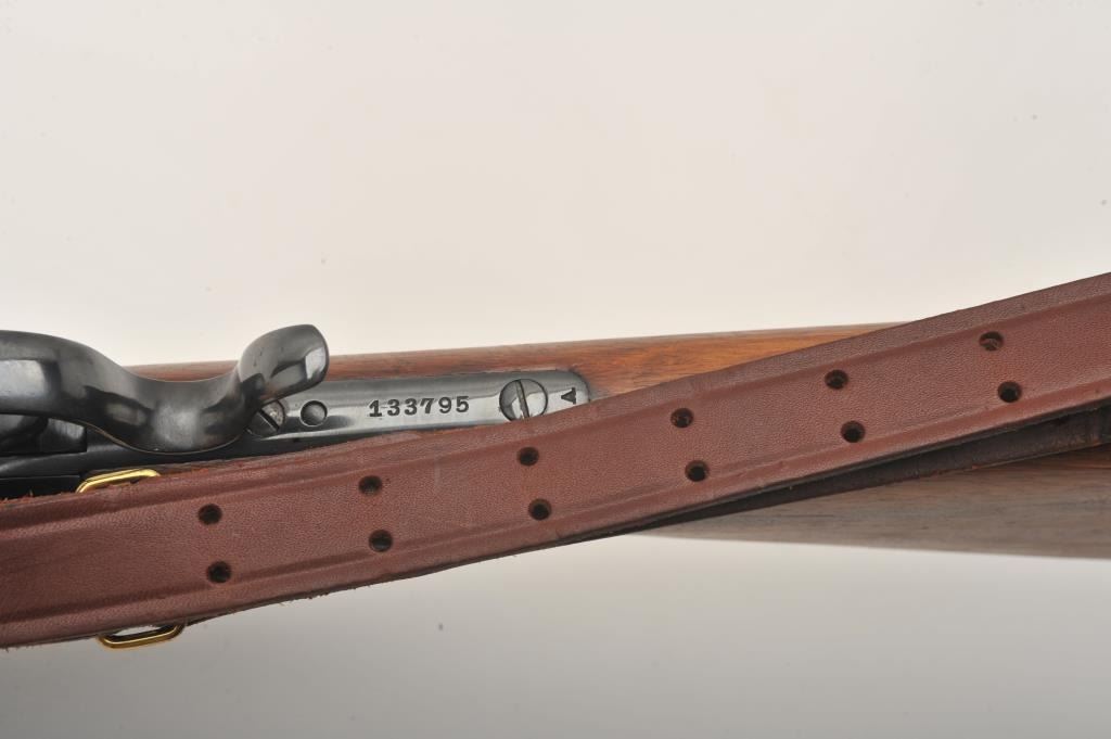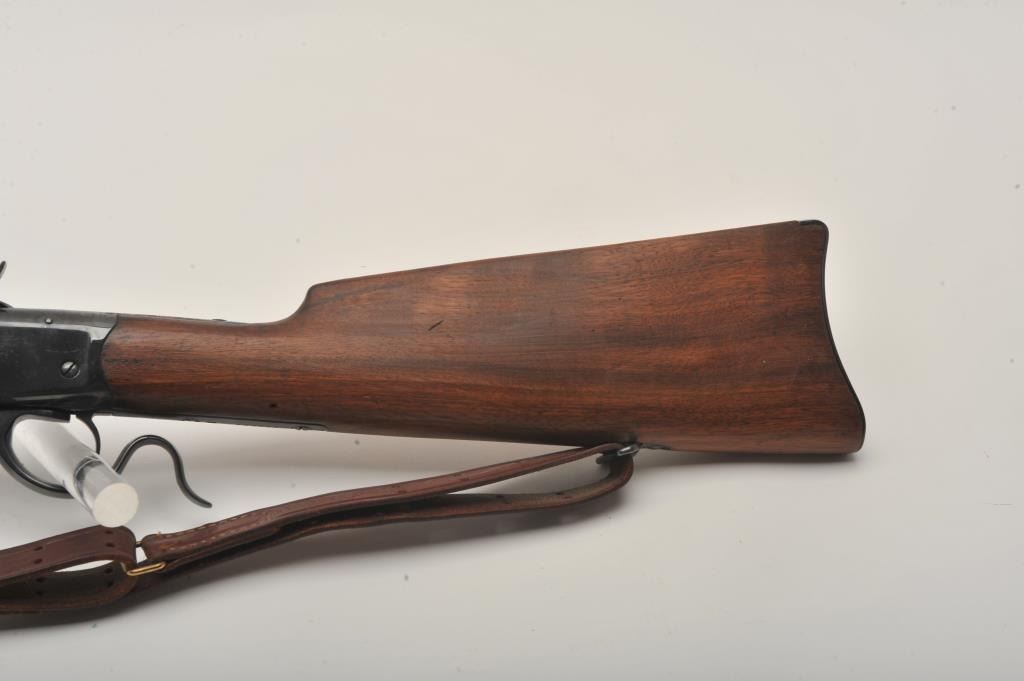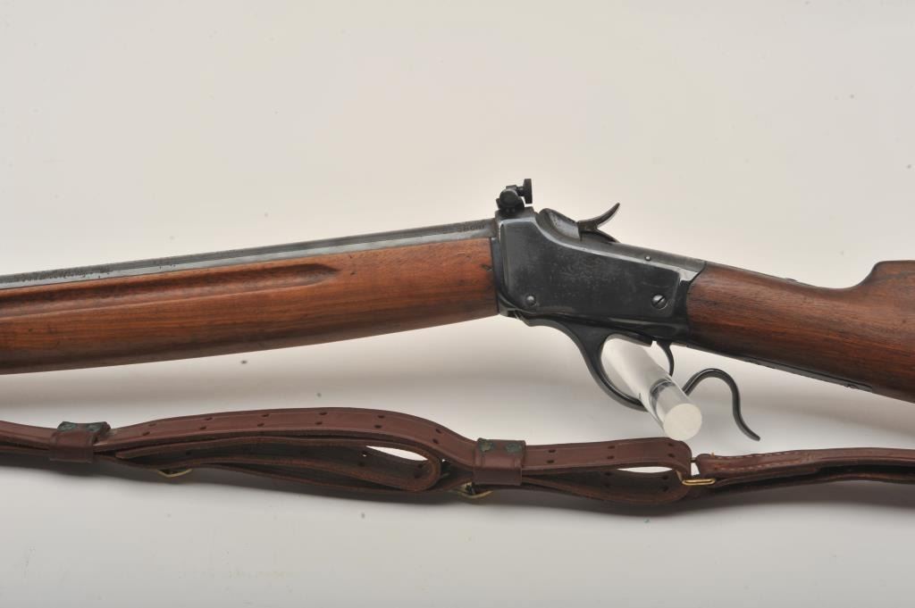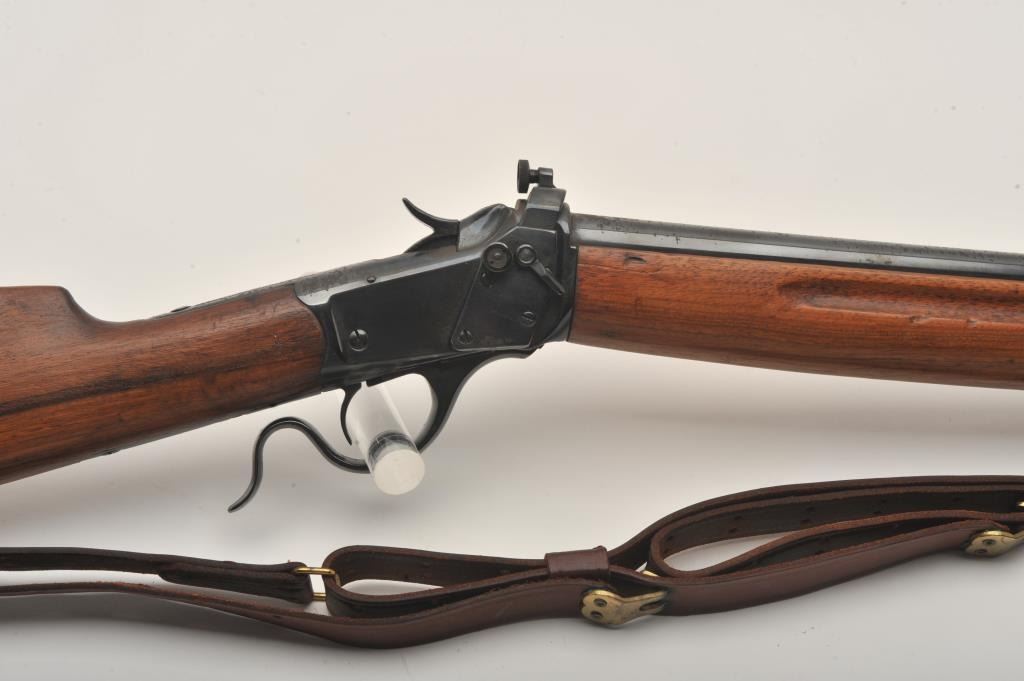 Winchester Low Wall single shot rifle, .22 short caliber, 28” round barrel, U.S. and flaming bomb marked behind hammer, re-blued finish, wood stocks, S/N 133795, with leather sling. Overall condition is fair to good as re-blued; metal surfaces show scattered spots of surface rust and erosion, action is crisp, bore is dark, wood is overall good; Lyman receiver mounted adjustable rear sight retained. (Antique). Est.:$350-$700.