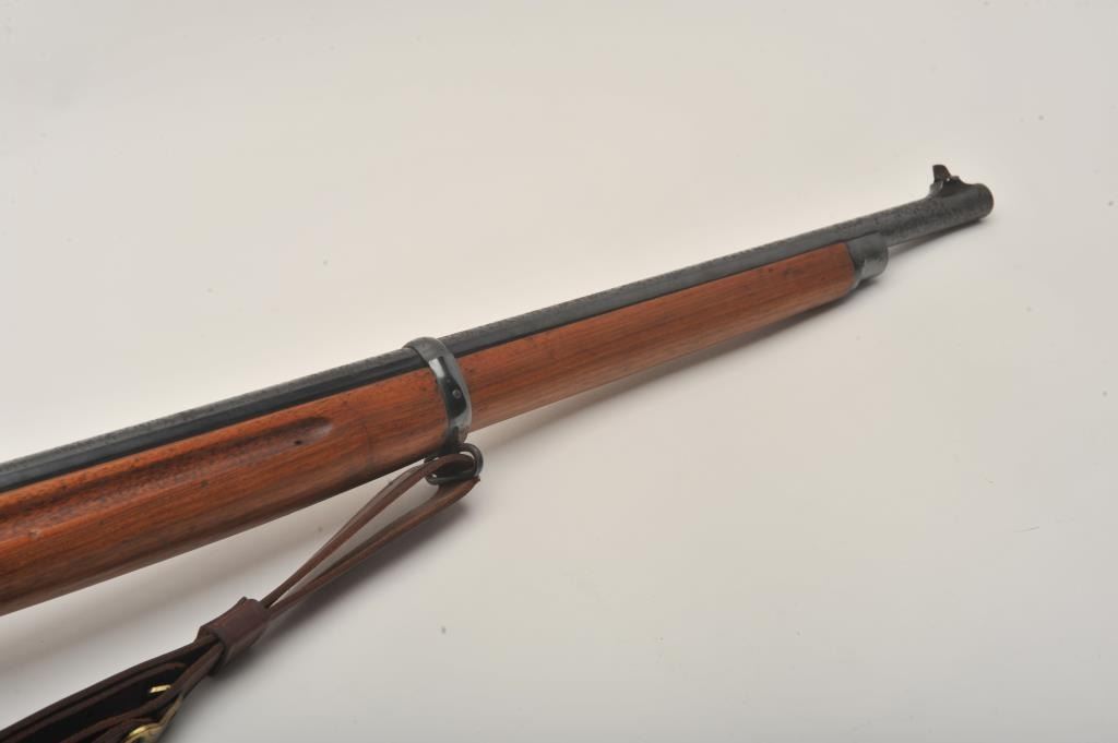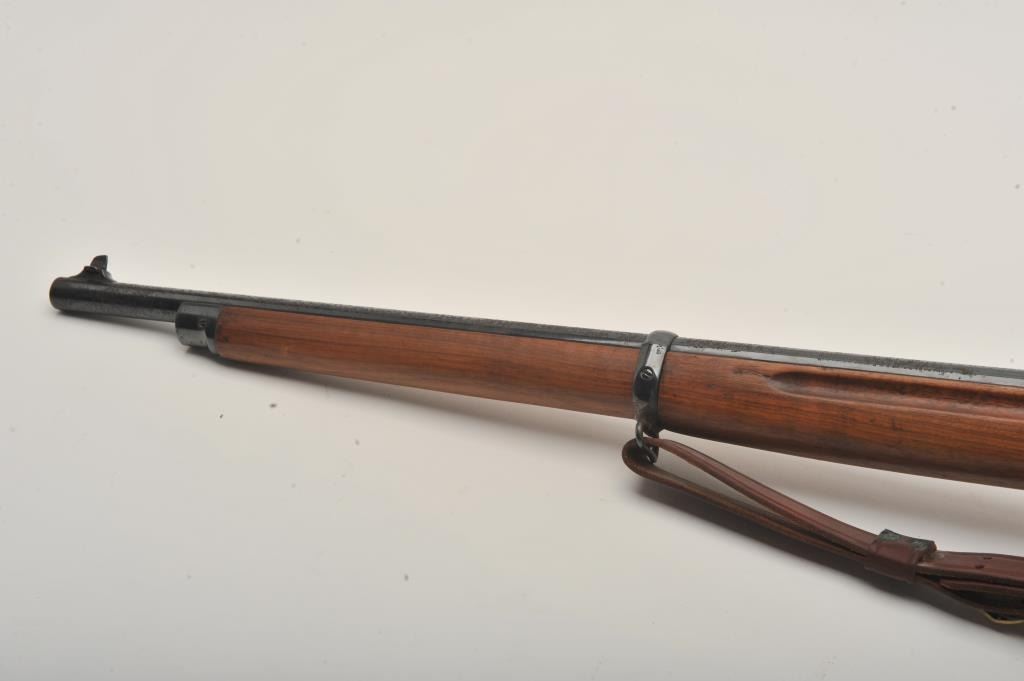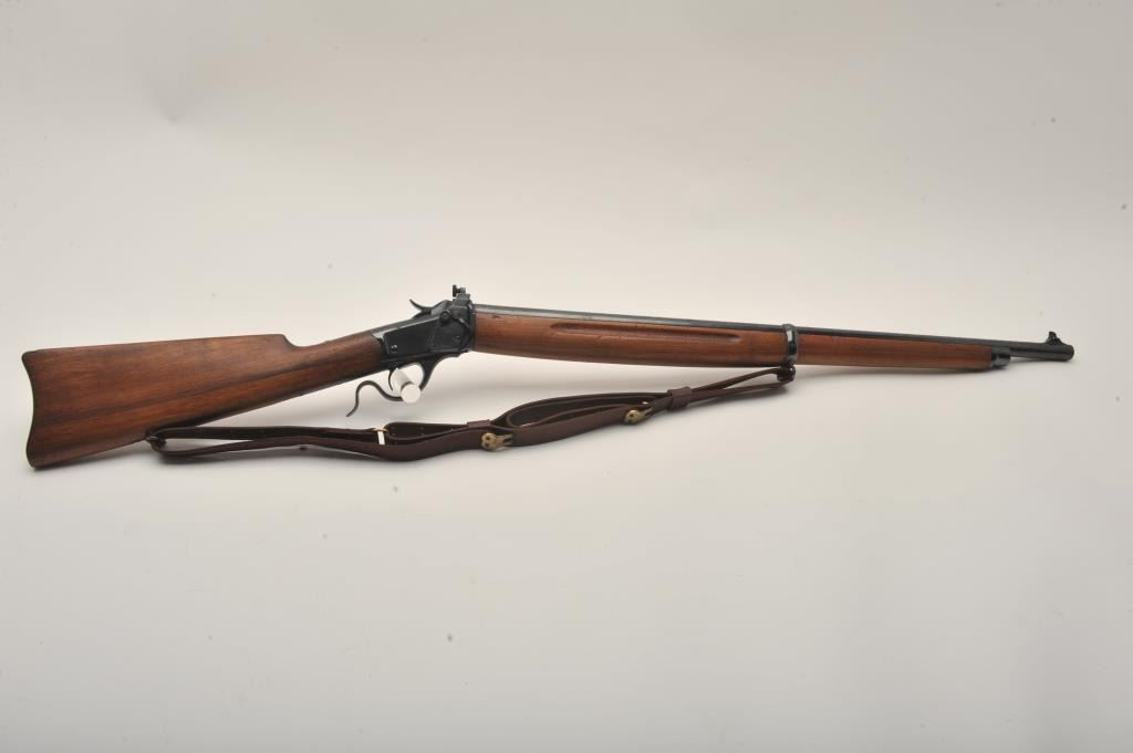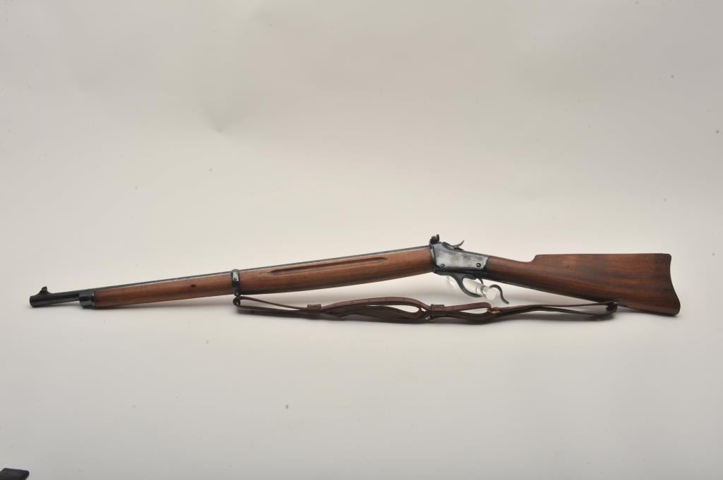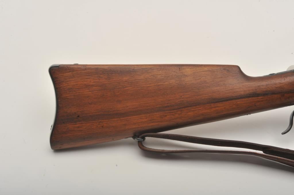 Winchester Low Wall single shot rifle, .22 short caliber, 28” round barrel, U.S. and flaming bomb marked behind hammer, re-blued finish, wood stocks, S/N 133795, with leather sling. Overall condition is fair to good as re-blued; metal surfaces show scattered spots of surface rust and erosion, action is crisp, bore is dark, wood is overall good; Lyman receiver mounted adjustable rear sight retained. (Antique). Est.:$350-$700.