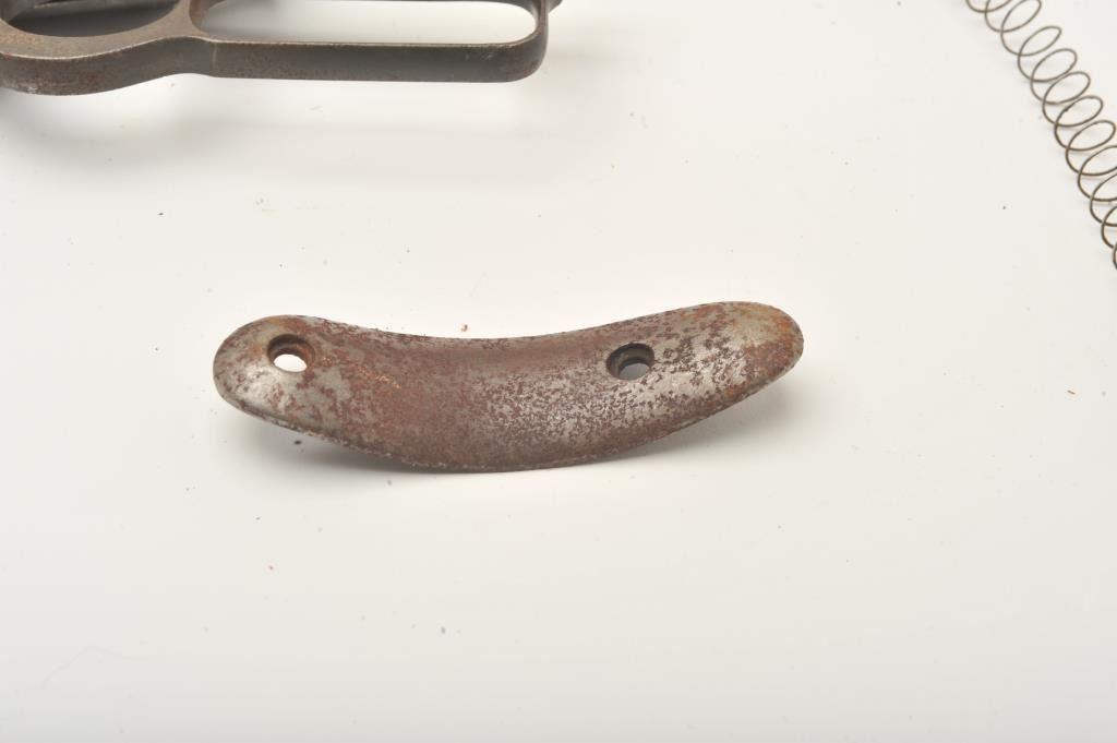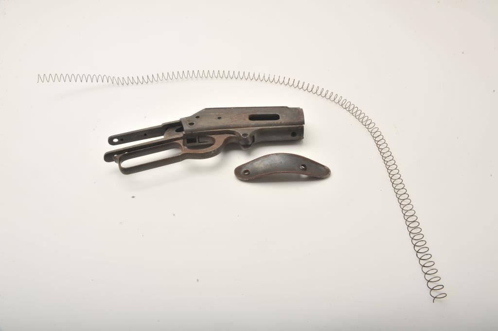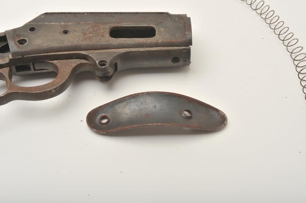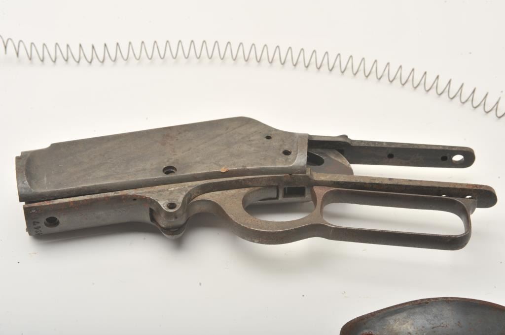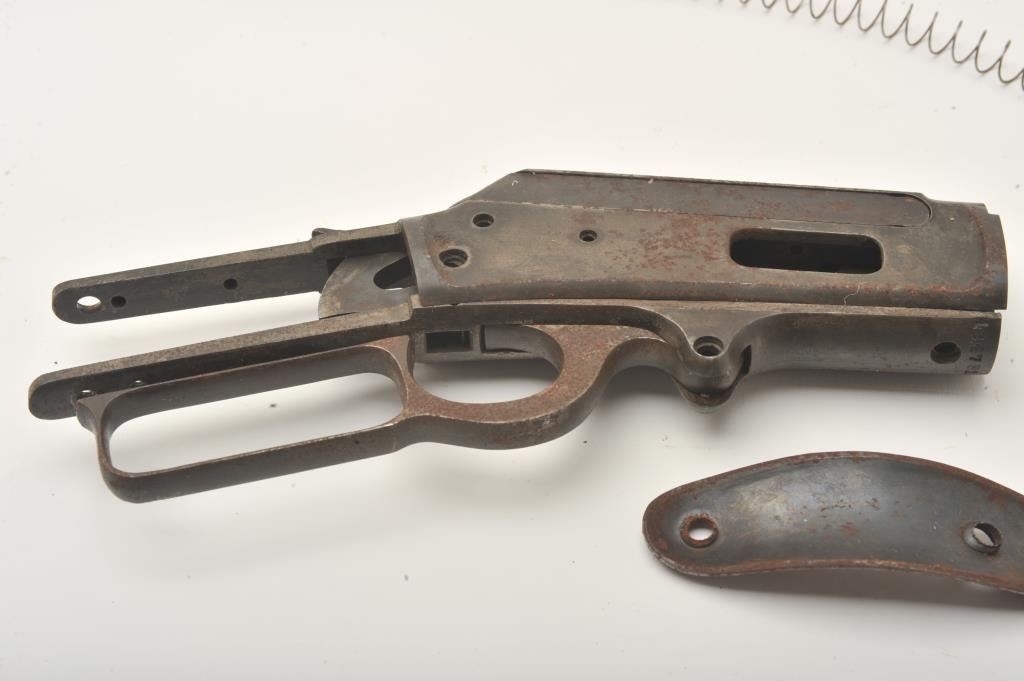Marlin 1893 lever action rifle parts lot. The lot includes a Marlin 1893 receiver, Serial #434781, assorted loose parts and a steel butt plate. The parts are in fair overall condition with light to moderatesurface rust and some original blue still present in the protected areas. Est.: $100-$200. (C+R).