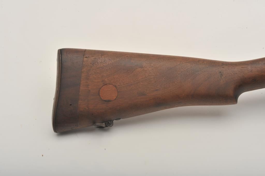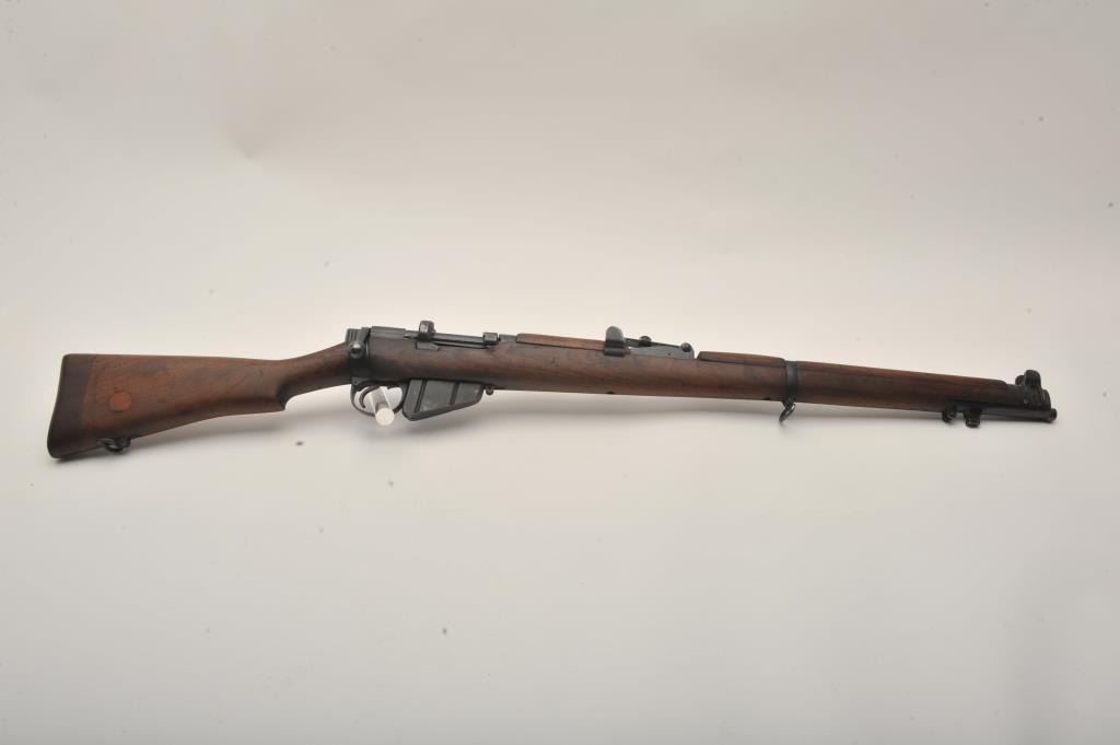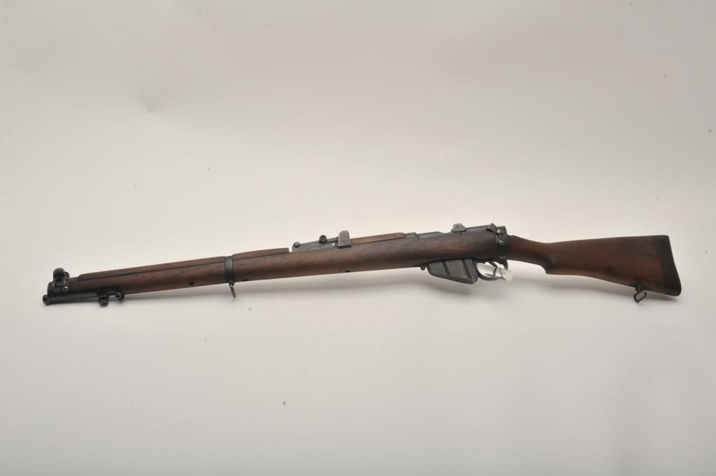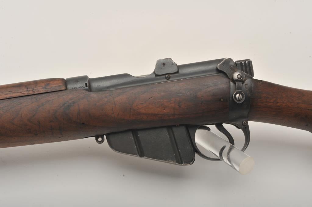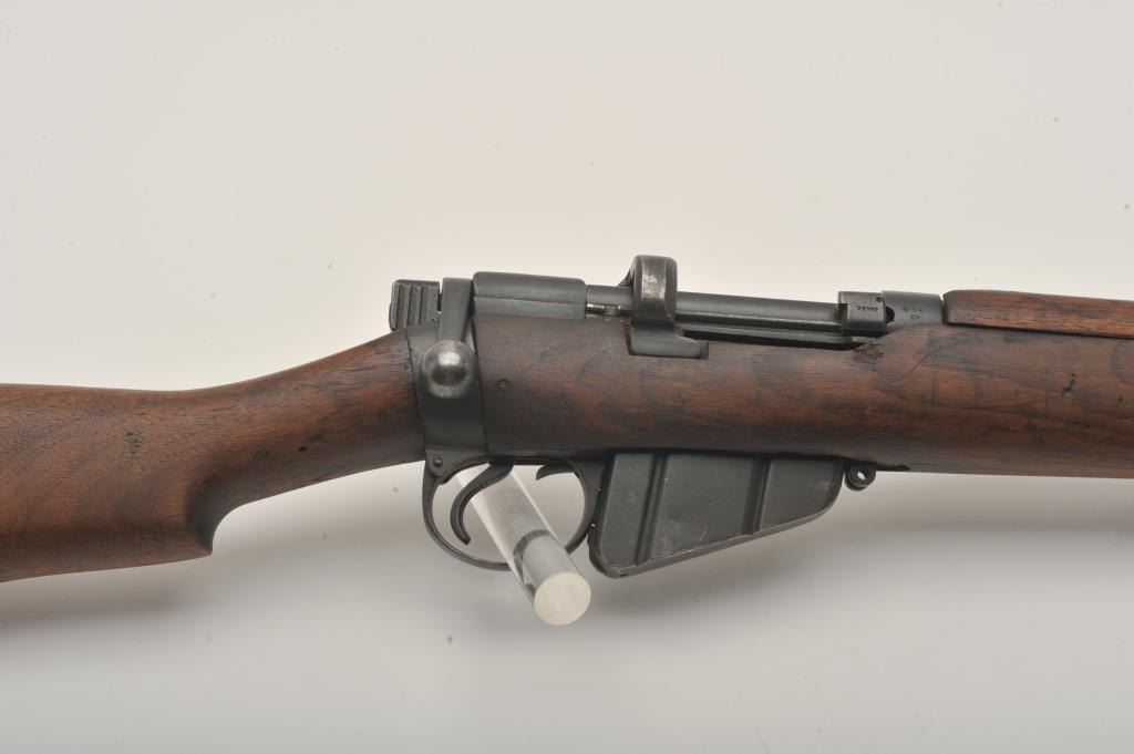 Lee-Enfield SMLE No.4 MK1 bolt action rifle, .303 British caliber, Serial #441. The rifle is in good overall condition with a 25.2” barrel. The metal surfaces retain the majority of their military finish with wearat the muzzle. The receiver is marked, “ENGLAND”, “LSA” for London Small Arms and dated 1916. The smooth wood stock is in good condition with mars and compressions from use, numerous cartouches and an inch of woodadded at the butt stock, which ends with a brass butt plate. The bore is good, the action crisp and markings are sharp on this WWI era Lee-Enfield. Est.: $250-$500. (C+R).