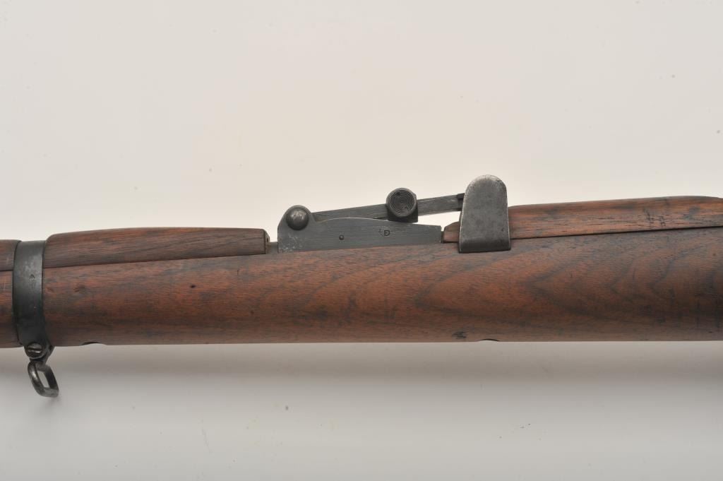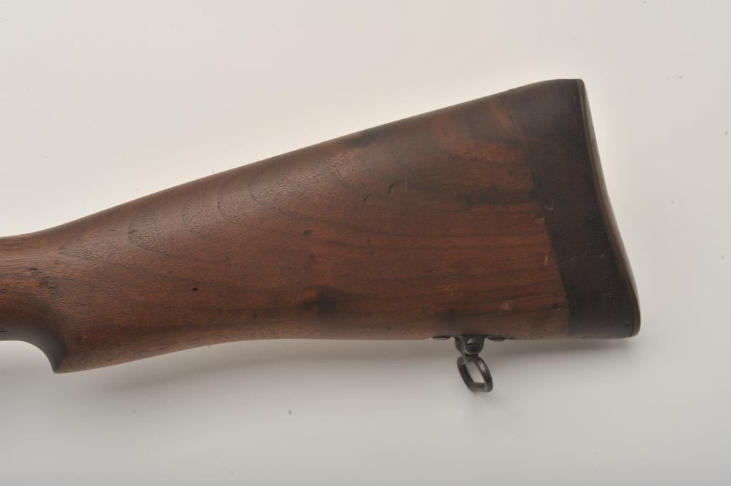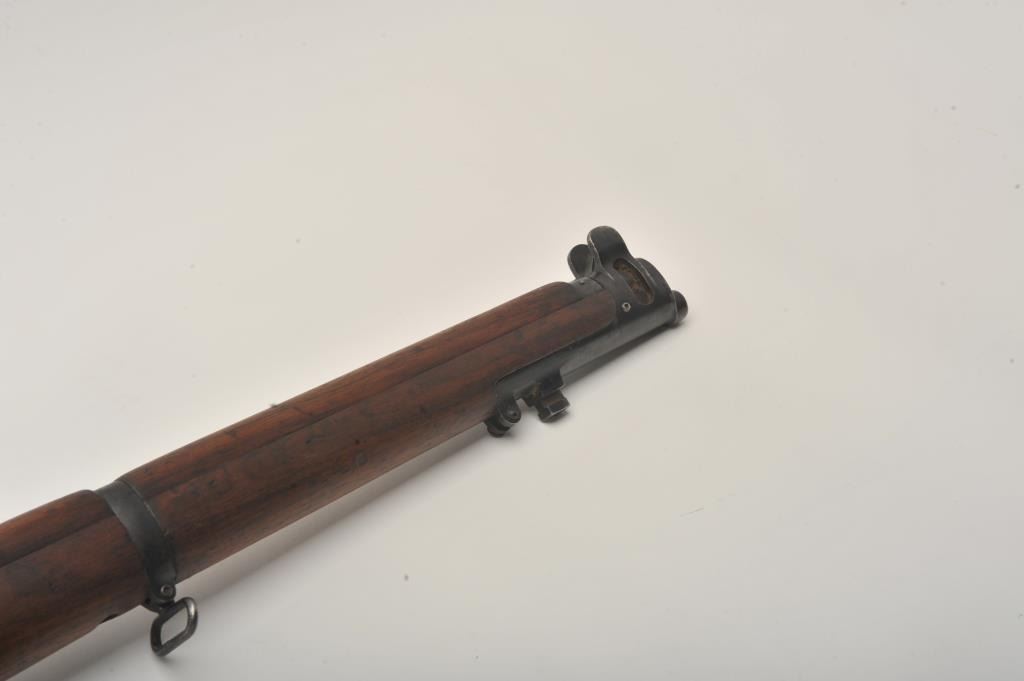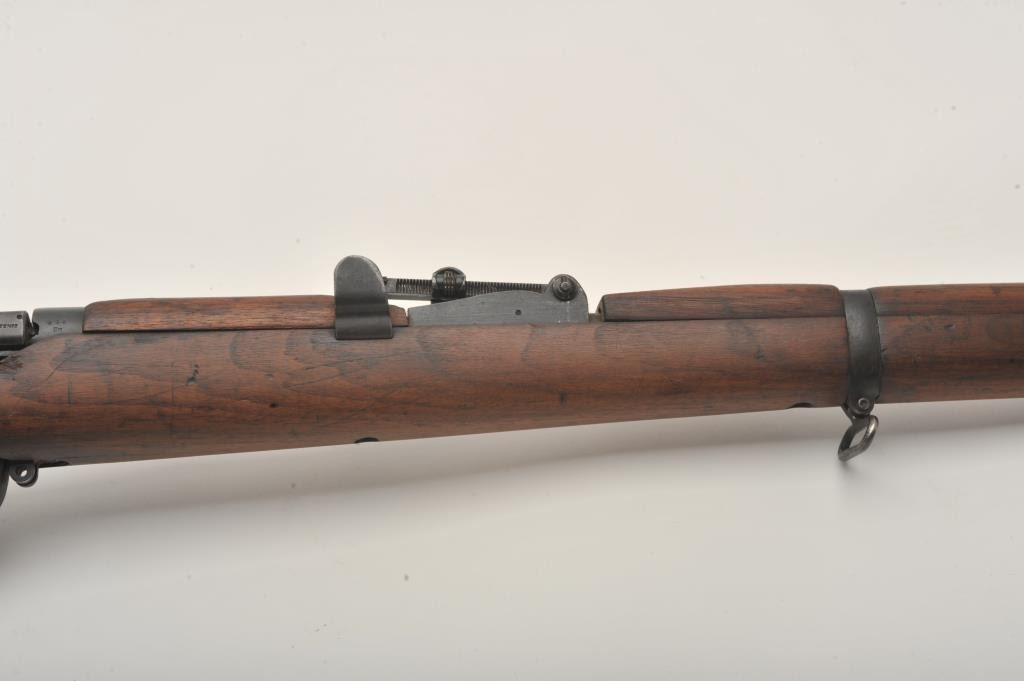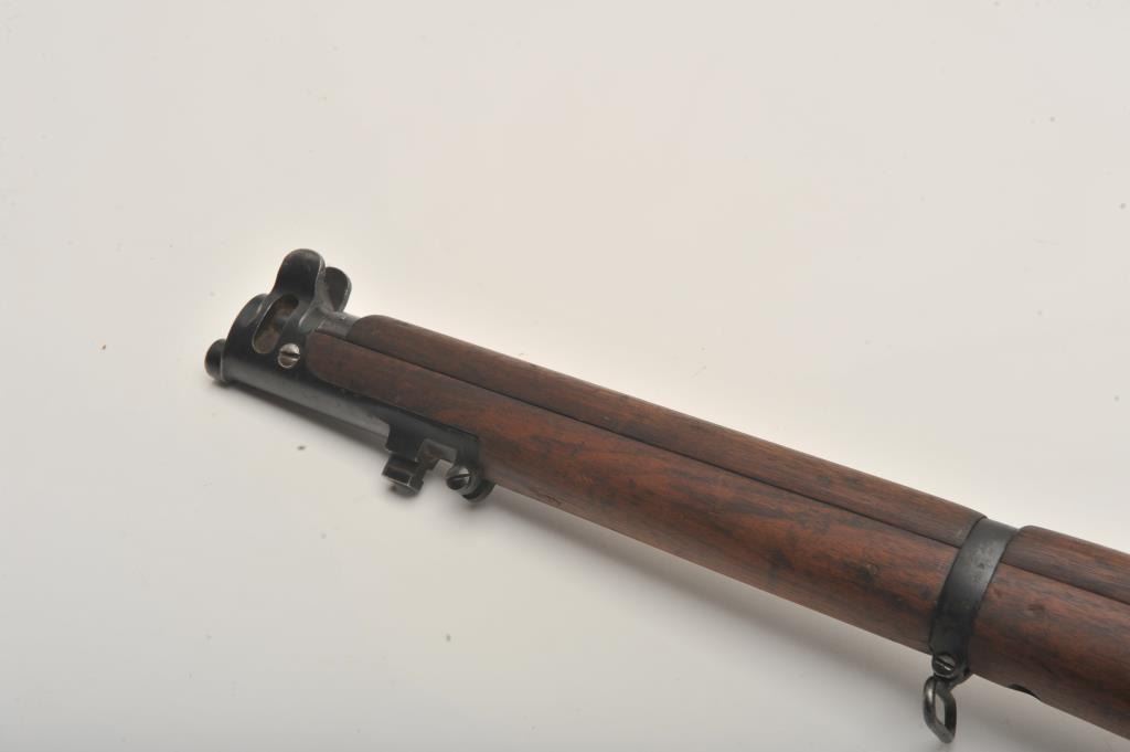 Lee-Enfield SMLE No.4 MK1 bolt action rifle, .303 British caliber, Serial #441. The rifle is in good overall condition with a 25.2” barrel. The metal surfaces retain the majority of their military finish with wearat the muzzle. The receiver is marked, “ENGLAND”, “LSA” for London Small Arms and dated 1916. The smooth wood stock is in good condition with mars and compressions from use, numerous cartouches and an inch of woodadded at the butt stock, which ends with a brass butt plate. The bore is good, the action crisp and markings are sharp on this WWI era Lee-Enfield. Est.: $250-$500. (C+R).