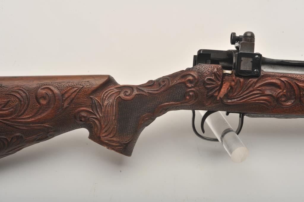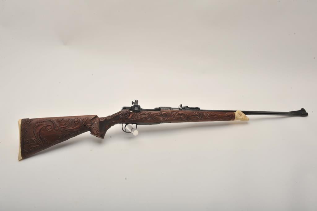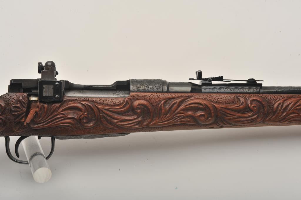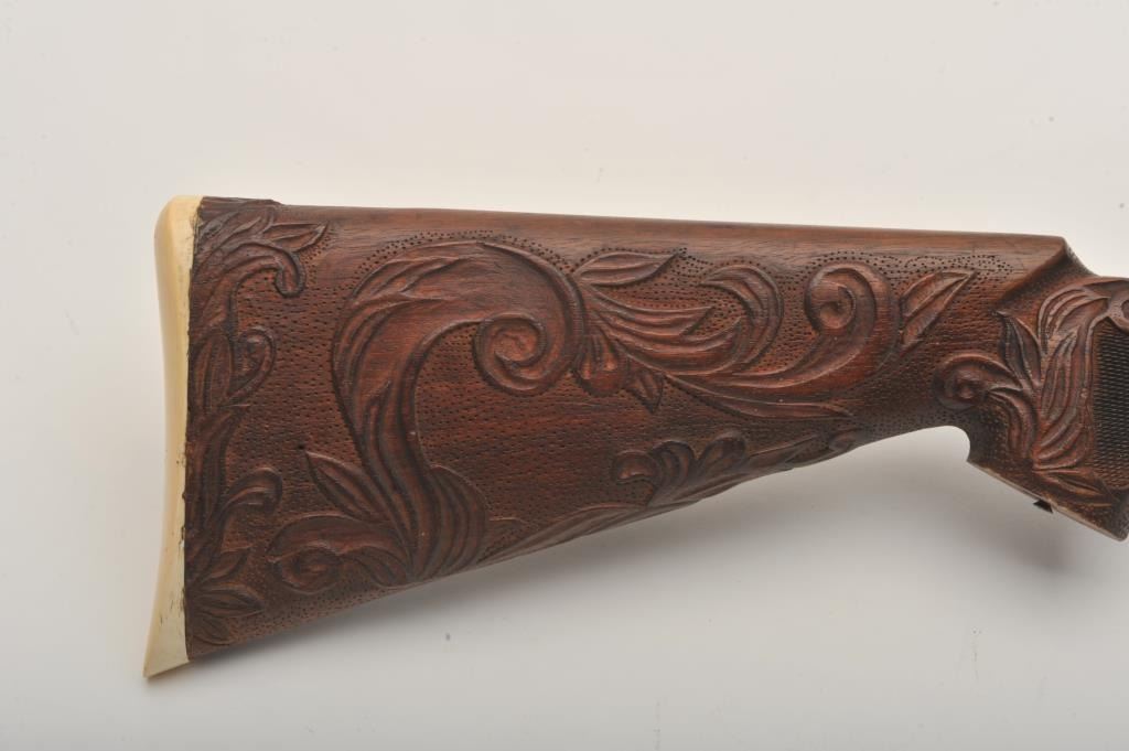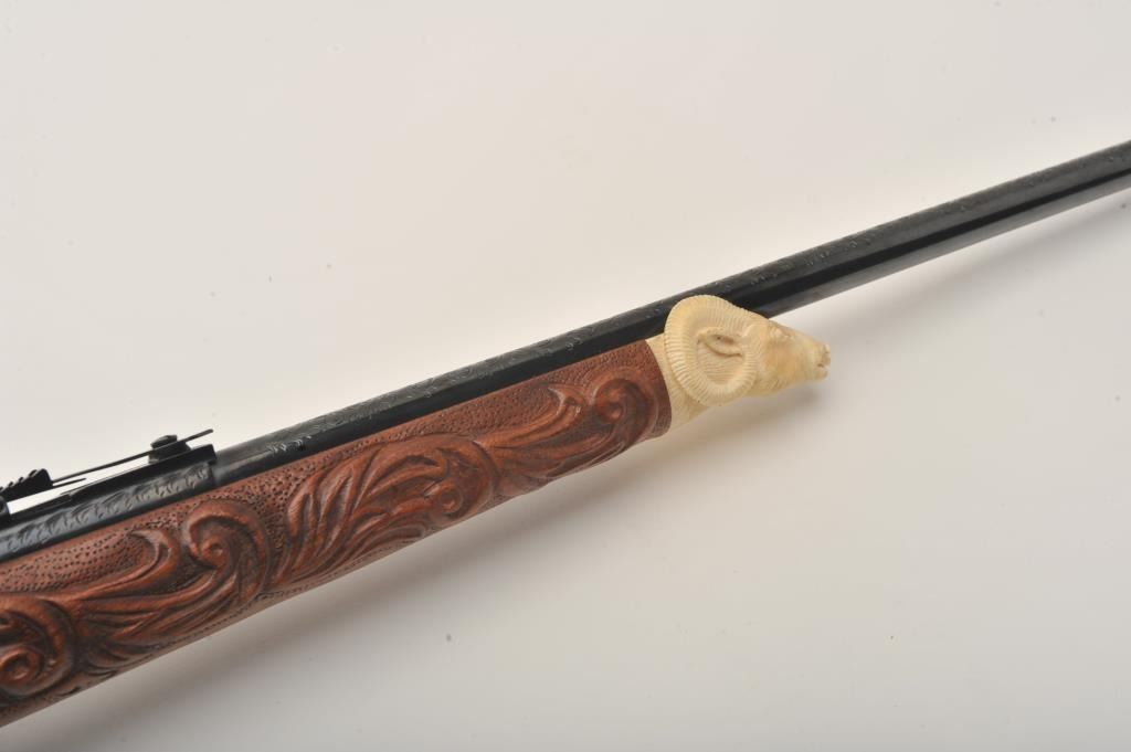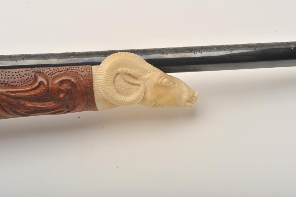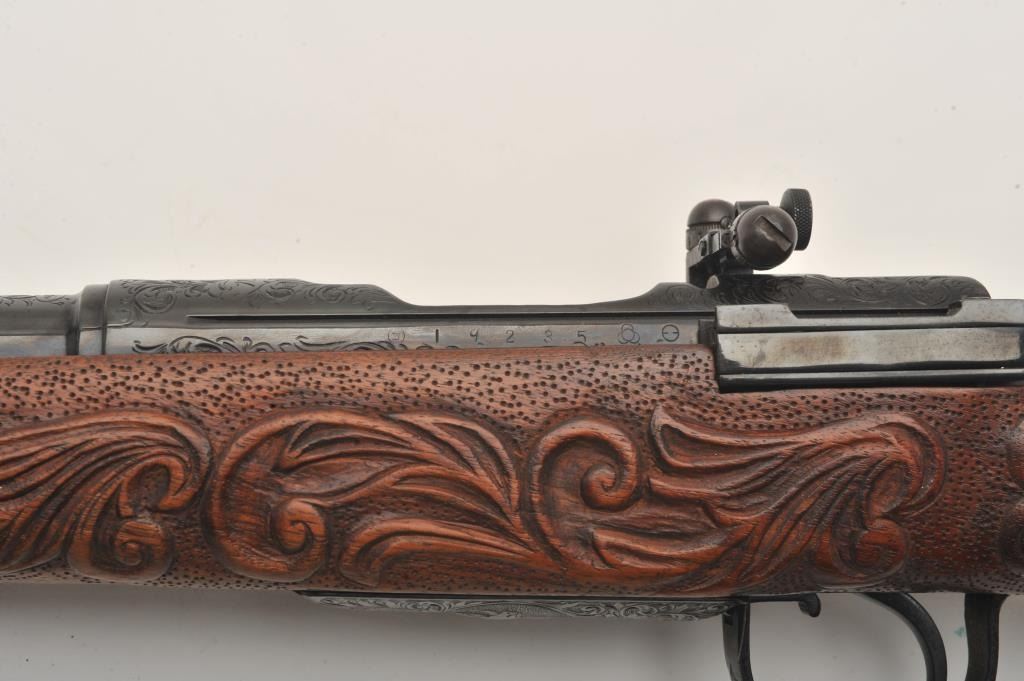Custom Japanese Arisaka Type 99 bolt action rifle, 7.7 mm caliber, Serial #19235. The rifle is in fine overall condition with a 24” engraved barrel. The metal surfaces have been re-blued and then beautifully reliefengraved with the magazine plate featuring a ram’s head. The front and rear sights are replacements and the bolt is missing. A Lyman aperture sight has been added during the period of use. The stock is hand carvedthe entire length with a carved ivory ram’s head capping the fore end. The butt stock ends with a smooth ivory butt plate providing a 14” LOP. The work on this rifle is extraordinary and would be prohibitivelyexpensive at today’s rates. Est.: $400-$800. (C+R).