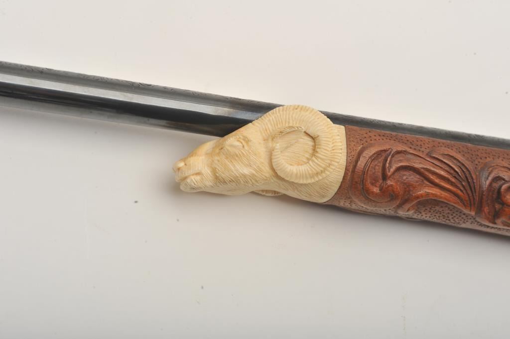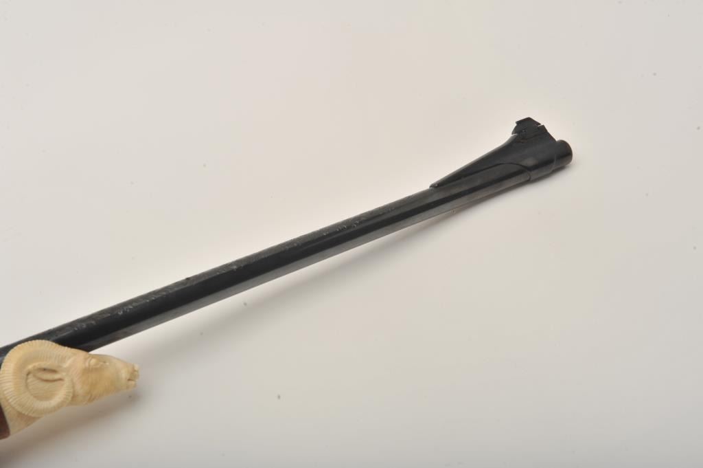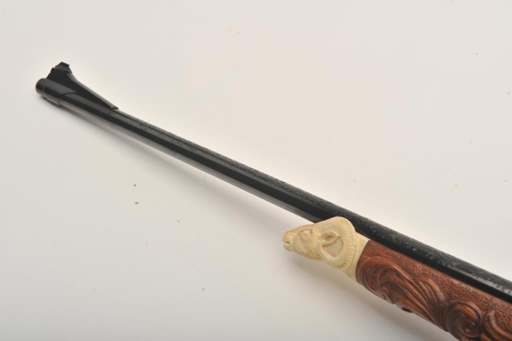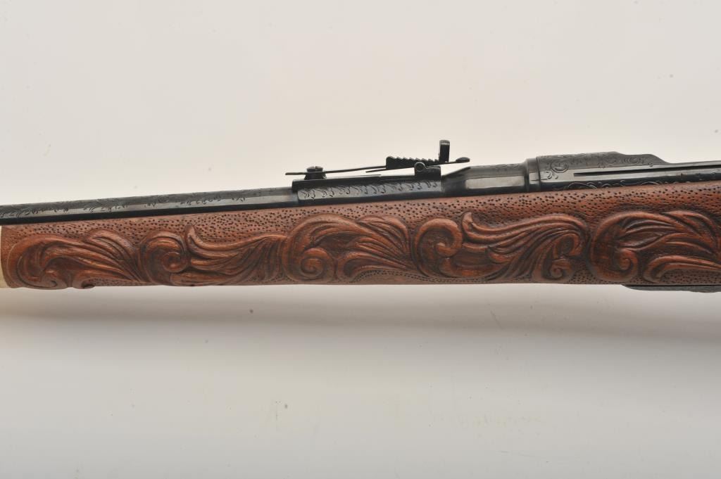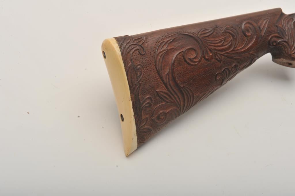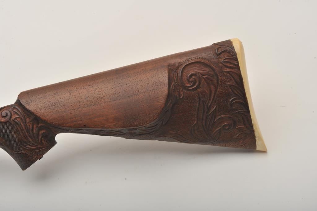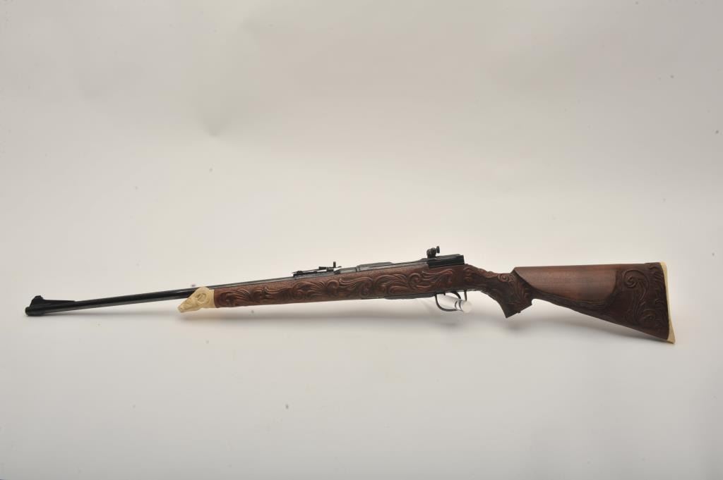 Custom Japanese Arisaka Type 99 bolt action rifle, 7.7 mm caliber, Serial #19235. The rifle is in fine overall condition with a 24” engraved barrel. The metal surfaces have been re-blued and then beautifully reliefengraved with the magazine plate featuring a ram’s head. The front and rear sights are replacements and the bolt is missing. A Lyman aperture sight has been added during the period of use. The stock is hand carvedthe entire length with a carved ivory ram’s head capping the fore end. The butt stock ends with a smooth ivory butt plate providing a 14” LOP. The work on this rifle is extraordinary and would be prohibitivelyexpensive at today’s rates. Est.: $400-$800. (C+R).