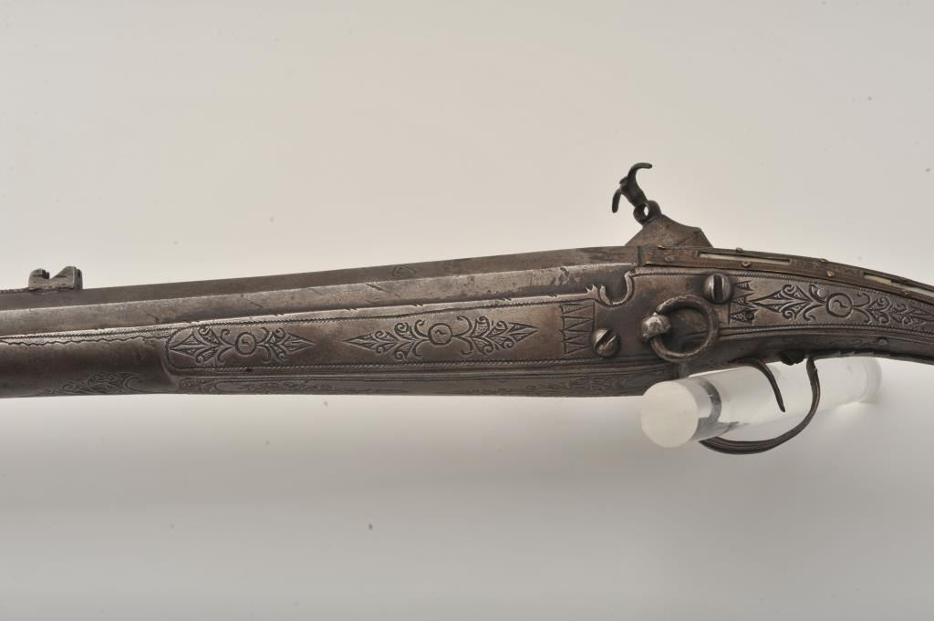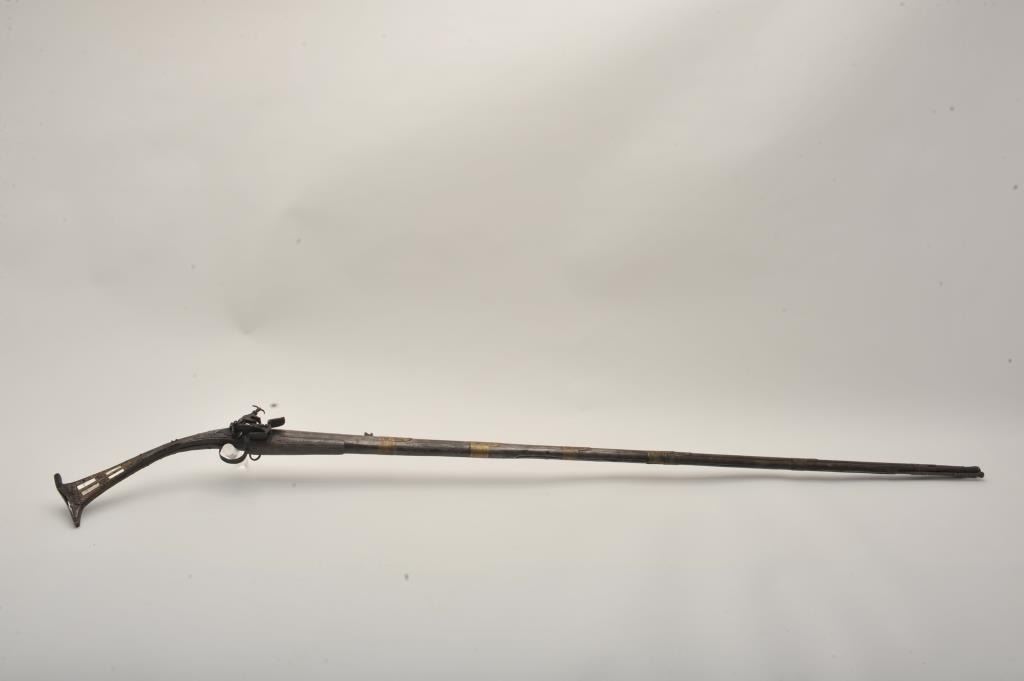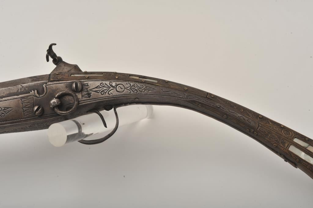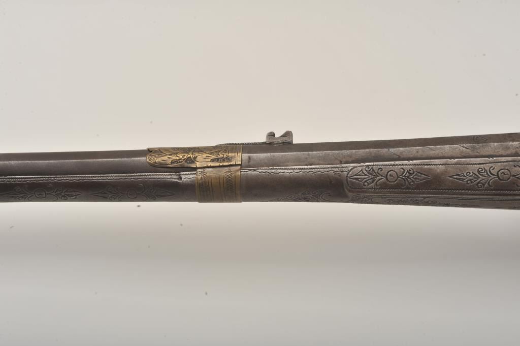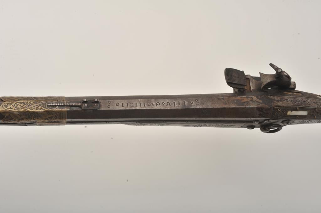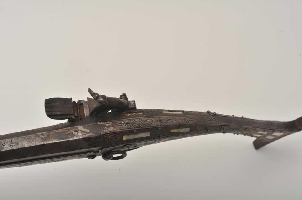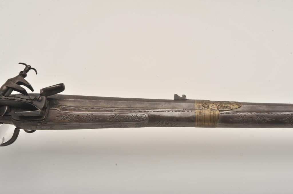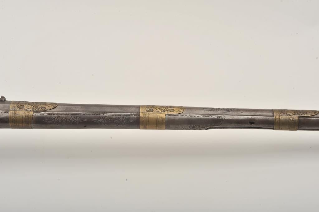 Middle Eastern flintlock Camel gun, approximately .64 caliber. The rifle is in good overall condition with a 54” round barrel. The metal surfaces have gone a brown/grey patina with light surface erosionevident and Arabic characters on top of the barrel. The barrel has 6 brass wraps along its length, each wrap is engraved. The butt and action are also lightly engraved. The butt features mother-of pearl inlay, brassinserts and brass tacks. Est.: $300-$600. (Antique).