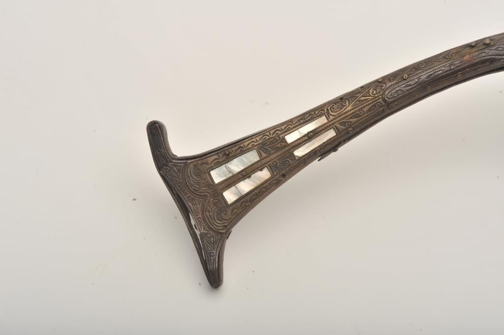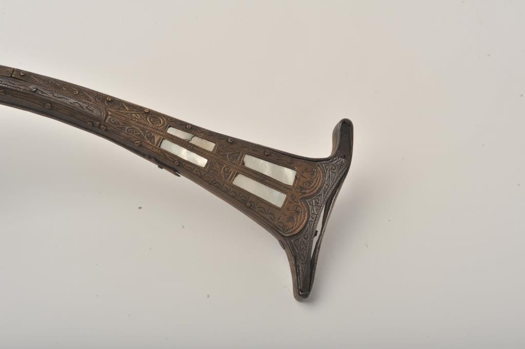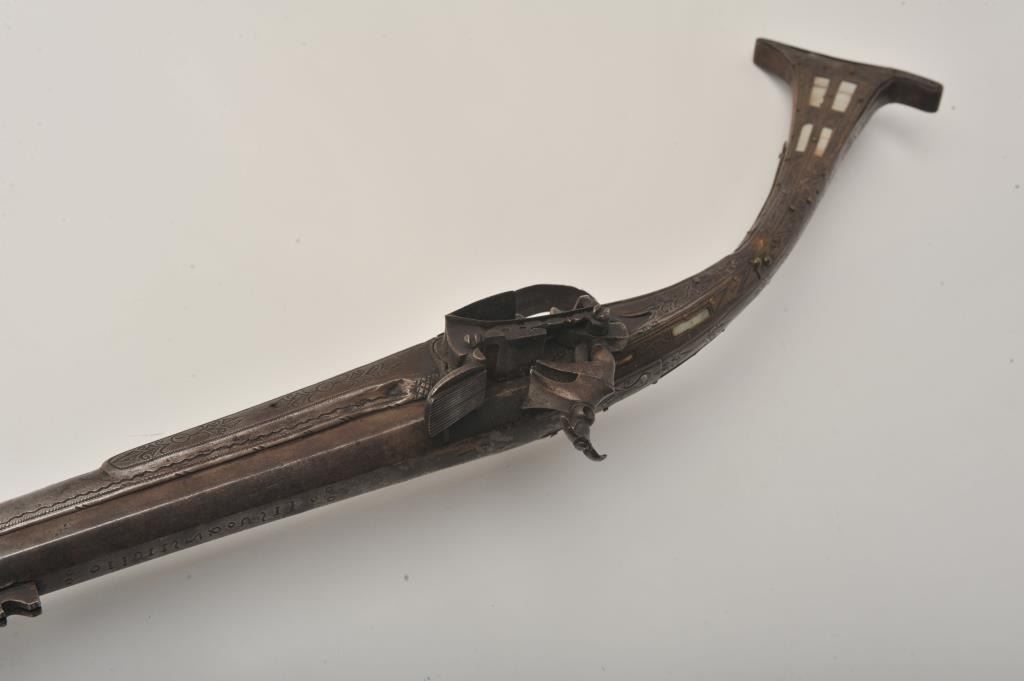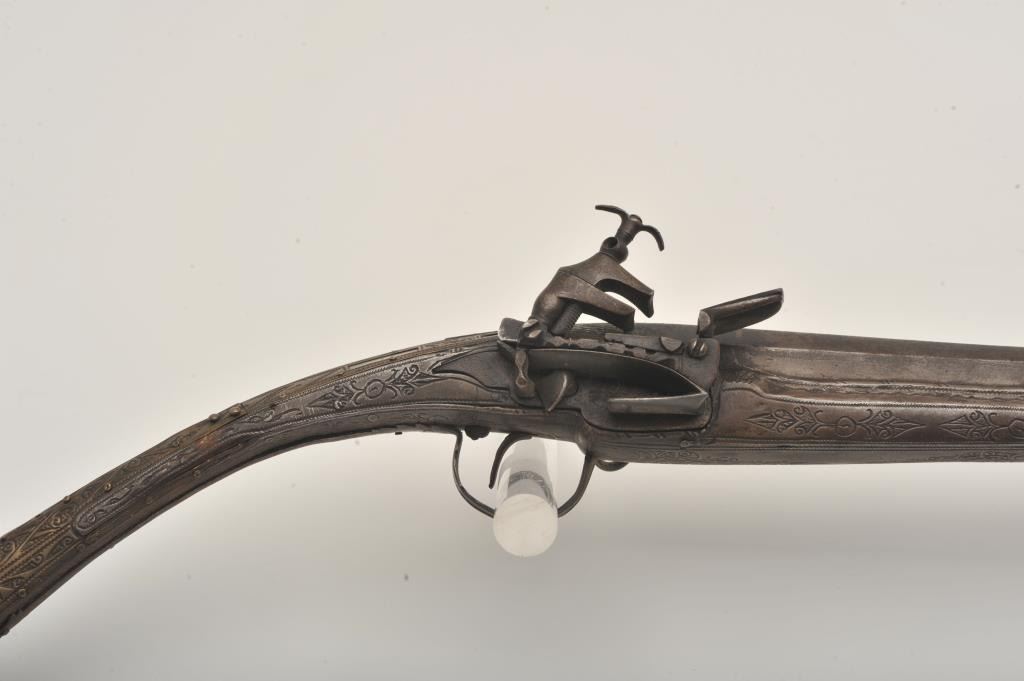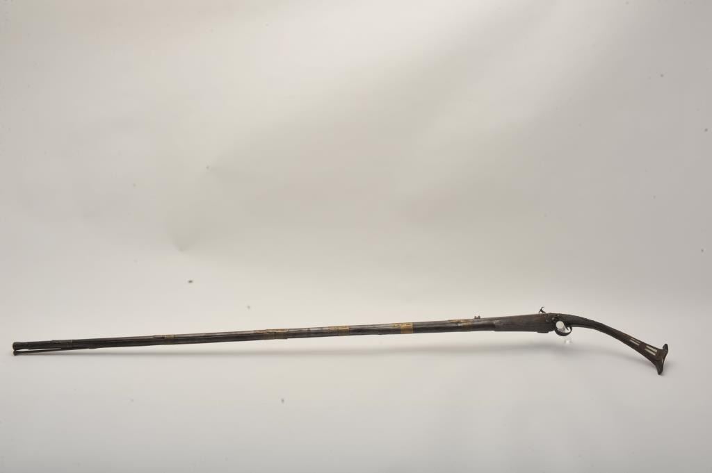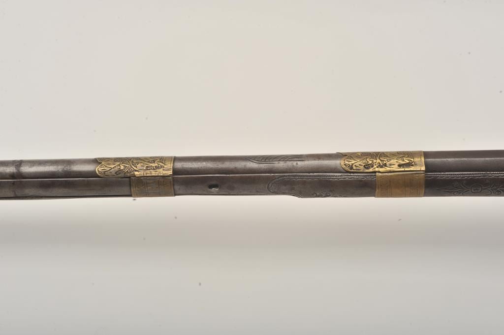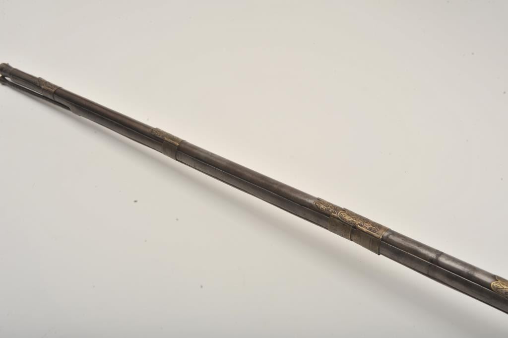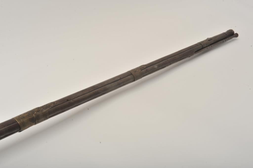 Middle Eastern flintlock Camel gun, approximately .64 caliber. The rifle is in good overall condition with a 54” round barrel. The metal surfaces have gone a brown/grey patina with light surface erosionevident and Arabic characters on top of the barrel. The barrel has 6 brass wraps along its length, each wrap is engraved. The butt and action are also lightly engraved. The butt features mother-of pearl inlay, brassinserts and brass tacks. Est.: $300-$600. (Antique).
