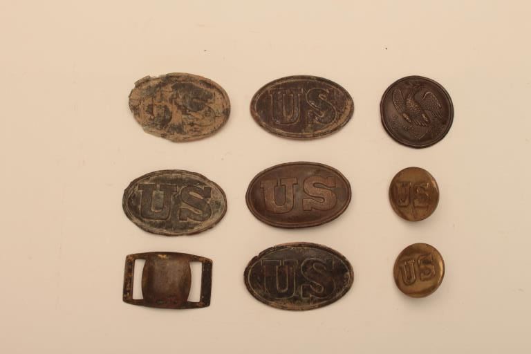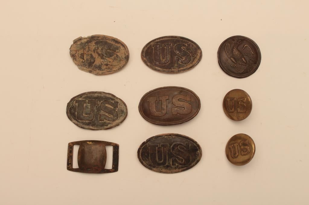 Lot of dug up (1950-60) items consisting of 5 belt buckles, eagle plate, 2 Cav. Bridle ornaments, and unidentified buckle. All period Civil War. Fair to poor condition. Est.: $100-$200
