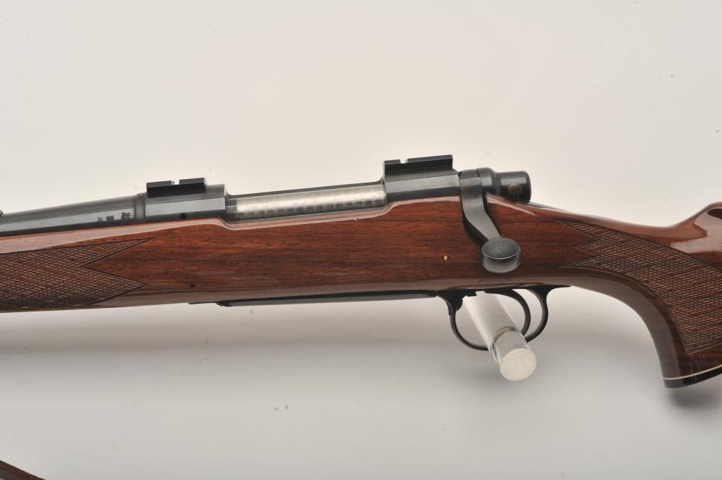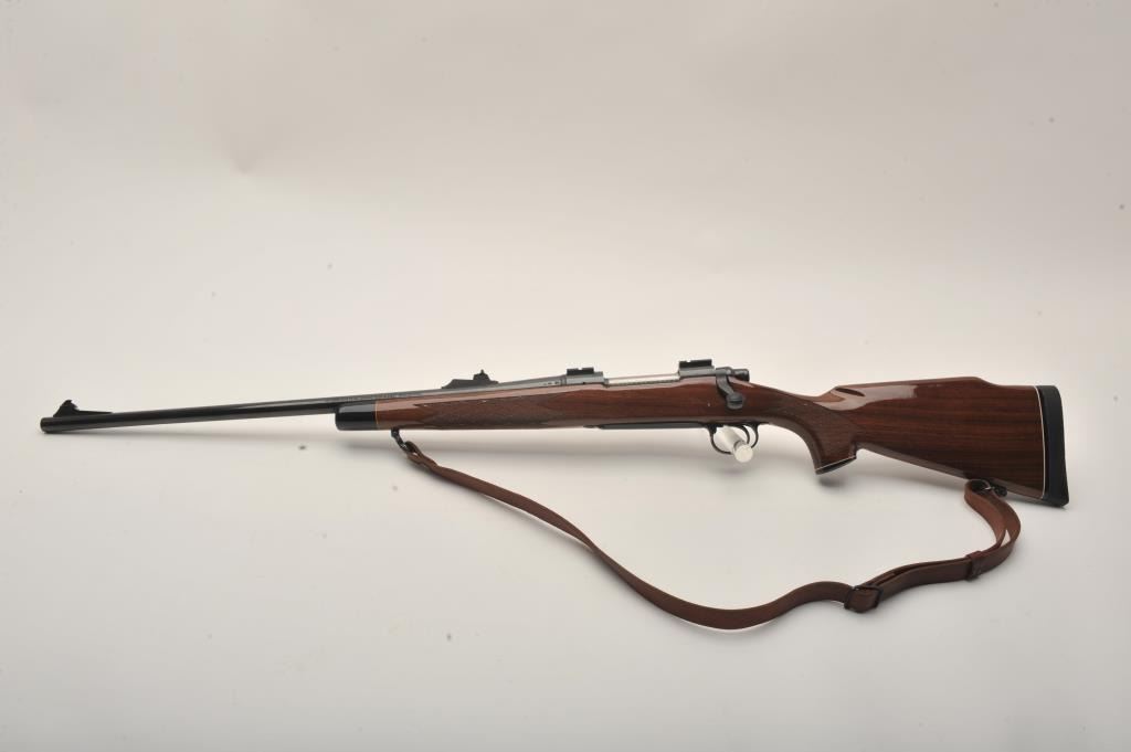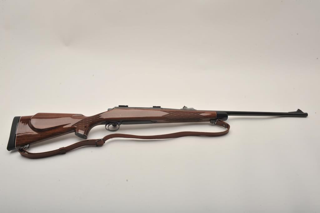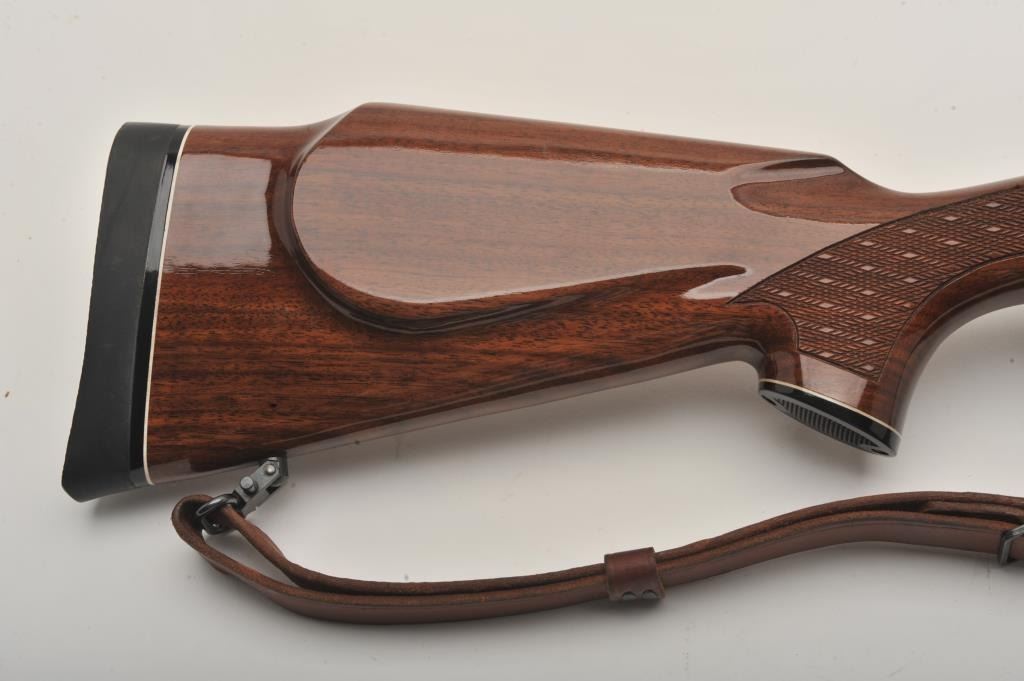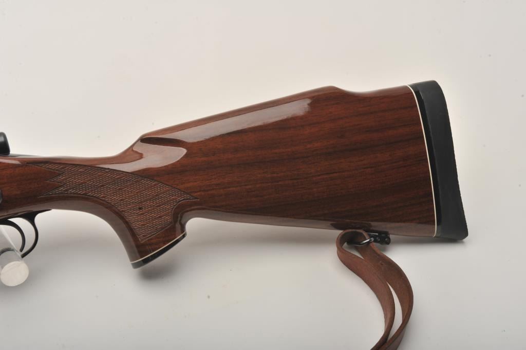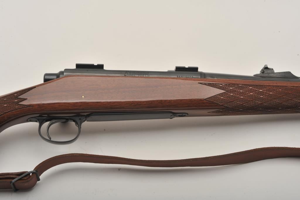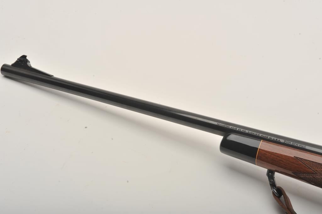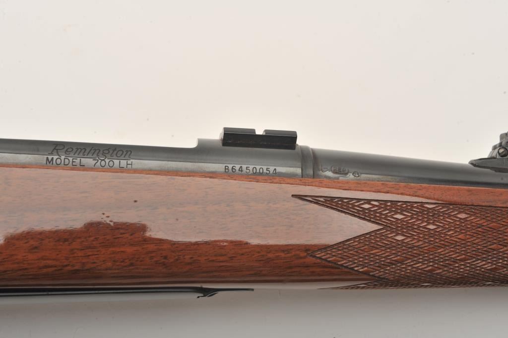 Remington Model 700 LH bolt action rifle, 7 mm Remington Magnum caliber, Serial #B6450054. The rifle is in fine overall condition with a 24” barrel with a ramped blade front and adjustable rear sights. Themetal surfaces retain nearly all of their blue finish with only small marks from carry and use noted. The finely checkered high gloss wood stock is in very good condition with small mars and scrapes. The butt stockends with a rubber Remington marked butt pad and the rifle is topped with Weaver style scope bases. The bore is good, the action is crisp and markings are sharp on this desirable left-handed sporting rifle. Thelot includes a smooth leather sling and sling swivels. Est.: $500-$800. (Modern).