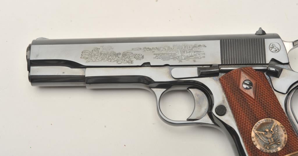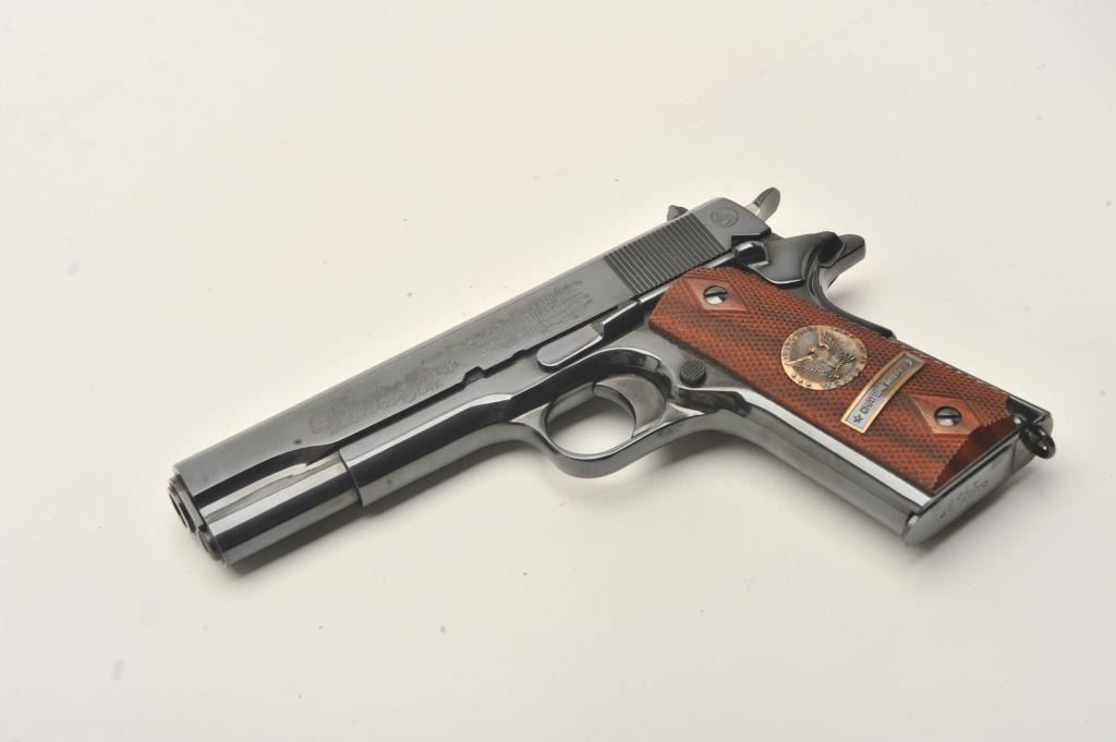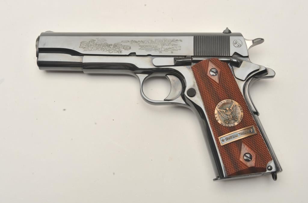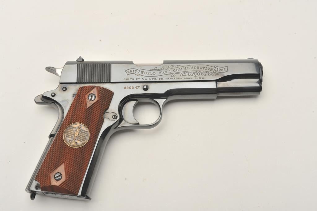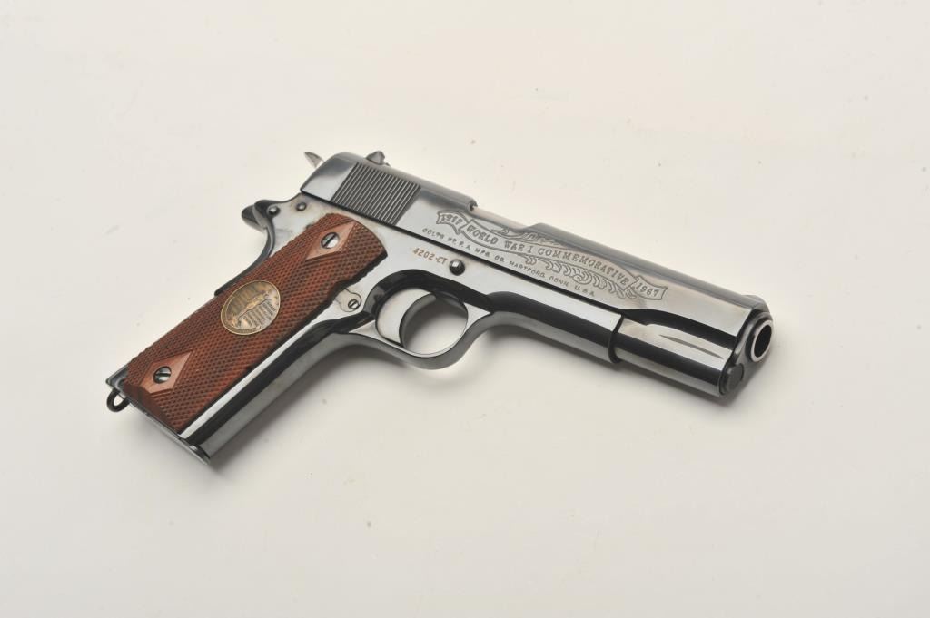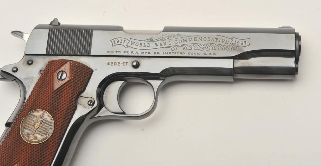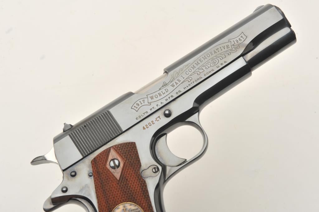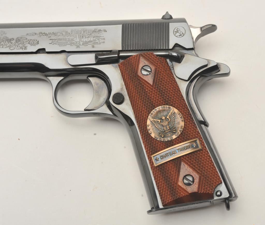 Colt WW I Commemorative (1917-1967) 1911 style Chateau Thierry semi-automatic pistol, .45 caliber, 5” barrel, blued finish, S/N 4202-CT, in overall fine condition with majority of original finish, fine bore, crisp action, sharp markings and fine grips. (C&R). Est.: $700-$1,400.