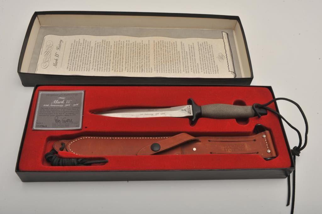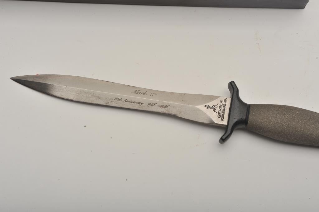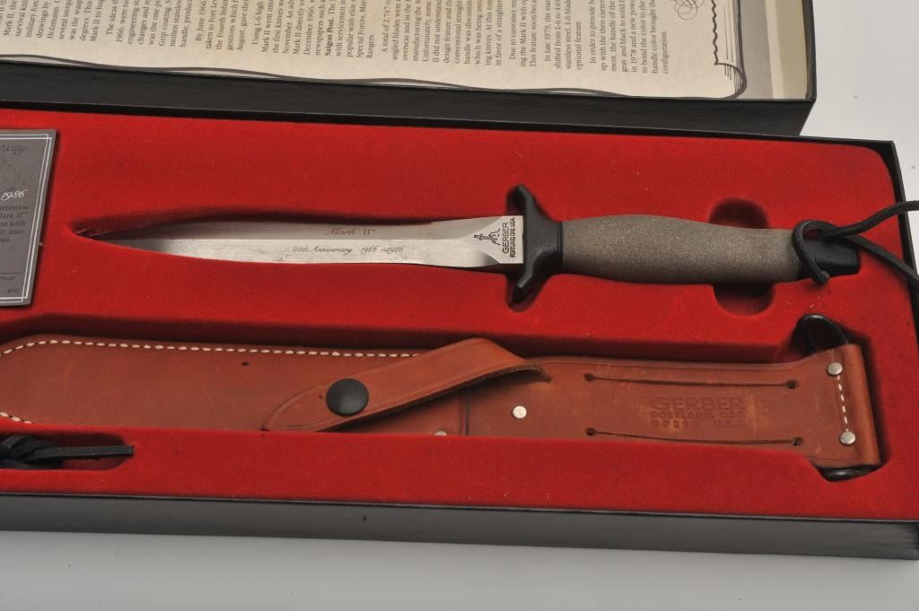 Gerber Mark II 20th Anniversary 1966-1986 survival knife, with leather sheath and presentation box Serial #01749. This knife is one of 5,000 produced in celebration of the 20th anniversary of the Gerber Mark II.The knife is 12” in overall length with a 7” blade, with a powder coated stainless steel handle and leather lanyard. The lot includes a leather scabbard with lanyard and the original factory box with all associatedpaperwork. The knife is as new in the box with some light discoloration to the blade. Est.: $150-$300.