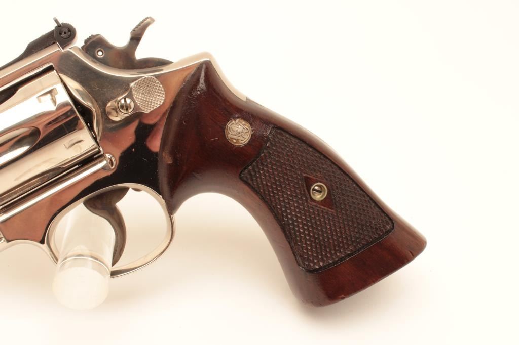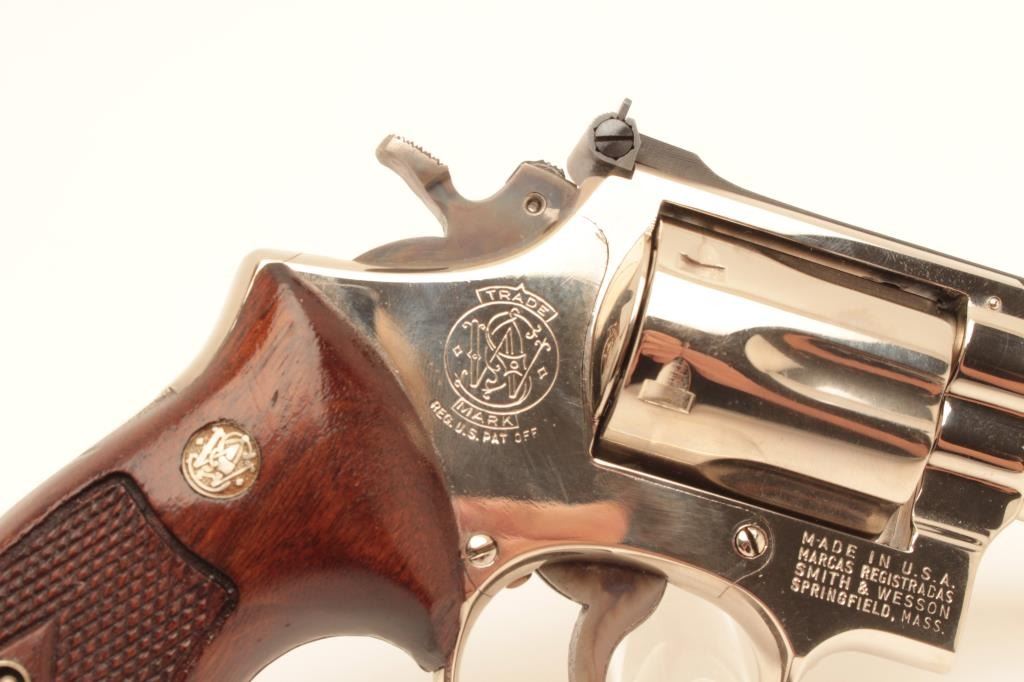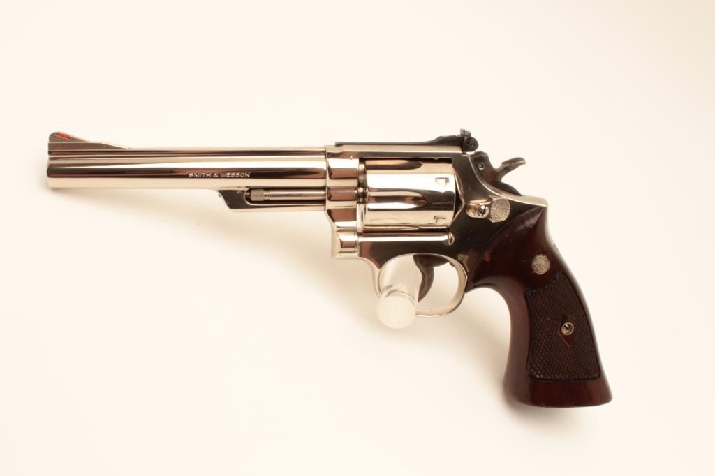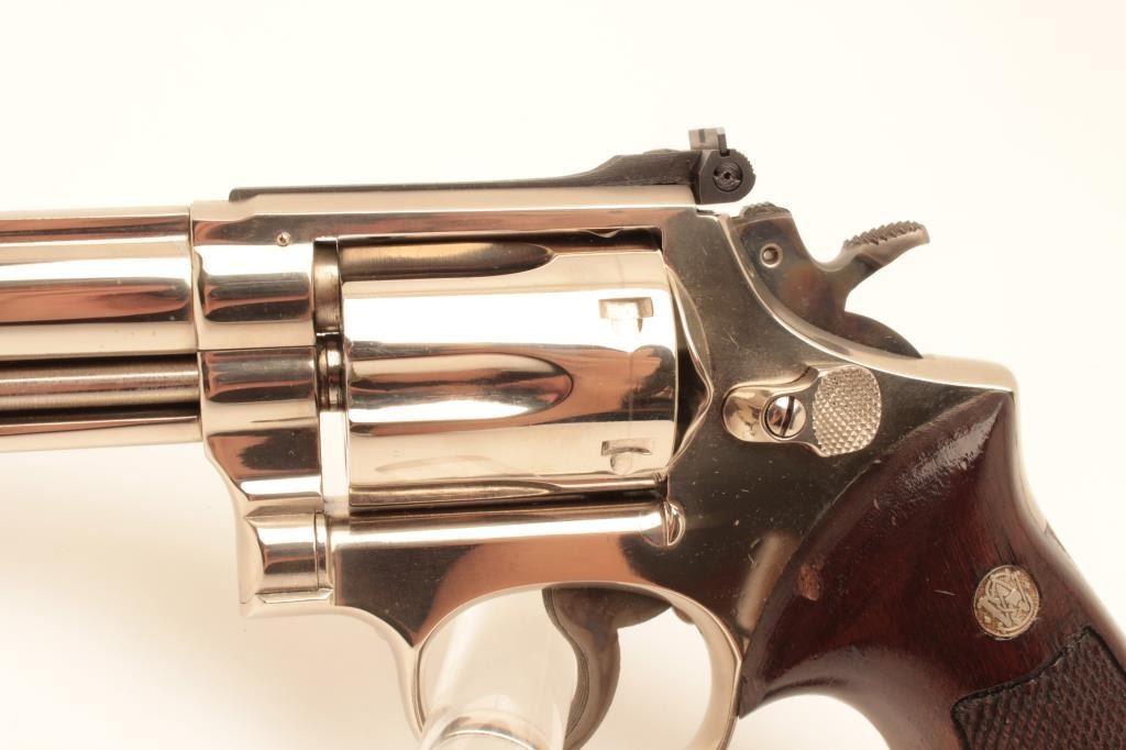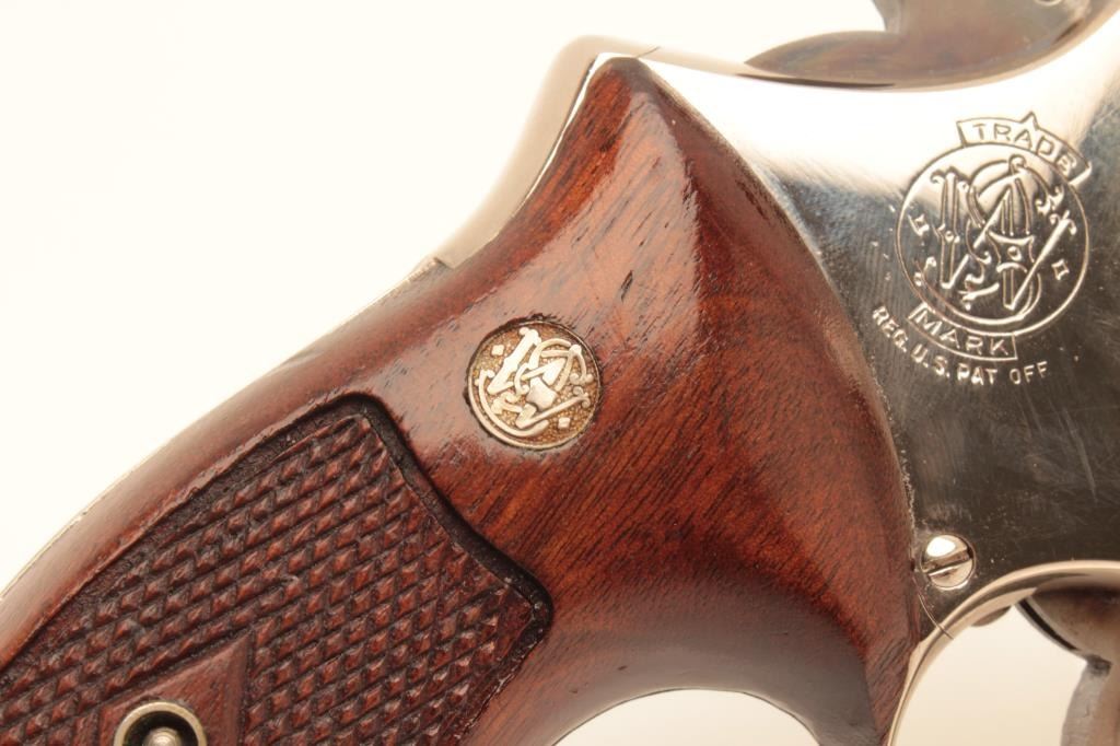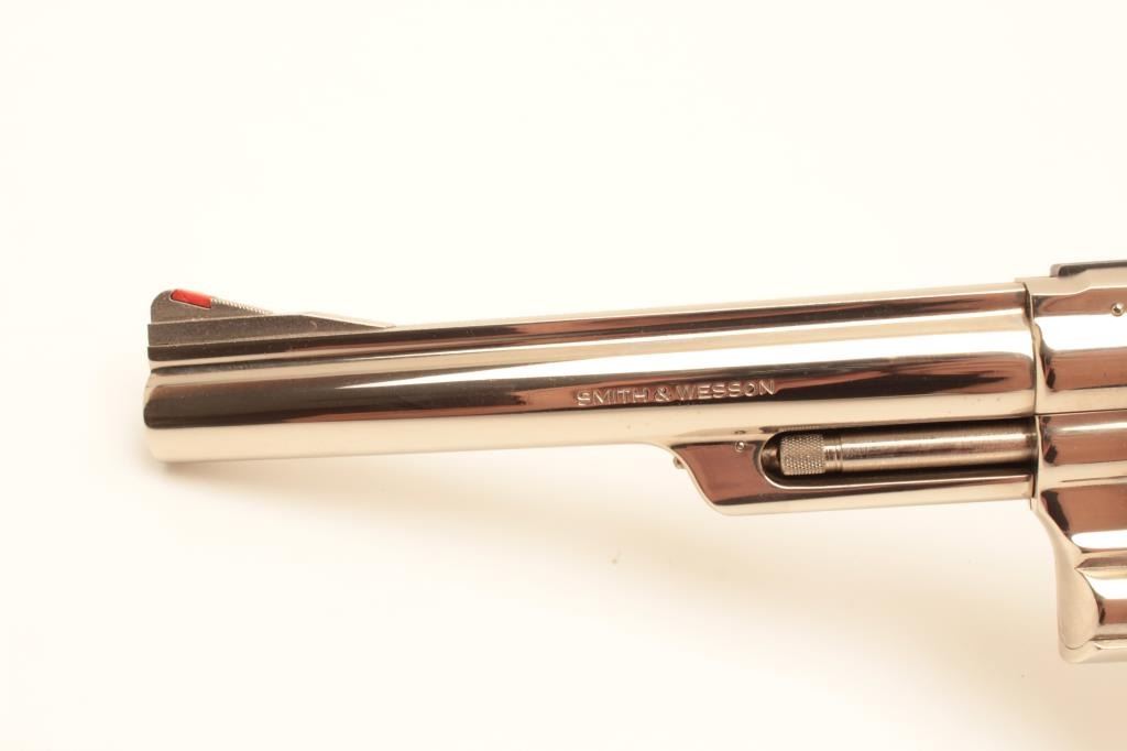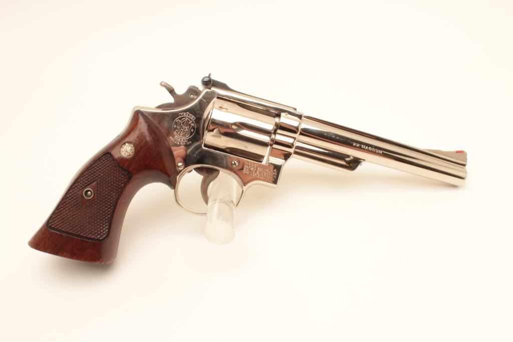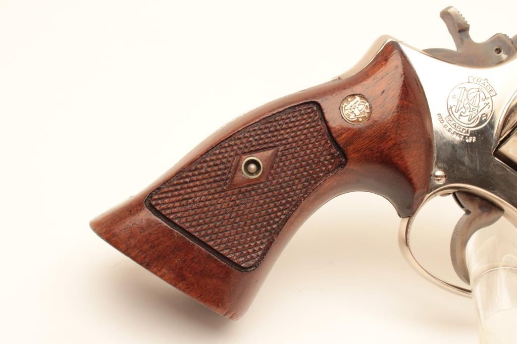 Smith & Wesson model 53 (no dash) DA revolver, .22 Magnum caliber, 6” barrel, nickel finish, checkered wood medallion combat grips, S/N K445412; in near new condition with factory two piece cardboardbox and inserts; second cylinder not present with this gun. (C&R). Est.: $1,250-$2,500.