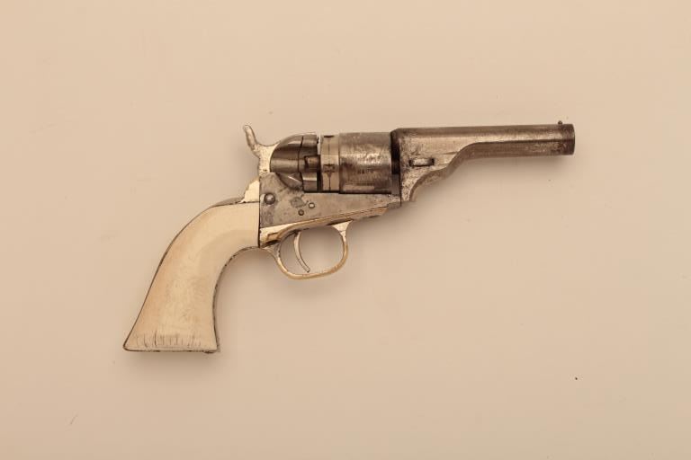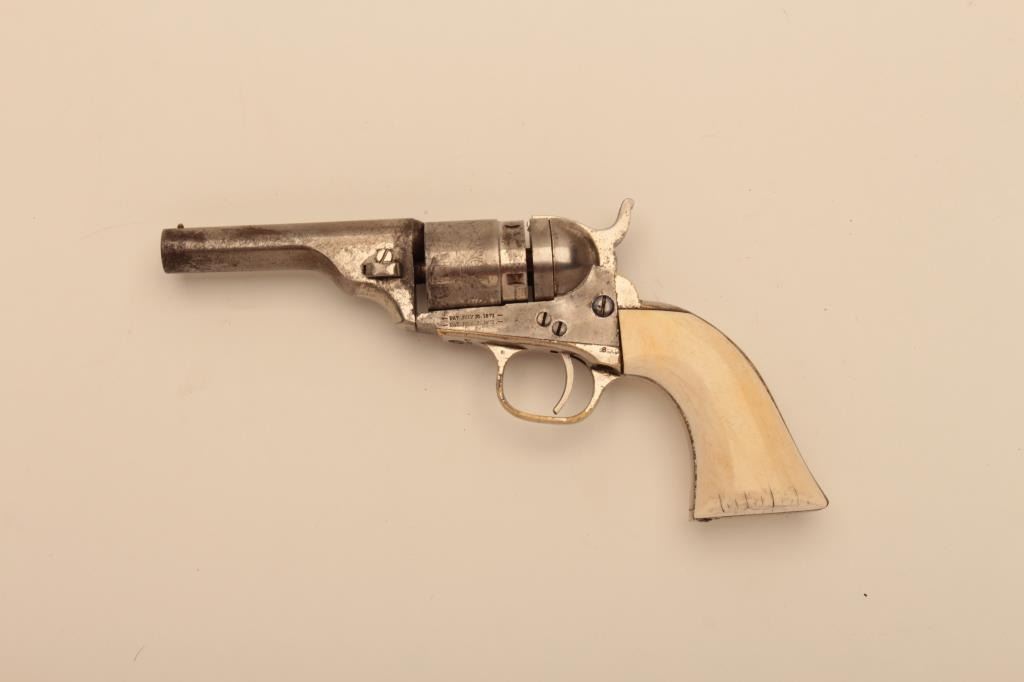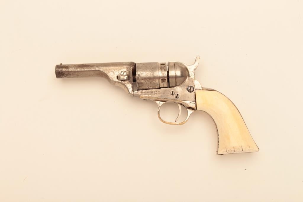 Colt 1871-72 conversion of pocket navy to .38 Rimfire with a 3 ½”: round barrel, nickel plated, and ivory grips, S/N 305873 and stamped on butt “O.E. Reed.” 50%-60% original nickel with good markings, excellent actionand bright bore. Some nicks, scratches and normal wear. The grips are original and very good plus with age cracks. A nice original frontier era Colt pistol that has a researchable name in butt. (Antique) Est.:$1250-$2500