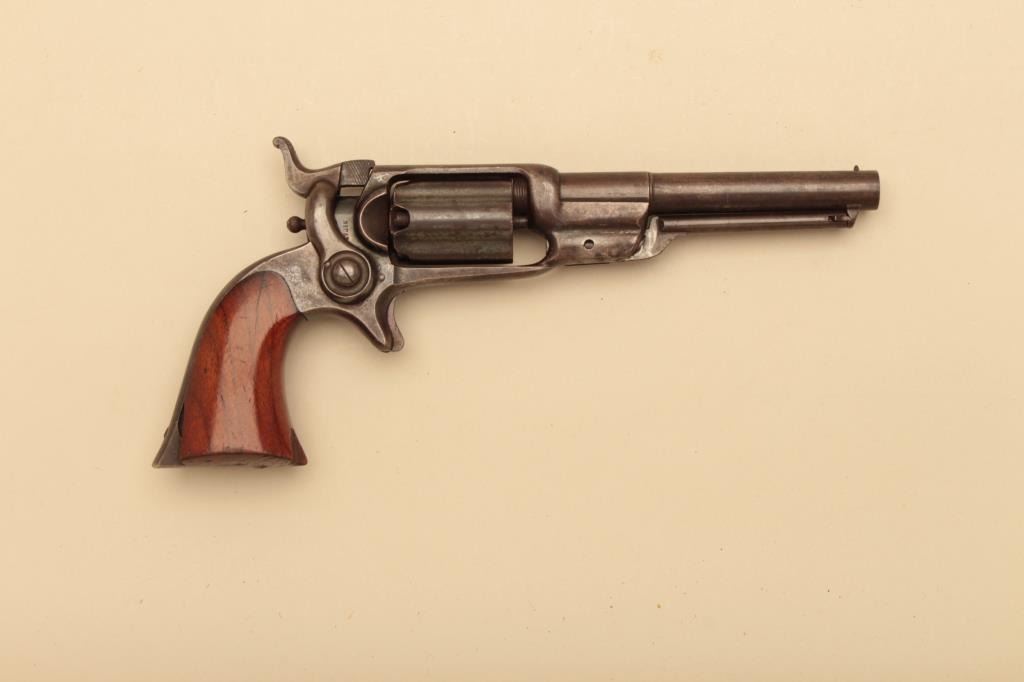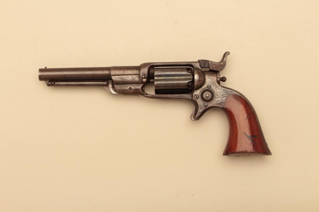 Colt Model 1855 Root Revolver .31 caliber with a 4 ½” barrel and fluted cylinder, S/N 6071. 5A variation. This root retains 50%-70% original blue with minor erosion and pinprick pitting just starting. The gripshave 2 major chips and losses 2 minor with balance of grips showing most original varnish. Good barrel address and patent dates in flutes of cylinder. (Antique) Est.: $1000-$2000