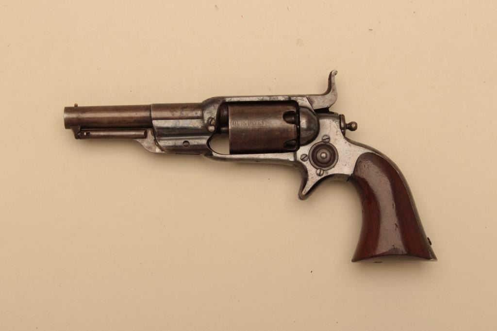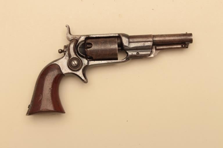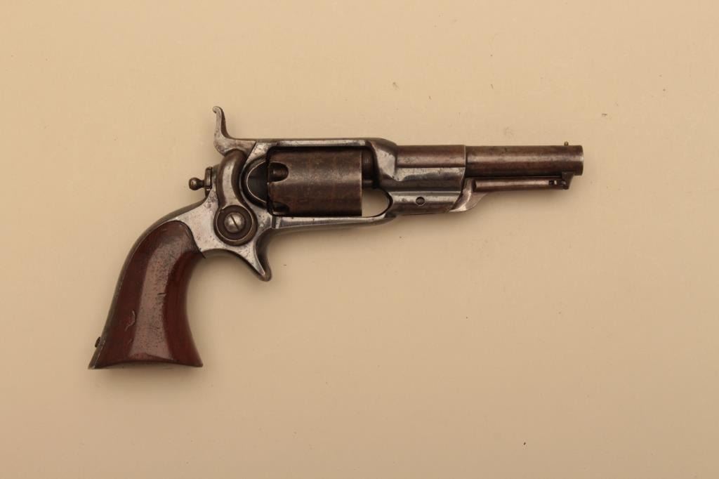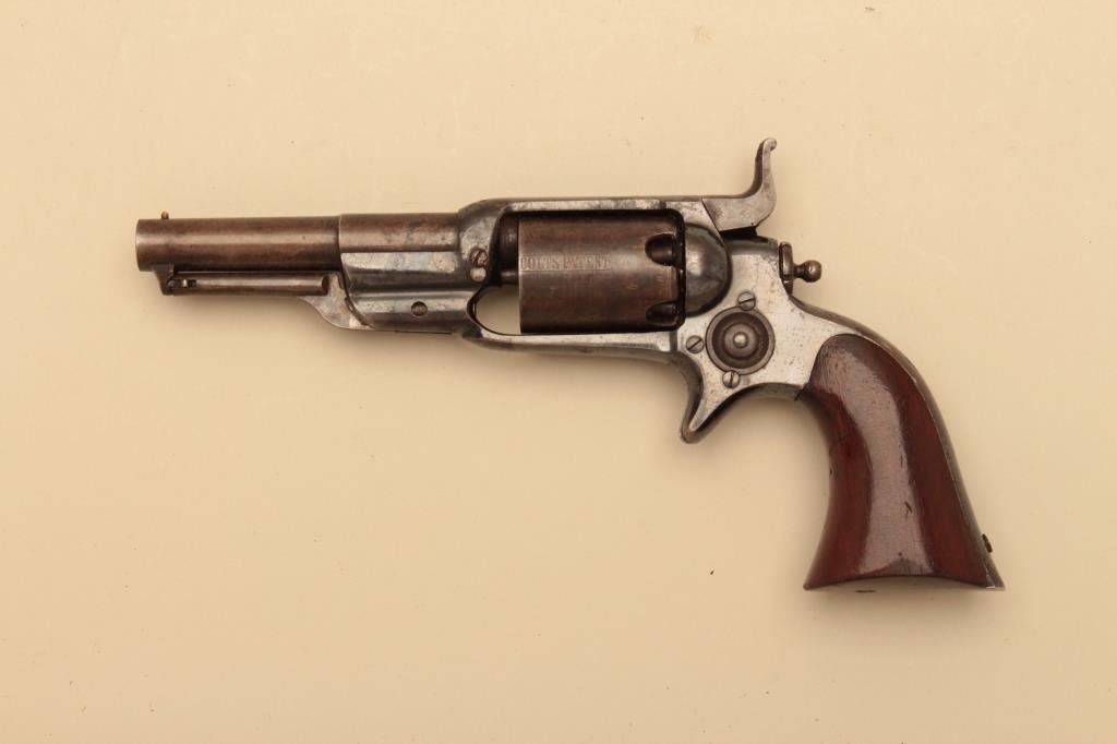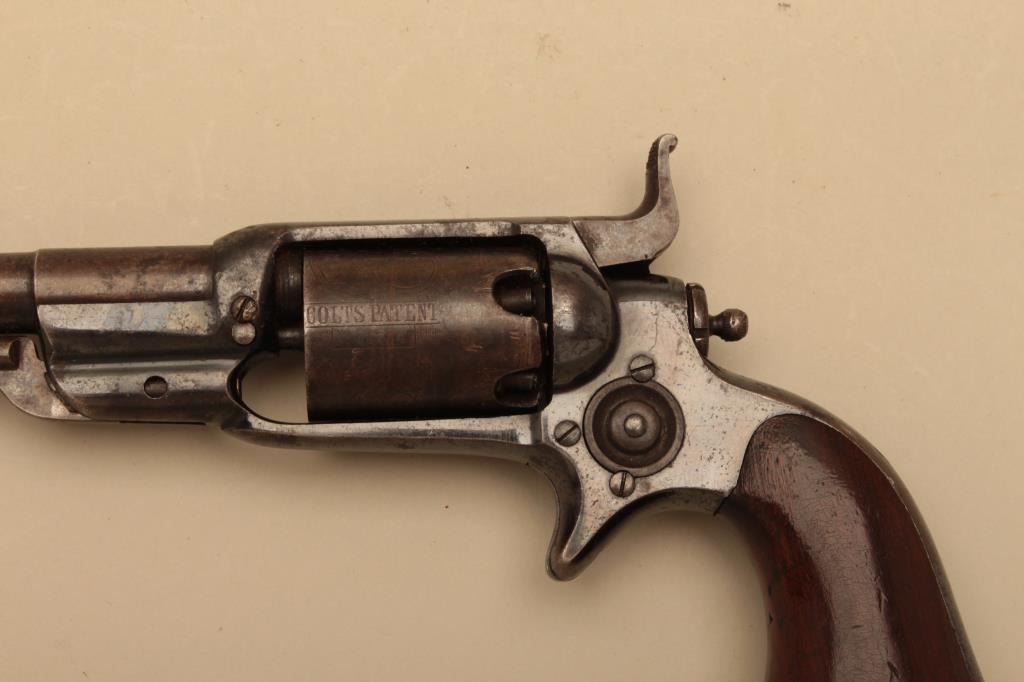 Colt Root .31 caliber revolver with a 3 ½” round barrel and unfluted cylinder, S/N 10534. 6th variation remaining in very good plus condition with 50%-70% bright original blue and balance drifted pleasing patina.Most stage coach scene visible under magnification. Very good grips with 75%-85% original varnish showing wear at the bottom edges. Good markings. 50% plus case colors on hammer and loading lever. Action working.(Antique) Est.: $1750-$3500
