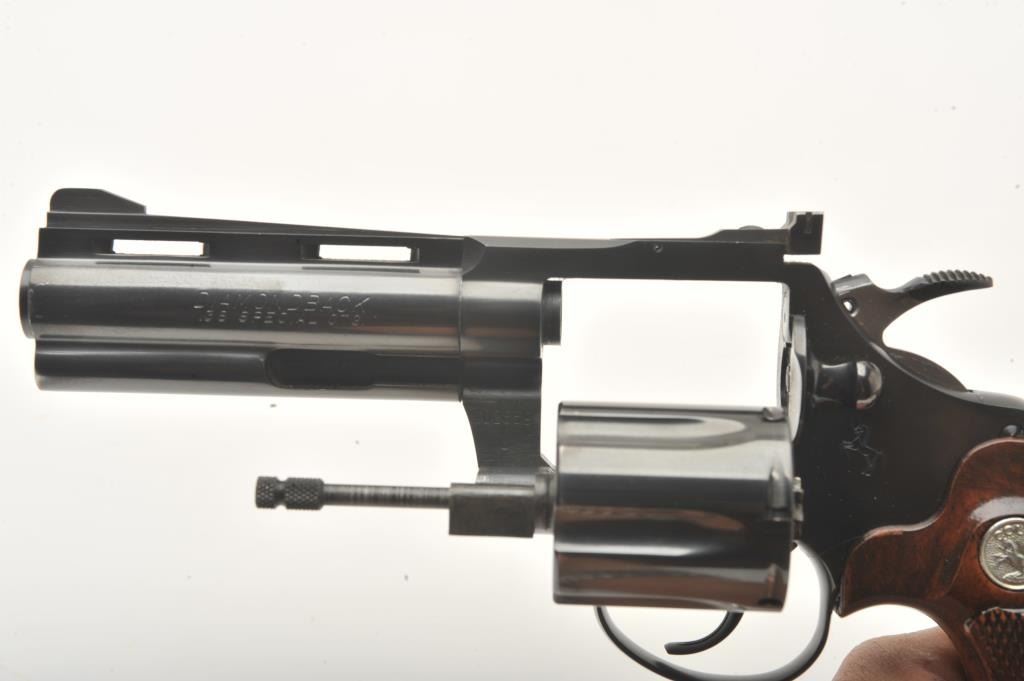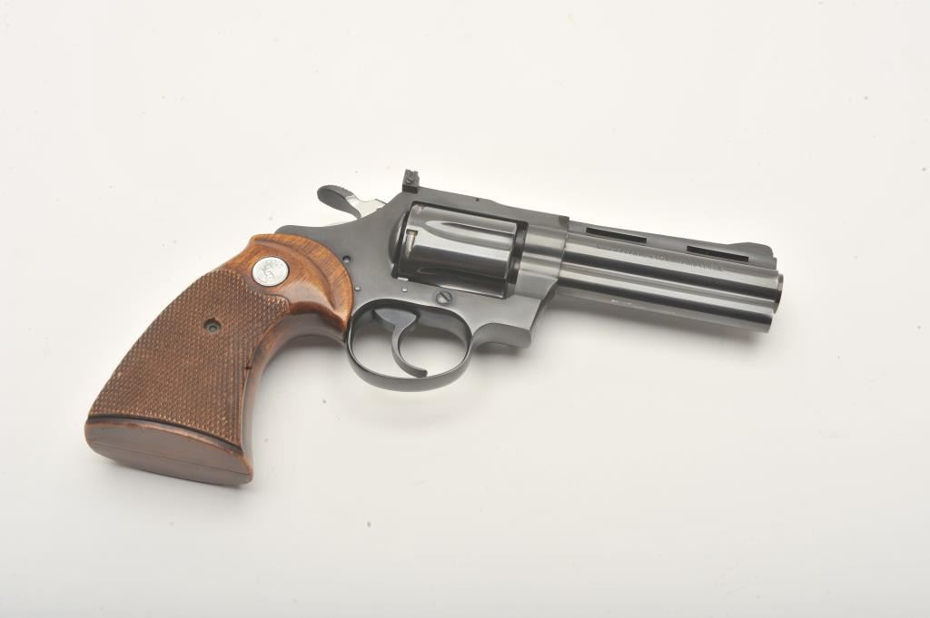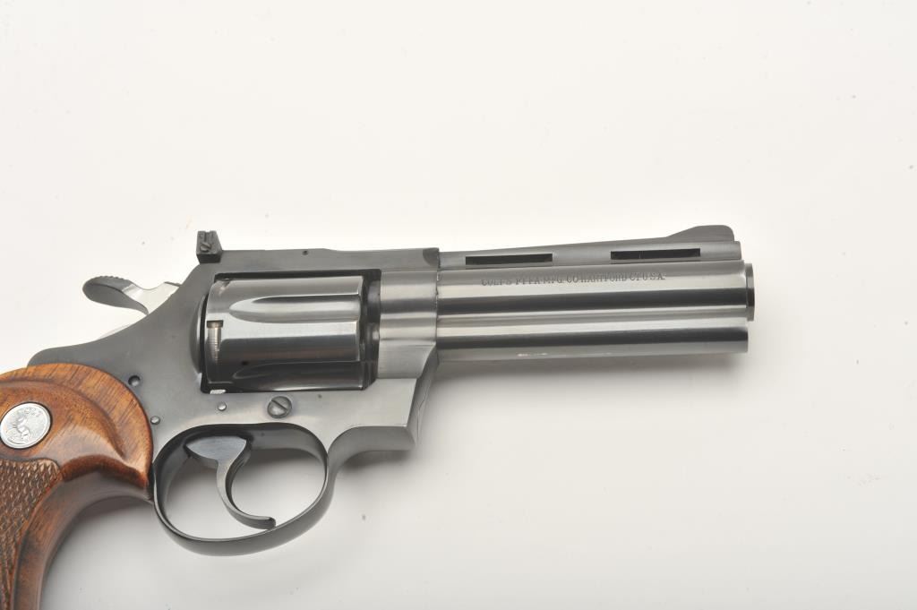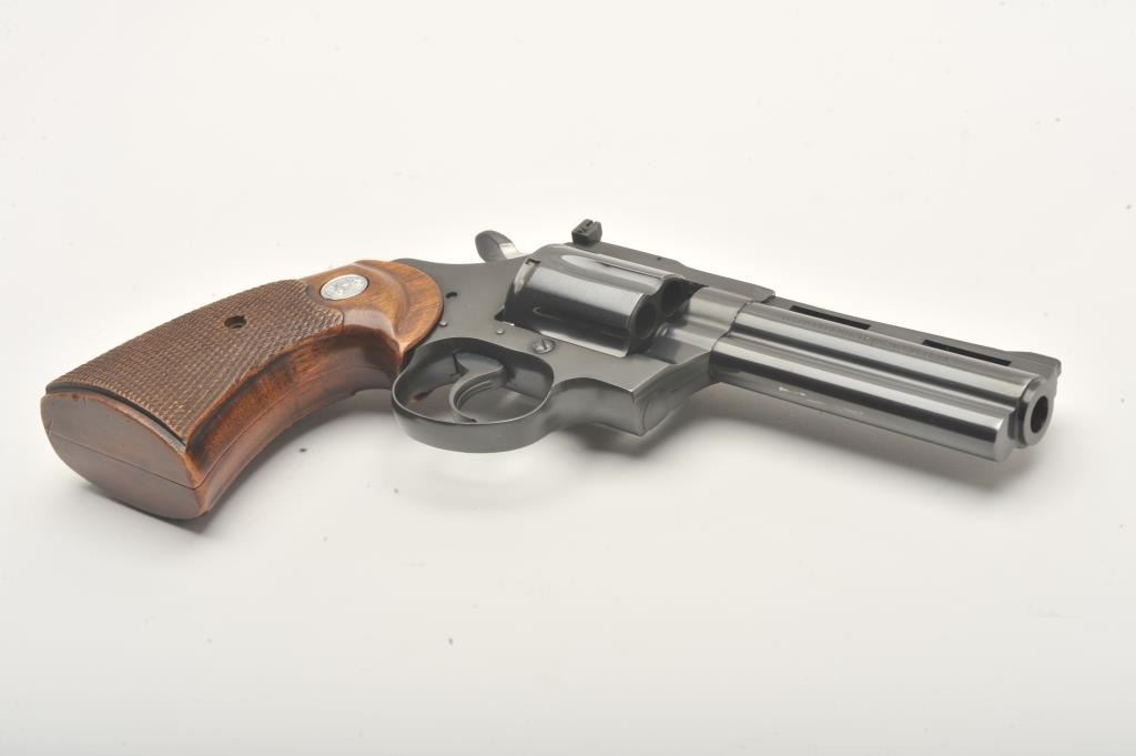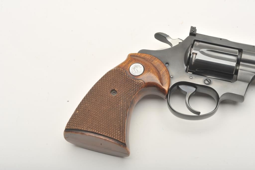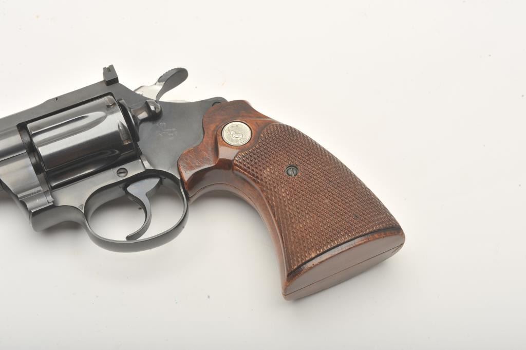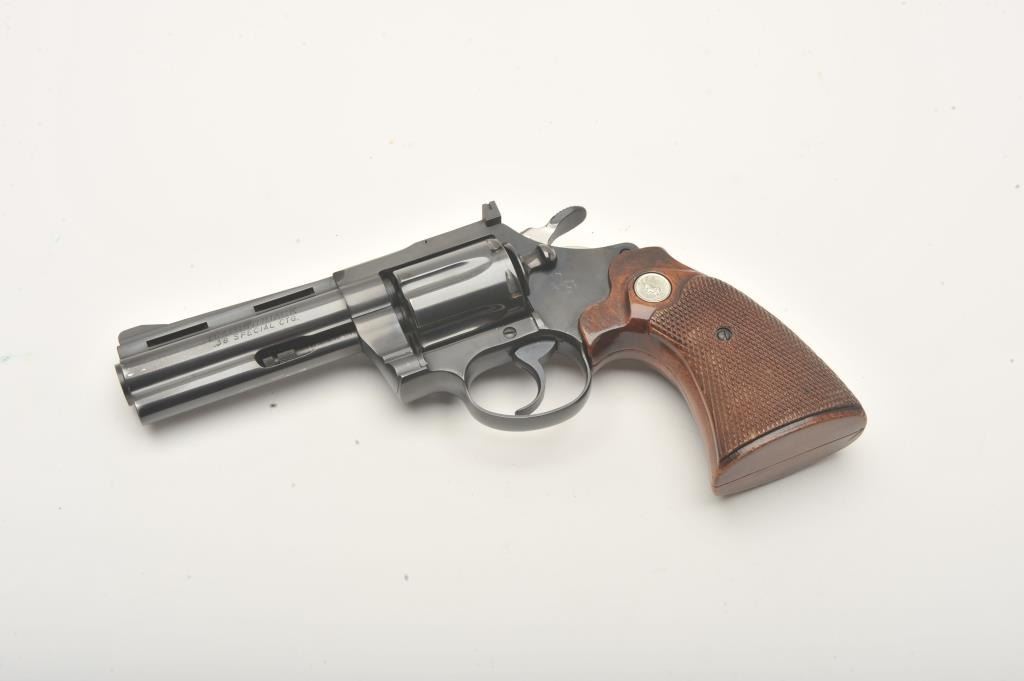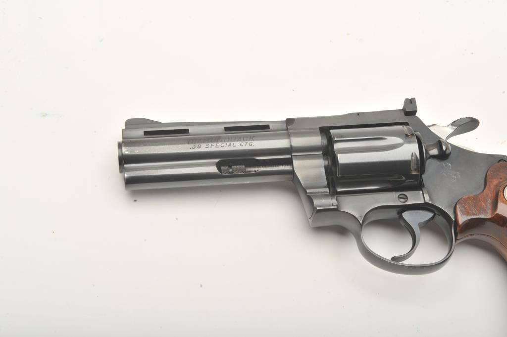 Colt Diamondback revolver, .38 Special caliber, Serial #D2659. The pistol is in fine overall condition with a 4” barrel with a full-length ventilated rib with a ramp front and adjustable rear sights. The pistol retains nearly all of its high polish blue finish with light holster wear at the muzzle and a faint drag line on the cylinder. The checkered wood medallion grips are in very good condition with sharp checkering andsmall mars from carry and use. The bore is good, the action is crisp and markings are sharp on this desirable Colt. Est.: $1,000-$2,000. (Modern).