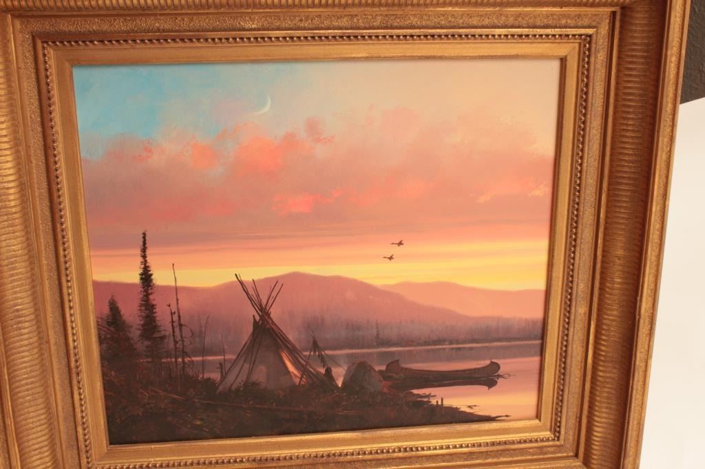 Original oil painting on board signed lower left “Michael Coleman”. Measures 10” x 14”. Great western Teepee scene. Excellent condition. Est.: $1500-$3000