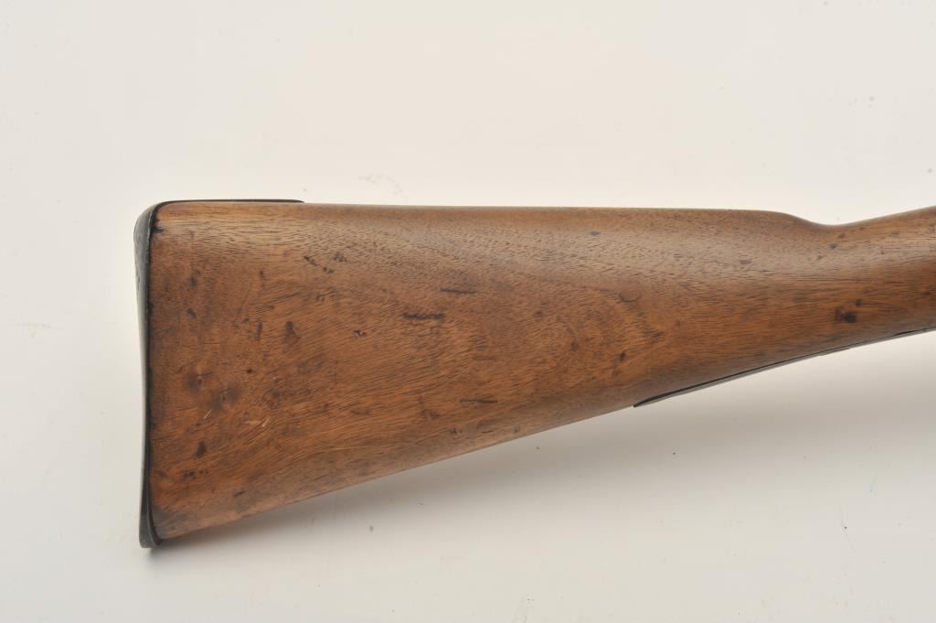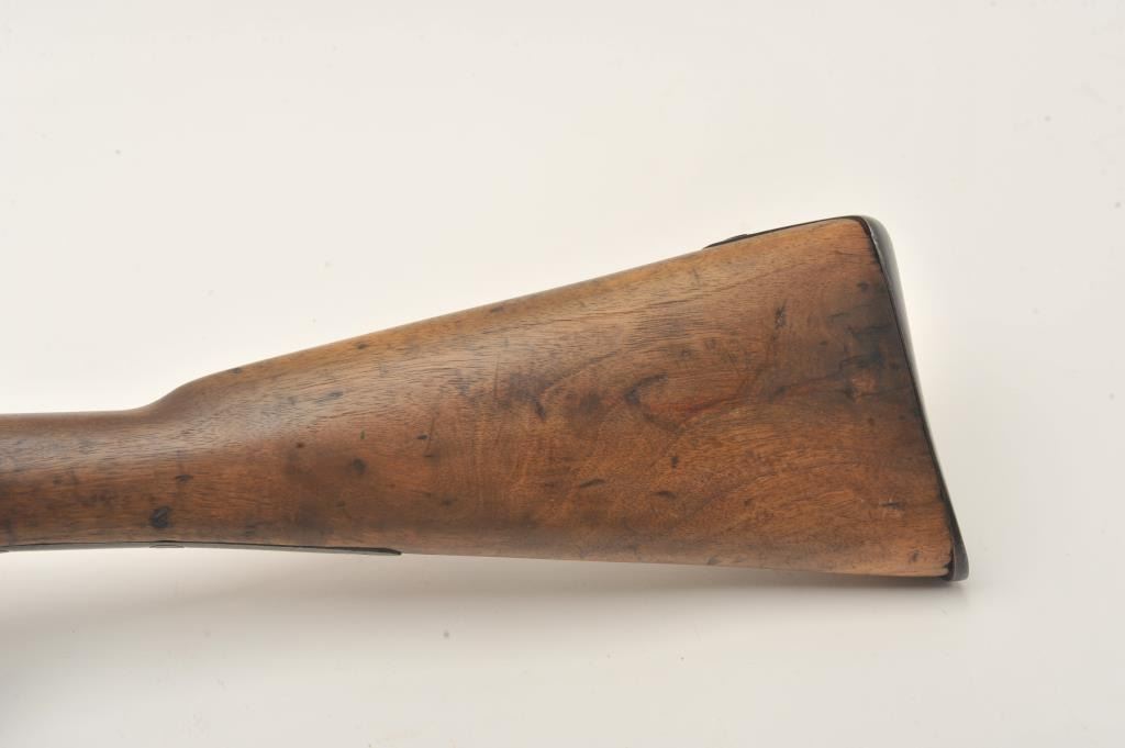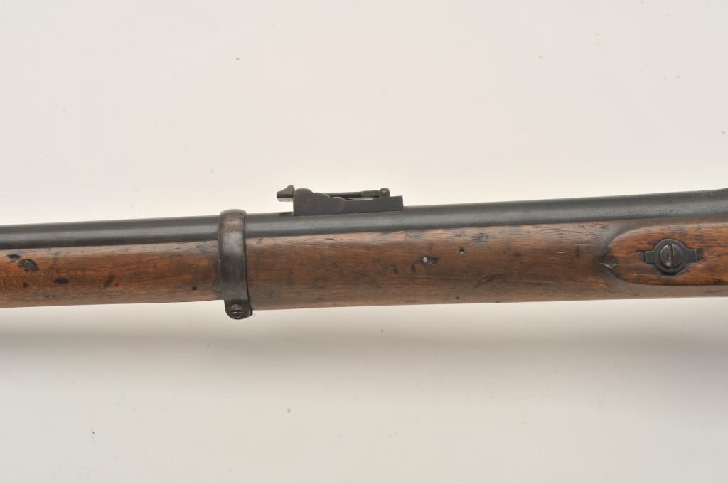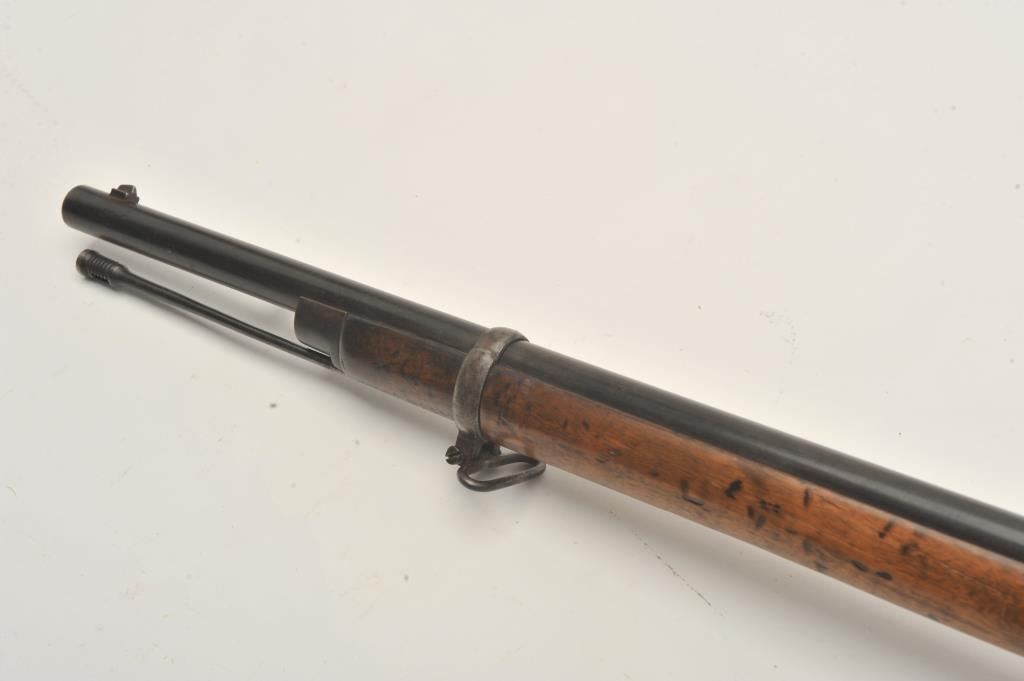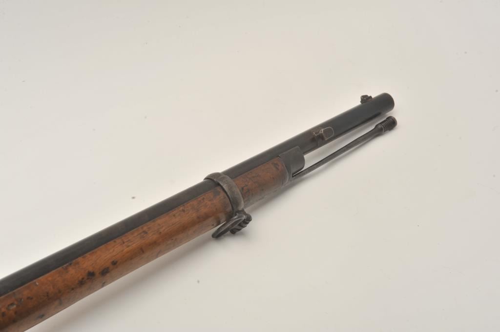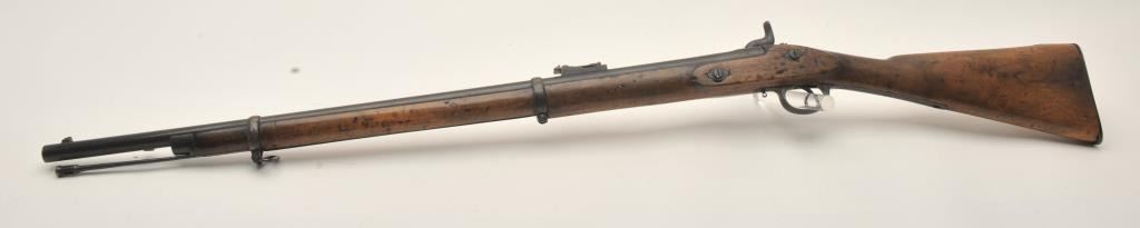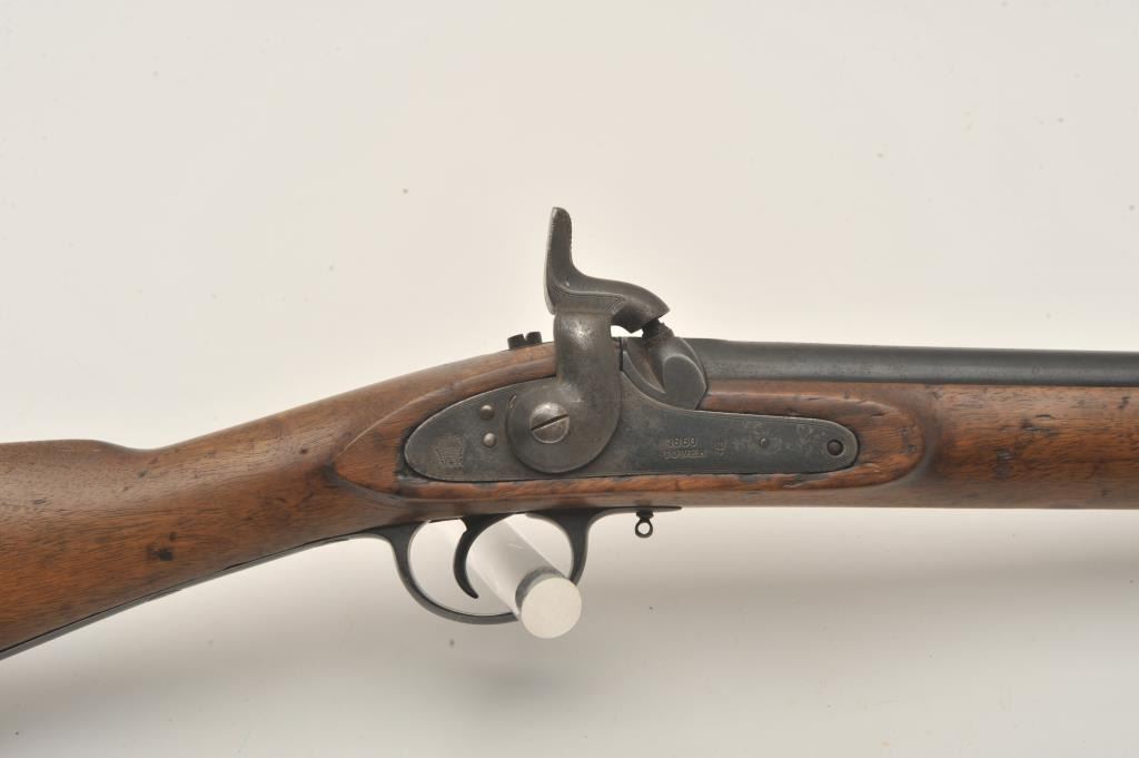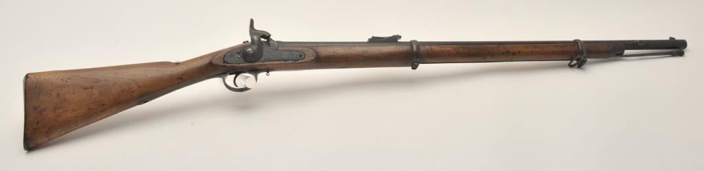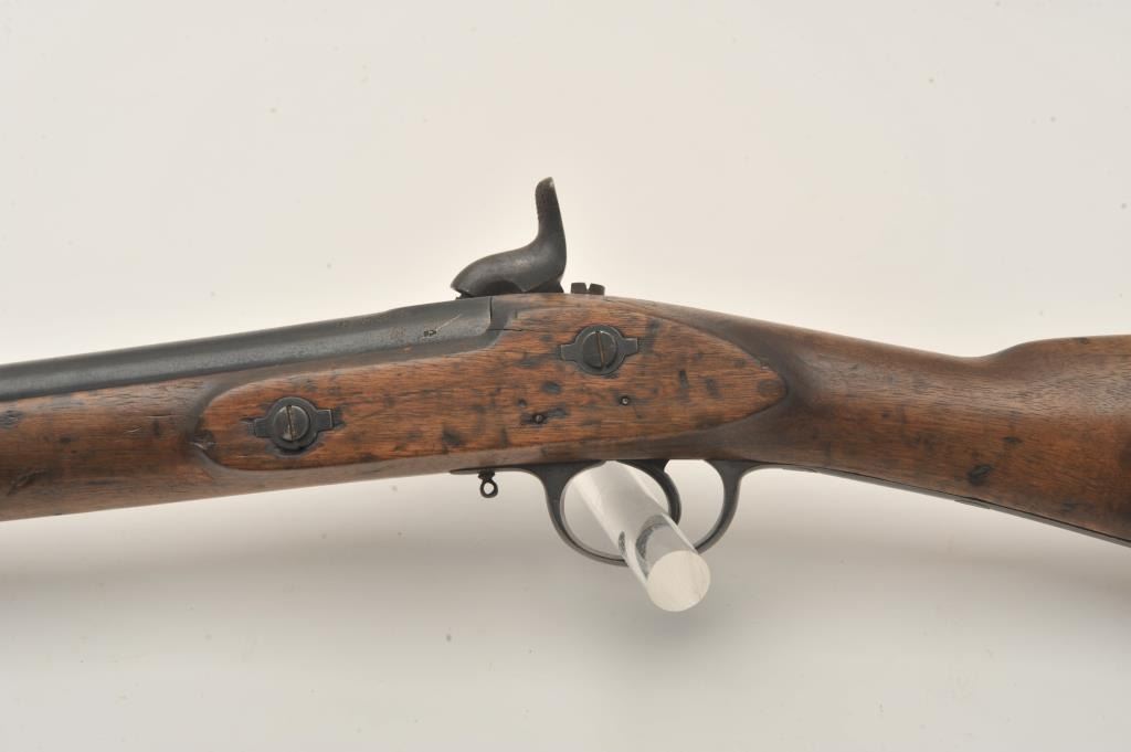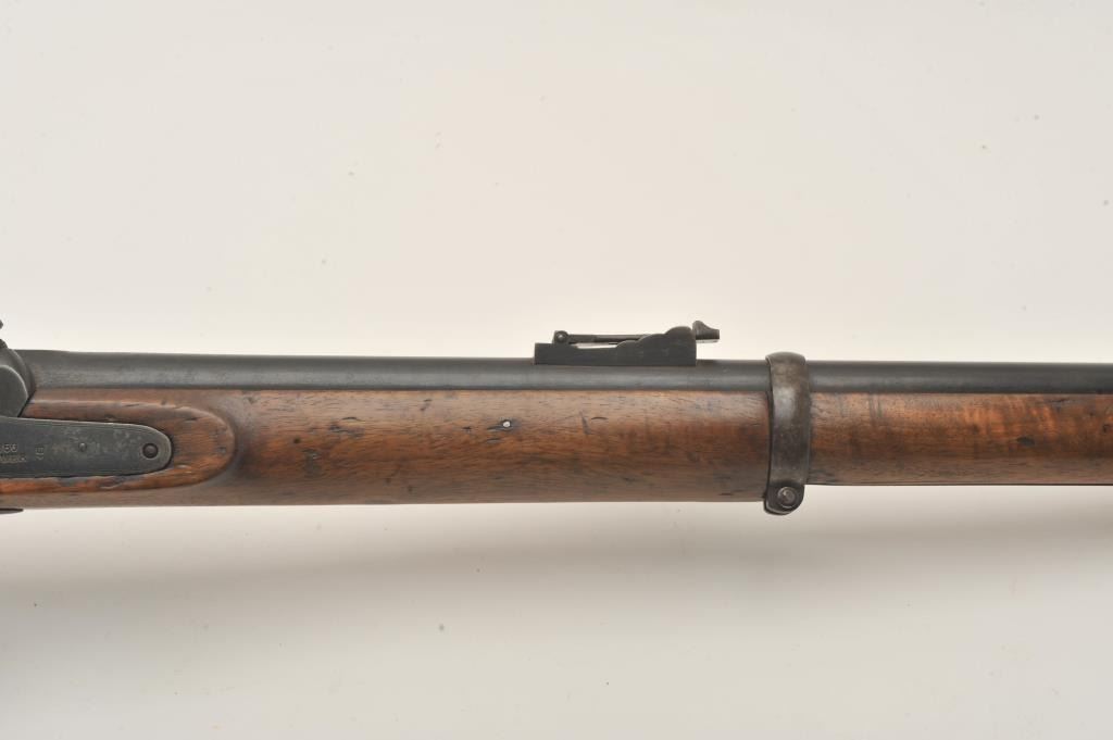 Tower 1860 percussion rifle, .58 caliber, 33” barrel, blued finish, wood stock, iron ramrod, in overall good + condition displaying considerable muted blued finish mixed with brown patina, crisp action, goodmarkings, overall good wood with some old scattered nicks, mars, stain spots and scratches from carry and storage. (Antique). Est.: $350-$700.