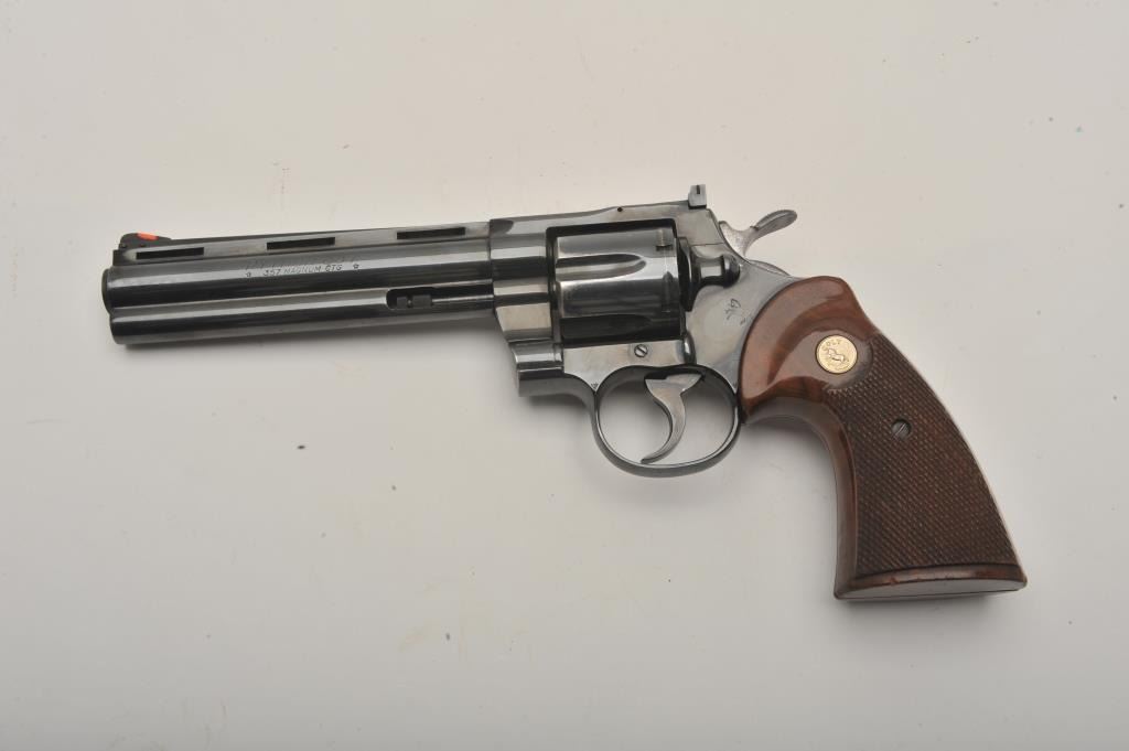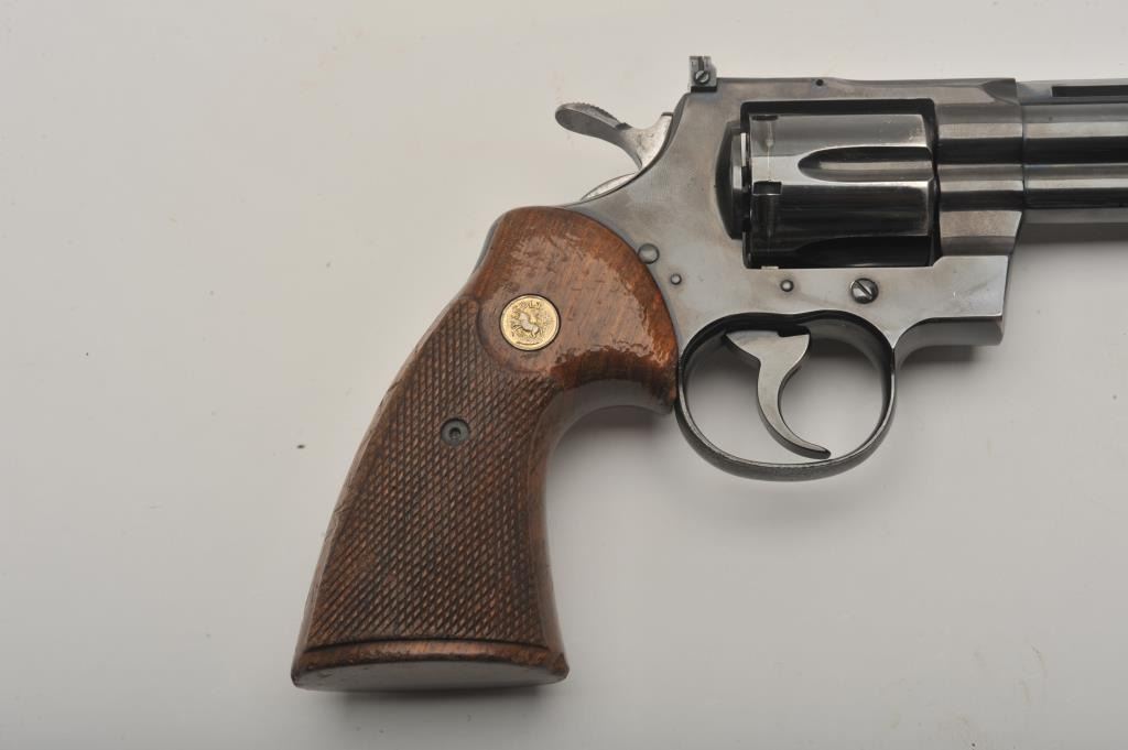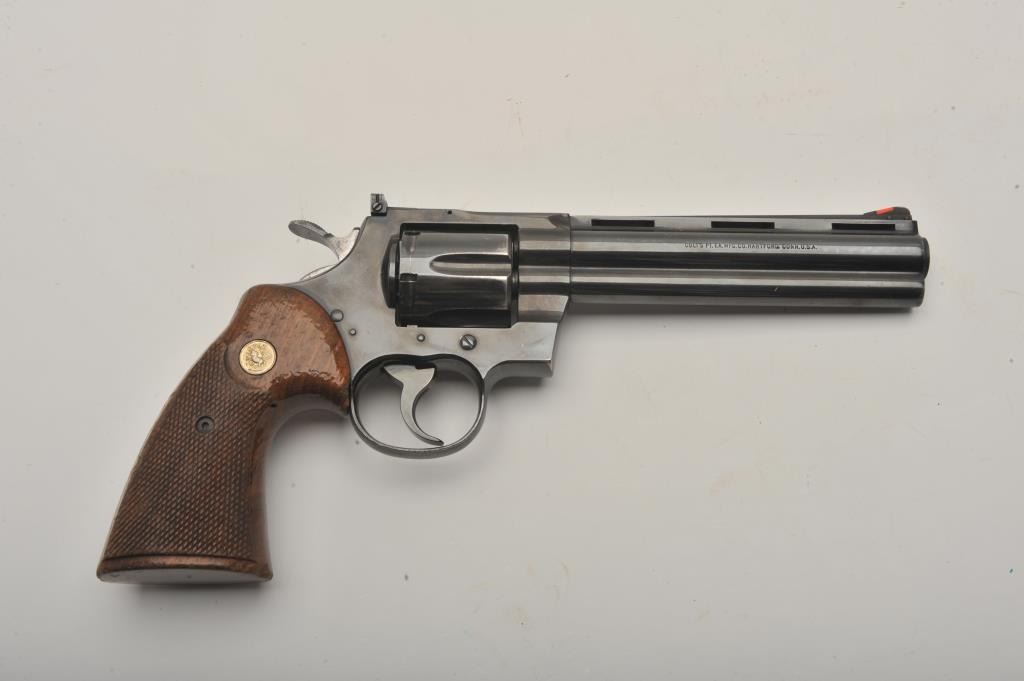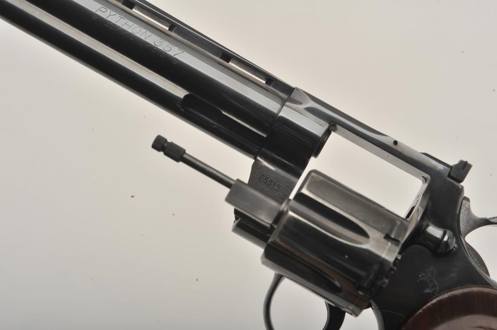 Early Colt Python DA revolver, .357 Magnum caliber, 6” ventilated rib barrel, blued finish, checkered wood medallion combat grips, S/N E5315, in overall very good + condition; 90-95% original finish to metalsurfaces, slight loss and index line on cylinder, very good to near fine bore, good grips with wear primarily to right side grip. (Modern/PPT). Est.: $1,400-$2,800.